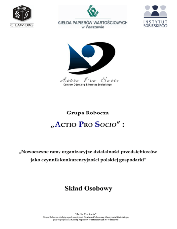 Grupa Robocza „ACTIO PRO SOCIO” : „Nowoczesne ramy organizacyjne działalności przedsiębiorców jako czynnik konkurencyjności polskiej gospodarki” Skład Osobowy “Actio Pro Socio” Grupa Robocza działająca pod auspicjami Centrum C-Law.org i Instytutu Sobieskiego, przy współpracy z Giełdą Papierów Wartościowych w Warszawie 1. Referenci/Koreferenci: Lp. Nazwisko i Imię: 1. Bąk Jacek 2. Bilewska Katarzyna Stopień naukowy: Afiliacja : Dr Noerr Stiefenhofer Lutz Dr Uniwersytet Warszawski E-mail: [email protected] [email protected] Bobrzyński Michał Uniwersytet w Heidelbergu [email protected] i Centrum C-Law.org 4. Cejmer Mirosław Dr Kubas Kos & Gaertner [email protected] i Centrum C-Law.org 5. Engeleit Małgorzata Dr 6. Gorywoda Łukasz 7. Grabowski Krzysztof 3. 8. 9. [email protected] European University [email protected] Institute Komisja Nadzoru Finansowego [email protected] [email protected] Sąd Rejonowy w Tarnowie, Wydział [email protected] Gospodarczy Miczek Zbigniew Miś Grzegorz Uniwersytet Wrocławski Dr Akademia Ekonomiczna w Krakowie [email protected] [email protected] “Actio Pro Socio” Grupa Robocza działająca pod auspicjami Centrum C-Law.org i Instytutu Sobieskiego, przy współpracy z Giełdą Papierów Wartościowych w Warszawie 10. 11. Oplustil Krzysztof Porzycki Marek Dr Uniwersytet Jagielloński [email protected] i Centrum C-Law.org Dr Uniwersytet Jagielloński [email protected] i Centrum C-Law.org Uniwersytet w Hamburgu, Centrum C-Law.org [email protected] i Instytut Sobieskiego 12. Radwan Arkadiusz Dr 13. Rogowski Wojciech Dr 14. Rozdeiczer Łukasz 15. Słomka – Gołębiowska Agnieszka Narodowy Bank Polski [email protected] Georgetown University [email protected] i Instytut Sobieskiego Dr Szkoła Główna Handlowa [email protected] Uniwersytet im. Adma Mickiewicza [email protected] i Centrum C-Law.org 16. Sójka Tomasz Dr 17. Tamowicz Piotr Dr [email protected] Dr Traple Konarski Podrecki [email protected] Kancelaria prawna 18. 19. Targosz Tomasz Wiórek Piotr Marcin Dr Uniwersytet Wrocławski [email protected] “Actio Pro Socio” Grupa Robocza działająca pod auspicjami Centrum C-Law.org i Instytutu Sobieskiego, przy współpracy z Giełdą Papierów Wartościowych w Warszawie 20. Zakrzewski Rafał Instytut Sobieskiego [email protected] Dr 2. Koordynator badań empirycznych: Lp. Nazwisko i Imię: 1. 3. Lp. 1. Stopień naukowy: Nadolska Anna Dr Afiliacja: Erasmus Universiteit Rotterdam [email protected] Asystenci/Analitycy: Nazwisko i imię Horwath Olga E-mail: Afiliacja: Uniwersytet Jagielloński 2. Jańczuk Agnieszka 3. Jóźwik Aleksander Uniwersytet Warszawski i Instytut Sobieskiego Kowalik Bartłomiej Centrum C-Law.org i Akademia Ekonomiczna w Krakowie 4. E-mail: [email protected] European University Institute [email protected] [email protected] [email protected] “Actio Pro Socio” Grupa Robocza działająca pod auspicjami Centrum C-Law.org i Instytutu Sobieskiego, przy współpracy z Giełdą Papierów Wartościowych w Warszawie 5. Lampart Marta 6. Lemańska Elżbieta Uniwersytet Jagielloński i Centrum C-Law.org Centrum C-law.org [email protected] [email protected] Mróz Dominika Uniwersytet Jagielloński i Centrum C-Law.org [email protected] 8. Nowak Kamil Uniwersytet Jagielloński i Centrum C-Law.org [email protected] 9. Stuczyńska Katarzyna 7. Centrum C-Law.org i ORA Kraków [email protected] 10. Średniawa Anna Uniwersytet Jagielloński i Centrum C-Law.org [email protected] 11. Zaremba Anna Uniwersytet Jagielloński i Centrum C-law.org [email protected] 12. Żurek Michał Uniwersytet Jagielloński [email protected] “Actio Pro Socio” Grupa Robocza działająca pod auspicjami Centrum C-Law.org i Instytutu Sobieskiego, przy współpracy z Giełdą Papierów Wartościowych w Warszawie