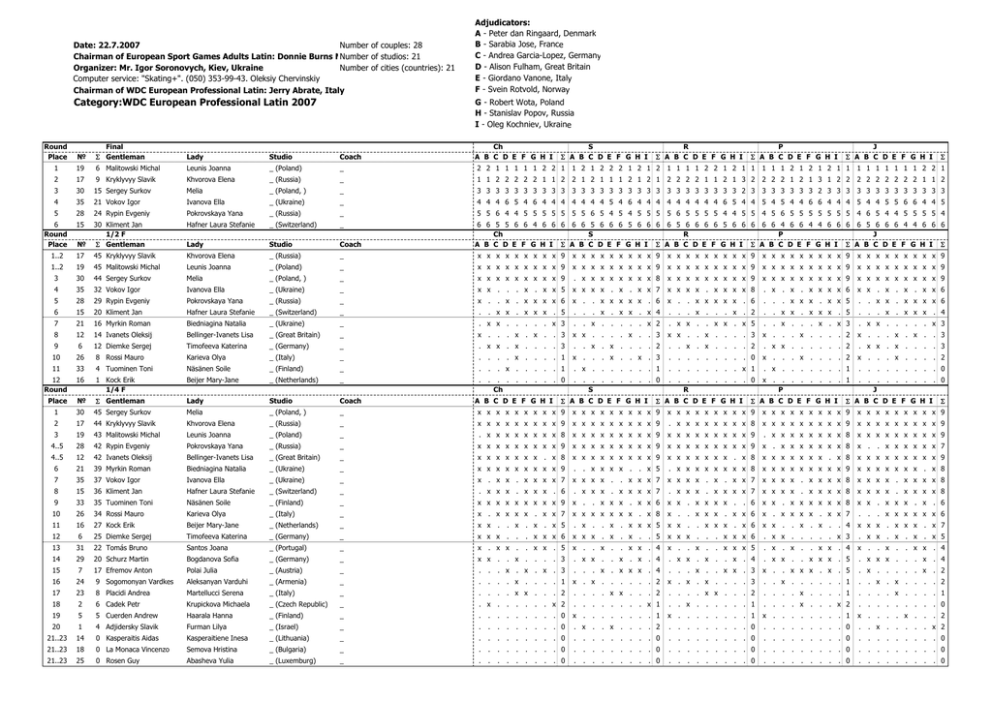 1 2 4 Date: 22.7.2007 Number of couples: 28 Chairman of European Sport Games Adults Latin: Donnie Burns MNumber of studios: 21 1 Organizer: Mr. Igor Soronovych, Kiev, Ukraine Number of cities (countries): 21 Computer service: "Skating+". (050) 353-99-43. Oleksiy Chervinskiy Катег Chairman of WDC European Professional Latin: Jerry Abrate, Italy 1 Category:WDC European Professional Latin 2007 Adjudicators: A - Peter dan Ringaard, Denmark B - Sarabia Jose, France C - Andrea Garcia-Lopez, Germany D - Alison Fulham, Great Britain E - Giordano Vanone, Italy F - Svein Rotvold, Norway G - Robert Wota, Poland H - Stanislav Popov, Russia I - Oleg Kochniev, Ukraine Round Place № Final Σ Gentleman Lady Studio Coach Ch A B C D E F G H I S Σ A B C D E F G H I R Σ A B C D E F G H I P Σ A B C D E F G H I J Σ A B C D E F G H I 1 19 6 Malitowski Michal Leunis Joanna _ (Poland) _ 2 2 1 1 1 1 1 2 2 1 1 2 1 2 2 2 1 2 1 2 1 1 1 1 2 2 1 2 1 1 1 1 1 2 1 2 1 2 1 1 1 1 1 1 1 1 1 2 2 1 2 17 9 Kryklyvyy Slavik Khvorova Elena _ (Russia) _ 1 1 2 2 2 2 2 1 1 2 2 1 2 1 1 1 2 1 2 1 2 2 2 2 1 1 2 1 3 2 2 2 2 1 2 1 3 1 2 2 2 2 2 2 2 2 2 1 1 2 3 30 15 Sergey Surkov Melia _ (Poland, ) _ 3 3 3 3 3 3 3 3 3 3 3 3 3 3 3 3 3 3 3 3 3 3 3 3 3 3 3 3 2 3 3 3 3 3 3 3 2 3 3 3 3 3 3 3 3 3 3 3 3 3 4 35 21 Vokov Igor Ivanova Ella _ (Ukraine) _ 4 4 4 6 5 4 6 4 4 4 4 4 4 4 5 4 6 4 4 4 4 4 4 4 4 4 6 5 4 4 5 4 5 4 4 6 6 4 4 4 5 4 4 5 5 6 6 4 4 5 5 28 24 Rypin Evgeniy Pokrovskaya Yana _ (Russia) _ 5 5 6 4 4 5 5 5 5 5 5 5 6 5 4 5 4 5 5 5 5 6 5 5 5 5 4 4 5 5 4 5 6 5 5 5 5 5 5 5 4 6 5 4 4 5 5 5 5 4 6 Round Place 15 Hafner Laura Stefanie _ (Switzerland) _ № 30 Kliment Jan 1/2 F Σ Gentleman Lady Studio Coach 1..2 17 45 Kryklyvyy Slavik Khvorova Elena _ (Russia) _ x x x x x x x x x 9 x x x x x x x x x 9 x x x x x x x x x 9 x x x x x x x x x 9 x x x x x x x x x 9 1..2 19 45 Malitowski Michal Leunis Joanna _ (Poland) _ x x x x x x x x x 9 x x x x x x x x x 9 x x x x x x x x x 9 x x x x x x x x x 9 x x x x x x x x x 9 3 30 44 Sergey Surkov Melia _ (Poland, ) _ x x x x x x x x x 9 . x x x x x x x x 8 x x x x x x x x x 9 x x x x x x x x x 9 x x x x x x x x x 9 4 35 32 Vokov Igor Ivanova Ella _ (Ukraine) _ x x . x x x x . x . x x 7 x x x x . x x x x 8 . x . x . x x x x 6 x x . x . x . x x 6 5 28 29 Rypin Evgeniy Pokrovskaya Yana _ (Russia) _ x . x . . x x x x x . 6 x . . x x x x x . 6 . . . x x x . x x 5 . . x x . x x x x 6 6 15 20 Kliment Jan Hafner Laura Stefanie _ (Switzerland) _ . . . . x . x x . x 4 . . x . . x . 2 . . x x . x x x . 5 . . 7 21 16 Myrkin Roman Biedniagina Natalia _ (Ukraine) _ . x x . . . x . . x x . x 5 . . x . . x x . 8 12 14 Ivanets Oleksij Bellinger-Ivanets Lisa _ (Great Britain) _ x . 9 6 12 Diemke Sergej Timofeeva Katerina _ (Germany) _ . x x . x . . 10 26 8 Rossi Mauro Karieva Olya _ (Italy) _ . . . 11 33 4 Tuominen Toni Näsänen Soile _ (Finland) _ . . . x . 12 Round 16 1 Kock Erik 1/4 F Beijer Mary-Jane _ (Netherlands) _ . . Σ 6 6 5 5 6 6 4 6 6 6 6 6 5 6 6 6 5 6 6 6 6 5 6 6 6 6 5 6 6 6 6 6 4 6 6 4 4 6 6 6 6 5 6 6 6 4 4 6 6 6 Ch S R P J A B C D E F G H I Σ A B C D E F G H I Σ A B C D E F G H I Σ A B C D E F G H I Σ A B C D E F G H I Σ . . x . x x 5 . x . x x x x 6 . x x . x x x . 5 . . . . . x 3 . x . x . . 3 x x . . . 3 . . . . 1 x . . . . . 1 . . . . 0 . x . . . Ch . . . . . . x 2 . . x . . x x . . 3 x x . . 2 . . . 3 x . . . x . x . . . . 2 . x x . . x . . x . 3 . . . . . . . . . 0 x . . x . . . . . . . 1 . . . . . . . . x 1 . . . . . . . 0 . . . R . . . . . . x . x . . . . S . . x . . . Place № Σ Gentleman Lady Studio Coach 1 30 45 Sergey Surkov Melia _ (Poland, ) _ x x x x x x x x x 9 x x x x x x x x x 9 2 17 44 Kryklyvyy Slavik Khvorova Elena _ (Russia) _ x x x x x x x x x 9 3 19 43 Malitowski Michal Leunis Joanna _ (Poland) _ . x x x x x x x x 8 4..5 28 42 Rypin Evgeniy Pokrovskaya Yana _ (Russia) _ 4..5 12 42 Ivanets Oleksij Bellinger-Ivanets Lisa _ (Great Britain) 6 21 39 Myrkin Roman Biedniagina Natalia 7 35 37 Vokov Igor Ivanova Ella 8 15 36 Kliment Jan Hafner Laura Stefanie 9 33 35 Tuominen Toni 10 26 11 A B C D E F G H I . Σ A B C D E F G H I Σ A B C D E F G H I . 0 . . . x . x 3 . . . x 3 . . 2 x . . . . . 2 . x x . x . . . . 3 . x . . . . 2 x . . . x . . . . 2 . x . . . . . . . 1 . . . . . . . . . 0 x . . . . . . . 1 . . . . . . . . . 0 . P . . . . . . x . . x . x x x . 4 . x . x . . 3 J Σ A B C D E F G H I Σ A B C D E F G H I Σ x x x x x x x x x 9 x x x x x x x x x 9 x x x x x x x x x 9 x x x x x x x x x 9 . x x x x x x x x 8 x x x x x x x x x 9 x x x x x x x x x 9 x x x x x x x x x 9 x x x x x x x x x 9 . x x x x x x x x 8 x x x x x x x x x 9 x x x x x x x x x 9 x x x x x x x x x 9 x x x x x x x x x 9 x . x x x x x x x 8 x . _ x x x x x x x . x 8 x x x x x x x x x 9 x x x x x x x . x 8 x x x x x x x . x 8 x x x x x x x x x 9 _ (Ukraine) _ x x x x x x x x x 9 . . x 5 . x x x x x x x x 8 x x x x x x x x x 9 x x x x x x x . x 8 _ (Ukraine) _ x . x x . x x x x 7 x x x x . . x x x 7 x x x x . x . x x 7 x x x x . x x x x 8 x x x x . x x x x 8 _ (Switzerland) _ . x x x . x x x . 6 . x x x . x x x x 7 . x x x . x x x x 7 x x x x . x x x x 8 x x x x . x x x x 8 Näsänen Soile _ (Finland) _ x x x x x x x x x 9 x . x x . x x x x . . 6 x x . x x x x x x 8 x x . x x x . x . 6 34 Rossi Mauro Karieva Olya _ (Italy) _ x . x x x x . x x 7 x x x x x x x . x 8 x . . x x x . x x 6 x . x x x x . x x 7 . 16 27 Kock Erik Beijer Mary-Jane _ (Netherlands) _ x x . . x . x x . x x . x x x . x x x . x 7 12 6 25 Diemke Sergej Timofeeva Katerina _ (Germany) _ x x x . . . x x x 6 x x x . x . x . 13 31 22 Tomás Bruno Santos Joana _ (Portugal) _ x . x x . . x x . 5 x . 14 29 20 Schurz Martin Bogdanova Sofia _ (Germany) _ x x . 15 7 17 Efremov Anton Polai Julia _ (Austria) _ . . . x . x . x . 3 . 16 24 9 Sogomonyan Vardkes Aleksanyan Varduhi _ (Armenia) _ . . . . x . . . . 1 x . x . . . . 2 x . x . x . 17 23 8 Placidi Andrea Martellucci Serena _ (Italy) _ . . . . x x . . . 2 . . . . x x . . . 2 . . 18 2 6 Cadek
