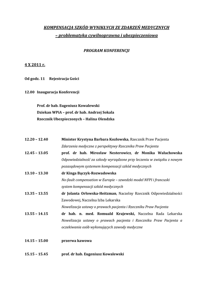 KOMPENSACJA SZKÓD WYNIKŁYCH ZE ZDARZEŃ MEDYCZNYCH – problematyka cywilnoprawna i ubezpieczeniowa PROGRAM KONFERENCJI 4 X 2011 r. Od godz. 11 Rejestracja Gości 12.00 Inauguracja Konferencji Prof. dr hab. Eugeniusz Kowalewski Dziekan WPiA – prof. dr hab. Andrzej Sokala Rzecznik Ubezpieczonych – Halina Olendzka 12.20 – 12.40 Minister Krystyna Barbara Kozłowska, Rzecznik Praw Pacjenta Zdarzenia medyczne z perspektywy Rzecznika Praw Pacjenta prof. dr hab. Mirosław Nesterowicz, dr Monika Wałachowska 12.45 – 13.05 Odpowiedzialność za szkody wyrządzone przy leczeniu w związku z nowym pozasądowym systemem kompensacji szkód medycznych 13.10 – 13.30 dr Kinga BączykRozwadowska Nofault compensation w Europie – szwedzki model NFPI i francuski 13.35 – 13.55 system kompensacji szkód medycznych dr Jolanta OrłowskaHeitzman, Naczelny Rzecznik Odpowiedzialności Zawodowej, Naczelna Izba Lekarska Nowelizacja ustawy o prawach pacjenta i Rzeczniku Praw Pacjenta 13.55 – 14.15 dr hab. n. med. Romuald Krajewski, Naczelna Rada Lekarska Nowelizacja ustawy o prawach pacjenta i Rzeczniku Praw Pacjenta a oczekiwania osób wykonujących zawody medyczne 14.15 – 15.00 przerwa kawowa 15.15 – 15.45 prof. dr hab. Eugeniusz Kowalewski Obowiązkowe ubezpieczenia pacjentów z tytułu zdarzeń medycznych – blaski i cienie 15.50 – 16.10 dr Władysław Wojciech Mogilski Ubezpieczenie pacjentów z tytułu zdarzeń medycznych a ubezpieczenie OC szpitala – koincydencja czy alternatywność płaszczyzn kompensacji? 16.15 – 17.00 DYSKUSJA 18.00 Wspólna kolacja prof. dr hab. Ewa Bagińska 5 X 2011 9.00 – 9.20 Działalność wojewódzkich komisji odszkodowawczych a wykonywanie władzy publicznej 9.25 – 9.45 mgr Michał P. Ziemiak Kompetencje wojewódzkich komisji odszkodowawczych w aspekcie konstytucyjności nowych rozwiązań prawnych 9.50 – 10.10 dr hab. Małgorzata Świderska Wymóg zgody uprawnionego a postępowanie przed wojewódzkimi komisjami odszkodowawczymi 10.10 – 10.40 przerwa kawowa 10.45 – 11.05 prof. dr hab. Ewa Bagińska, mgr Katarzyna Krupa – Lipińska Zdarzenie medyczne a problematyka przyczynowości 11.10 – 11.30 dr Marcin Śliwka Udostępnianie dokumentacji medycznej w postępowaniu przed wojewódzkimi komisjami odszkodowawczymi 11.35 – 11.55 dr Andrzej Liwacz, PZU Wpływ nowego systemu kompensacji szkód z tytułu zdarzeń medycznych na funkcjonowanie zakładów ubezpieczeń w Polsce 12.00 – 12.30 Dyskusja podsumowująca Zamknięcie Konferencji