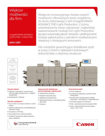Większe możliwości dla firm. imageRUNNER ADVANCE C9070 PRO / C9060 PRO you can Wstąp do innowacyjnego świata nowych możliwości oferowanych przez urządzenia do druku kolorowego z serii imageRUNNER ADVANCE PRO Light Production. Z dumą przedstawiamy nasze najnowsze i najbardziej zaawansowane moduły linii Light Production łączące wspaniałą jakość obrazów i profesjonalne funkcje wykańczania z szerokimi możliwościami integracji z istniejącymi procesami. Oto narzędzie gwarantujące dodatkowe zyski w pracy z niskimi nakładami kolorowych dokumentów o złożonej strukturze. DO 70 str./min. W KOLORZE I MONO DO WYBORU 2 RIP FIERY DRUKOWANIE 1200 DPI DUŻA POJEMNOŚĆ ZASOBNIKA PAPIERU MODUŁ WYKAŃCZANIA GRZBIETOWEGO I TRYMER KONSTRUKCJA MODUŁOWA Wysoka jakość o jednolitych i niezmiennych •Wydruki kolorach dzięki rozwiązaniom z urządzeń imagePRESS •Rozdzielczość 1200 dpi Wysoka wydajność 70 stron na minutę w kolorze i czarno•Do białych wykonywania niskonakładowych, •Łatwość złożonych zadań •Do wyboru 2 RIP Fiery •Duża pojemność zasobnika papieru •Możliwość podawania papieru podczas pracy urządzenia Wyposażenie dodatkowe do precyzyjnego wykończenia •Profesjonalny dziurkacz •Podajnik wielozadaniowy •Składarka wielozadaniowa broszur i wewnętrzny trymer •Wykańczarka jako opcja •Zszywacz Wszechstronność •Prosta integracja modułowa umożliwia różne •Konstrukcja konfiguracje gama obsługiwanych podłoży •Szeroka drukowych – powlekanych i niepowlekanych •Gramatura papieru do 300 g/m •Maks. standardowy rozmiar papieru SRA3 niestandardowy rozmiar papieru •Maks. 330,2 x 487,7 mm 2 Specyfikacja: imageRUNNER ADVANCE C9070 PRO / C9060 PRO Typ Maksymalny rozmiar oryginału Rozmiar kopii Kaseta 1.2 Kaseta 3.4 Podajnik ręczny Rozdzielczość Odczyt Kopiowanie Drukowanie Szybkość kopiowania /drukowania A4 (80 g/m2) Maks. prędkość w zależności od gramatury papieru C9070 PRO A4 A3 C9060 PRO A4 A3 Wolnostojący A3 A4 A5R-SRA3 (320 x 450 mm), 13”x19”(330 x 483 mm) A5R-SRA3 (320 x 450 mm), 13”x19”(330 x 483 mm) Dowolny rozmiar od 100 x 148 mm do 330,2 x 487,7 mm Koperty (DL, ISO-B5, ISO-C5) 600 dpi x 600 dpi 600 dpi x 600 dpi 1200 dpi x 1200 dpi Gradacja 256 kolorów C9070 PRO: 70 str./min. (czarno-biały/kolorowy) C9060 PRO: 60 str./min. (czarno-biały/kolorowy) Zwykły A4 52-105 g/m2: 70 str./ min. 106-220 g/m2: 35 str./min. 221 – 300 g/m2: 23,3 str./min. Powlekany: 106-180 g/m2: 21,6 str./min./35 str./min. zależnie od trybu 52-105 g/m2: 35 str./min. kolorowy, 37,5 str./min. czarno-biały 106-220 g/m2: 17,5 str./min. kolorowy, 18,8 str./min. czarno-biały 221 – 300 g/m2: 11,7 str./min. kolorowy, 12,5 str./min. czarno-biały Papier powlekany (106-300 g/m2) 10,8 str./min. (czarno-biały/kolorowy) Zwykły A4 52-105 g/m2: 60 str./min. 106-220 g/m2: 32,5 str./min. 221 – 300 g/m2: 21,6 str./min. Powlekany: 106-180 g/m2: 21,6 str./min./32,5 str./min. zależnie od trybu 181 – 300 g/m2: 21,6 str./min. 52-105 g/m2: 32,5 str./min. 106-220 g/m2: 16,3 str./min. 221 – 300 g/m2: 10,8 str./min. Papier powlekany (106-300 g/m2) 10,8 str./min. (czarno-biały/kolorowy) Powiększenie Czas uzyskania pierwszej kopii Czas nagrzewania Zoom 25-400% Stały 25%, 50%, 71%, 100%, 141%, 200%, 400% Tryb czarnobiały: 70 str./min.: 4,4 sek. 60 str./min.: 4,9 sek. Tryb pełnego koloru 70 str./min.: 6,0 sek. 60 str./min.: 6,6 sek. 70 str./min.: 6 minut 60 str./min.: 5 minut Urządzenie wielofunkcyjne Kopiowanie /Drukowanie Od 1 do 9999 arkuszy Drukowanie dwustronne Standardowe automatyczne bezstosowe Gramatura papieru Kaseta Od 52 g/m2 do 220 g/m2 Podajnik ręczny Od 52 g/m2 do 300 g/m2 Dwustronne Od 52 g/m2 do 220 g/m2 Pojemność papieru Standardowo 1 100 arkuszy x 2 kasety (80 g/m2) 550 arkuszy x 2 kasety (80 g/m2) Podajnik ręczny: 100 arkuszy (80 g/m2) Podajnik papieru 3 500 arkuszy, zasobnik papieru z wieloma szufladami: 6 000 arkuszy Całkowita pojemność 9 300 arkuszy Procesor 1,2 GHz Pamięć 2,5 GB Dysk twardy 80 GB Interfejs Interfejs Ethernet (1000BaseT/100Base-TX/10Base-T), Sieć bezprzewodowa LAN (IEEE802,11b/g, Opcja), USB 2.0 Zasilanie 220-240 V AC, 50 / 60 Hz Pobór mocy 3 kW maks. Wymiary (szer./dł./wys.) 1180 x 932 x 1403 mm (z 1PDS, pionowy panel sterowania) Waga Około 288 kg (z 1 PDS i pionowym panelem sterowania) imagePASS-A1 PDL Rozdzielczość Pamięć Dysk twardy Procesor Czcionki PS Czcionki PCL Obsługiwane systemy operacyjne Interfejs Protokół sieciowy PCL5c/ 6, Adobe PostScript 3 1200 dpi x 1200 dpi, 600 dpi x 600 dpi 512 MB+512 MB (Opcja) 80 GB CPU Intel Core Duo T2500 2.0 GHz 136 czcionek Adobe PS 80 czcionek Agfa Windows 2000/XP/Server2003/Server2008/Win7/Vista/ Vista SP1, Mac OSX (10.3.9 lub nowsze) Interfejs Ethernet (1000Base-T/100Base-TX/10Base-T), USB TCP/IP (LPD/Port9100/IPP/SMB/FTP), AppleTalk ColorPASS-GX300 PDL Rozdzielczość Pamięć Dysk twardy Procesor Czcionki PS Czcionki PCL Obsługiwane systemy operacyjne Interfejs Protokół sieciowy Adobe PostScript 3 1200 dpi x 1200 dpi, 600 dpi x 600 dpi 1 GB 160 GB Intel Core2 Duo Xeon E8400 2x3.0Ghz 136 czcionek Adobe PS Nie dotyczy Windows 2000/XP/Server2003/Server2008/Vista/Vista SP1, Mac OSX (10.3.9 lub nowsze) Interfejs Ethernet (1000Base-T/100Base-TX/10Base-T), USB złącze D-sub 15-pin TCP/IP (LPD/Port9100/IPP/SMB/FTP), AppleTalk Czytnik obrazów kolorowych dwustronnych-A1 Rozmiar papieru A3, A4, A4R, A5, A5R Gramatura papieru Oryginał jednostronny Od 42 g/m2 do 220 g/m2 Oryginał dwustronny Od 50 do 220 g/m2 (czarno-biały), od 64 do 220 g/m2 (kolorowy) Maks. liczba oryginałów 300 arkuszy (80 g/m2) Prędkość skanowania (maks.) Kopia (jednostronna) A4 120 obrazów/minutę 600 dpi (czarno-biała), 70 brazów/minutę 600 dpi (kolorowa) Skan (jednostronny) A4 120 obrazów/minutę 300dpi (kolorowy/czarno-biały) Kopia (dwustronna) A4 120 obrazów/minutę 600 dpi (czarno-biała), 70 obrazów/minutę 600 dpi (kolorowa) Skan (dwustro