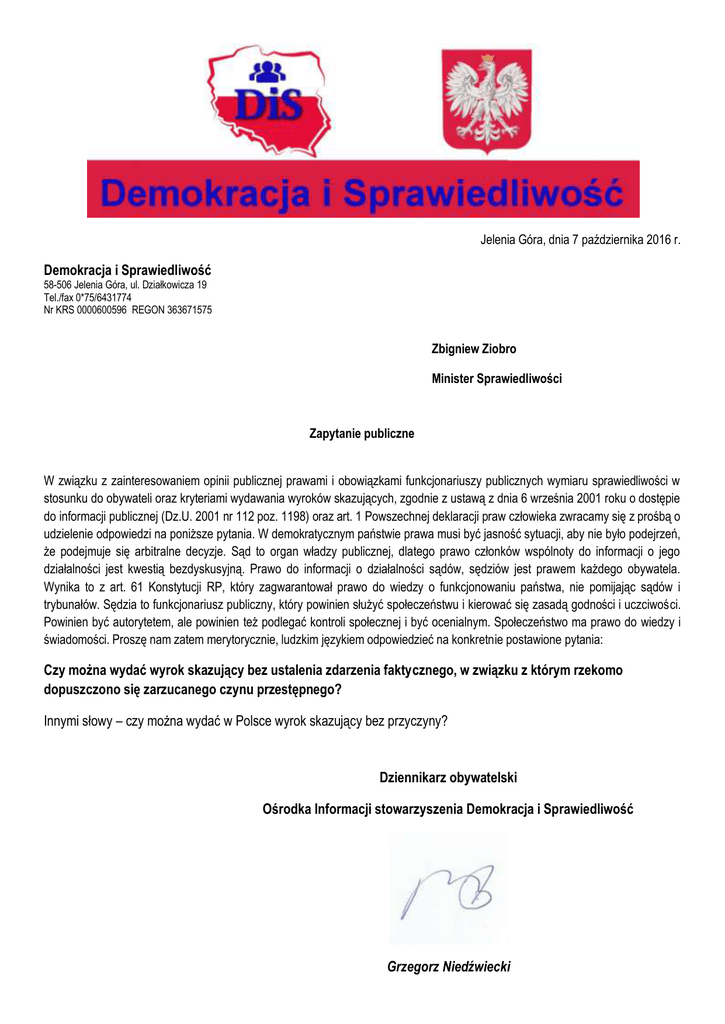 Jelenia Góra, dnia 7 października 2016 r. Demokracja i Sprawiedliwość 58-506 Jelenia Góra, ul. Działkowicza 19 Tel./fax 0*75/6431774 Nr KRS 0000600596 REGON 363671575 Zbigniew Ziobro Minister Sprawiedliwości Zapytanie publiczne W związku z zainteresowaniem opinii publicznej prawami i obowiązkami funkcjonariuszy publicznych wymiaru sprawiedliwości w stosunku do obywateli oraz kryteriami wydawania wyroków skazujących, zgodnie z ustawą z dnia 6 września 2001 roku o dostępie do informacji publicznej (Dz.U. 2001 nr 112 poz. 1198) oraz art. 1 Powszechnej deklaracji praw człowieka zwracamy się z prośbą o udzielenie odpowiedzi na poniższe pytania. W demokratycznym państwie prawa musi być jasność sytuacji, aby nie było podejrzeń, że podejmuje się arbitralne decyzje. Sąd to organ władzy publicznej, dlatego prawo członków wspólnoty do informacji o jego działalności jest kwestią bezdyskusyjną. Prawo do informacji o działalności sądów, sędziów jest prawem każdego obywatela. Wynika to z art. 61 Konstytucji RP, który zagwarantował prawo do wiedzy o funkcjonowaniu państwa, nie pomijając sądów i trybunałów. Sędzia to funkcjonariusz publiczny, który powinien służyć społeczeństwu i kierować się zasadą godności i uczciwości. Powinien być autorytetem, ale powinien też podlegać kontroli społecznej i być ocenialnym. Społeczeństwo ma prawo do wiedzy i świadomości. Proszę nam zatem merytorycznie, ludzkim językiem odpowiedzieć na konkretnie postawione pytania: Czy można wydać wyrok skazujący bez ustalenia zdarzenia faktycznego, w związku z którym rzekomo dopuszczono się zarzucanego czynu przestępnego? Innymi słowy – czy można wydać w Polsce wyrok skazujący bez przyczyny? Dziennikarz obywatelski Ośrodka Informacji stowarzyszenia Demokracja i Sprawiedliwość Grzegorz Niedźwiecki