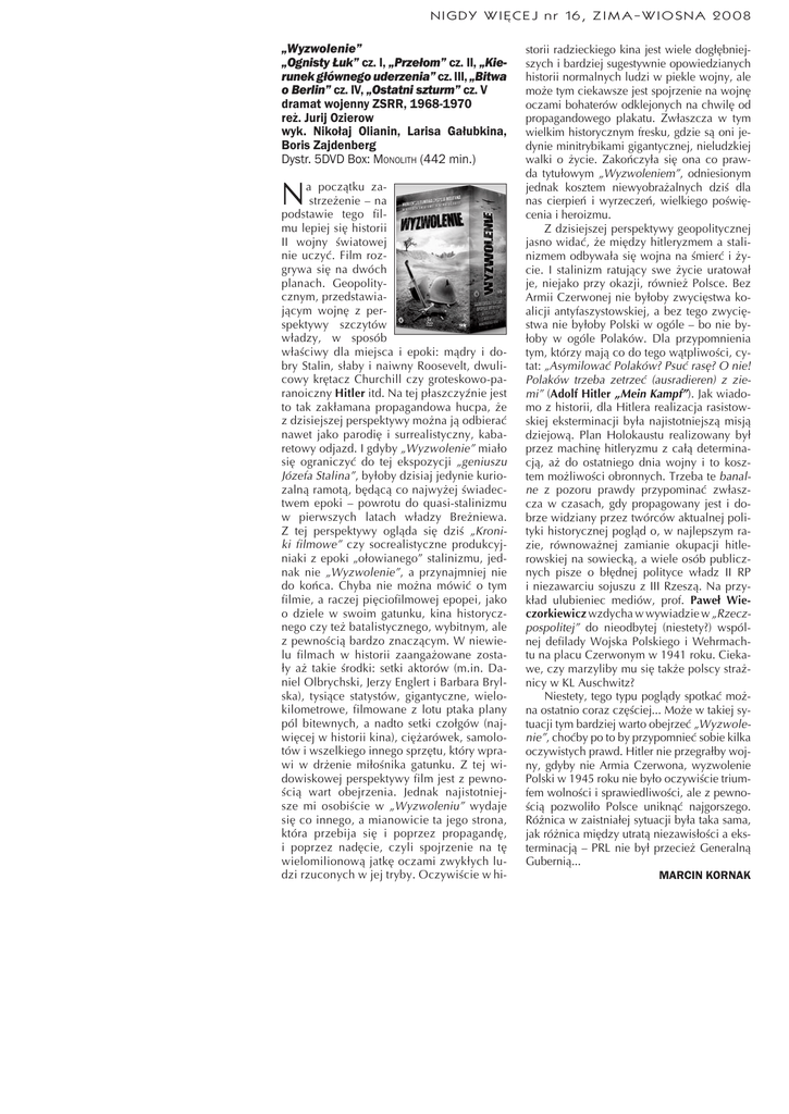 NIGDY WIĘCEJ nr 16, ZIMA-WIOSNA 2008 „Wyzwolenie” „Ognisty Łuk” cz. I, „Przełom” cz. II, „Kierunek głównego uderzenia” cz. III, „Bitwa o Berlin” cz. IV, „Ostatni szturm” cz. V dramat wojenny ZSRR, 1968-1970 reż. Jurij Ozierow wyk. Nikołaj Olianin, Larisa Gałubkina, Boris Zajdenberg Dystr. 5DVD Box: MONOLITH (442 min.) N a początku zastrzeżenie – na podstawie tego filmu lepiej się historii II wojny światowej nie uczyć. Film rozgrywa się na dwóch planach. Geopolitycznym, przedstawiającym wojnę z perspektywy szczytów władzy, w sposób właściwy dla miejsca i epoki: mądry i dobry Stalin, słaby i naiwny Roosevelt, dwulicowy krętacz Churchill czy groteskowo-paranoiczny Hitler itd. Na tej płaszczyźnie jest to tak zakłamana propagandowa hucpa, że z dzisiejszej perspektywy można ją odbierać nawet jako parodię i surrealistyczny, kabaretowy odjazd. I gdyby „Wyzwolenie” miało się ograniczyć do tej ekspozycji „geniuszu Józefa Stalina”, byłoby dzisiaj jedynie kuriozalną ramotą, będącą co najwyżej świadectwem epoki – powrotu do quasi-stalinizmu w pierwszych latach władzy Breżniewa. Z tej perspektywy ogląda się dziś „Kroniki filmowe” czy socrealistyczne produkcyjniaki z epoki „ołowianego” stalinizmu, jednak nie „Wyzwolenie”, a przynajmniej nie do końca. Chyba nie można mówić o tym filmie, a raczej pięciofilmowej epopei, jako o dziele w swoim gatunku, kina historycznego czy też batalistycznego, wybitnym, ale z pewnością bardzo znaczącym. W niewielu filmach w historii zaangażowane zostały aż takie środki: setki aktorów (m.in. Daniel Olbrychski, Jerzy Englert i Barbara Brylska), tysiące statystów, gigantyczne, wielokilometrowe, filmowane z lotu ptaka plany pól bitewnych, a nadto setki czołgów (najwięcej w historii kina), ciężarówek, samolotów i wszelkiego innego sprzętu, który wprawi w drżenie miłośnika gatunku. Z tej widowiskowej perspektywy film jest z pewnością wart obejrzenia. Jednak najistotniejsze mi osobiście w „Wyzwoleniu” wydaje się co innego, a mianowicie ta jego strona, która przebija się i poprzez propagandę, i poprzez nadęcie, czyli spojrzenie na tę wielomilionową jatkę oczami zwykłych ludzi rzuconych w jej tryby. Oczywiście w hi- storii radzieckiego kina jest wiele dogłębniejszych i bardziej sugestywnie opowiedzianych historii normalnych ludzi w piekle wojny, ale może tym ciekawsze jest spojrzenie na wojnę oczami bohaterów odklejonych na chwilę od propagandowego plakatu. Zwłaszcza w tym wielkim historycznym fresku, gdzie są oni jedynie minitrybikami gigantycznej, nieludzkiej walki o życie. Zakończyła się ona co prawda tytułowym „Wyzwoleniem”, odniesionym jednak kosztem niewyobrażalnych dziś dla nas cierpień i wyrzeczeń, wielkiego poświęcenia i heroizmu. Z dzisiejszej perspektywy geopolitycznej jasno widać, że między hitleryzmem a stalinizmem odbywała się wojna na śmierć i życie. I stalinizm ratujący swe życie uratował je, niejako przy okazji, również Polsce. Bez Armii Czerwonej nie byłoby zwycięstwa koalicji antyfaszystowskiej, a bez tego zwycięstwa nie byłoby Polski w ogóle – bo nie byłoby w ogóle Polaków. Dla przypomnienia tym, którzy mają co do tego wątpliwości, cytat: „Asymilować Polaków? Psuć rasę? O nie! Polaków trzeba zetrzeć (ausradieren) z ziemi” (Adolf Hitler „Mein Kampf”). Jak wiadomo z historii, dla Hitlera realizacja rasistowskiej eksterminacji była najistotniejszą misją dziejową. Plan Holokaustu realizowany był przez machinę hitleryzmu z całą determinacją, aż do ostatniego dnia wojny i to kosztem możliwości obronnych. Trzeba te banalne z pozoru prawdy przypominać zwłaszcza w czasach, gdy propagowany jest i dobrze widziany przez twórców aktualnej polityki historycznej pogląd o, w najlepszym razie, równoważnej zamianie okupacji hitlerowskiej na sowiecką, a wiele osób publicznych pisze o błędnej polityce władz II RP i niezawarciu sojuszu z III Rzeszą. Na przykład ulubieniec mediów, prof. Paweł Wieczorkiewicz wzdycha w wywiadzie w „Rzeczpospolitej” do nieodbytej (niestety?) wspólnej defilady Wojska Polskiego i Wehrmachtu na placu Czerwonym w 1941 roku. Ciekawe, czy marzyliby mu się także polscy strażnicy w KL Auschwitz? Niestety, tego typu poglądy spotkać można ostatnio coraz częściej... Może w takiej sytuacji tym bardziej warto obejrzeć „Wyzwolenie”, choćby po to by przypomnieć sobie kilka oczywistych prawd. Hitler nie przegrałby wojny, gdyby nie Armia Czerwona, wyzwolenie Polski w 1945 roku nie było oczywiście triumfem wolności i sprawiedliwości, ale z pewnością pozwoliło Polsce uniknąć najgorszego. Różnica w zaistniałej sytuacji była taka sama, jak różnica między utratą niezawisłości a eksterminacją – PRL nie był przecież Generalną Gubernią... MARCIN KORNAK