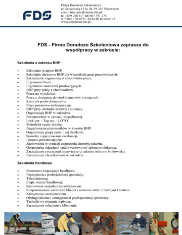 FDS Firma Doradczo Szkoleniowa ul. Senatorska 15 m 10, 58-316 Wałbrzych email: [email protected] tel.: 669 268 417 lub 607 391 274 NIP 886 150 6975; REGON 891498122 www.szkolenia-fds.pl FDS - Firma Doradczo Szkoleniowa zaprasza do współpracy w zakresie: Szkolenia z zakresu BHP Szkolenia wstępne BHP. Szkolenia okresowe BHP dla wszystkich grup pracowniczych. Zarządzanie ergonomią w środowisku pracy. Ergonomia biura. Ergonomia stanowisk produkcyjnych. BHP przy pracy z chemikaliami. Prace na wysokości. Praca z dostępem do stref elementów wirujących. Kontrola podwykonawców. Prace pożarowo niebezpieczne. BHP przy obsłudze żurawia i suwnicy. Organizacja BHP w zakładzie. Postepowanie w sytuacji wypadkowej. Lock out – Tag out – LOTO. Metodyka oceny ryzyka. Angażowanie pracowników w kwestie BHP. Organizacja grupy ppoż. i jej działanie. Sposoby organizowania ewakuacji. I pomoc przedmedyczna. Zachowania w sytuacji zagrożenia chorobą zakaźną. Gospodarka odpadami opakowaniowymi/ opłata produktowa. Zarządzanie sytuacjami awaryjnymi z zakresu ochrony środowiska. Zarządzanie chemikaliami w zakładzie. Szkolenia handlowe Biznesowe negocjacje handlowe. Umiejętności profesjonalnej sprzedaży. Telemarketing. Etapy wizyty handlowej. Kierowanie zespołem sprzedażowym Rozpoznawanie zachowań klienta i radzenie sobie z trudnym klientem. Zarządzanie asortymentem. Obsługa klienta i umiejętności profesjonalnej sprzedaży. Techniki wywierania wpływu. Zarządzanie relacjami z klientami. FDS Firma Doradczo Szkoleniowa ul. Senatorska 15 m 10, 58-316 Wałbrzych email: [email protected] tel.: 669 268 417 lub 607 391 274 NIP 886 150 6975; REGON 891498122 www.szkolenia-fds.pl Szkolenia biznesowe Umiejętności menagerskie: diagnoza i rozwój potencjału. Coaching: Diagnoza i rozwiązywanie problemów. Trening antystresowy. Budowanie zespołu. Techniki zarządzania czasem. Techniki przywództwa. Motywowanie pracowników. Zarządzanie konfliktem. Zarządzanie zmianą. Autoprezentacja i wystąpienia publiczne. Inteligencja emocjonalna. Trening kreatywności. Umiejętność organizacji pracy. Zarządzanie małą firmą. Komunikacja i asertywność. Efektywne prowadzenie szkoleń i prezentacji. Kursy komputerowe Obsługa komputera od podstaw (Windows XP, Vista, 7, MS Office, multimedia ,poczta, internet – IE8, FireFox,Opera). Obsługa programów MS Office od podstaw (Word, Excel, Power Point). Word od podstaw. Excel od podstaw. Power Point od podstaw. Access od podstaw. Outlook od podstaw. Word dla średniozaawansowanych. Excel dla średniozaawansowanych. Power Point dla średniozaawansowanych. Access dla średniozaawansowanych. Word dla zaawansowanych. Excel dla zaawansowanych. Power Point dla zaawansowanych. Access dla zaawansowanych. Szkolenia kadrowe Prowadzenie rozmów oceniających i motywujących. Kodeks pracy bez tajemnic. Dyscyplina w firmie. Zarządzanie szkoleniami. Tworzenie procedur antymobingowych i antydyskryminacyjnych w zakładzie pracy. FDS Firma Doradczo Szkoleniowa ul. Senatorska 15 m 10, 58-316 Wałbrzych email: [email protected] tel.: 669 268 417 lub 607 391 274 NIP 886 150 6975; REGON 891498122 www.szkolenia-fds.pl Podnoszenie kwalifikacji zawodowych. Zakładowy Fundusz Świadczeń Socjalnych. Przełożony – tego trzeba się uczyć. Integracja w firmie. Szkolenia jakościowe Zasady wdrażania systemu zintegrowanego ISO 9001, ISO 14001 i OHSAS / PN-N-18001. Wewnętrzny audytor systemu zintegrowanego ISO 9001, ISO 14001 i OHSAS /PN-N-18001. Doskonalenie umiejętności audytowania - Prowadzenie rozmowy, analizowanie wyników i raportowanie. Doskonalenie umiejętności audytowania - Psychologiczne aspekty w procesie audytowania systemów zarządzania Wymagania prawne z zakresu ochrony środowiska. Techniki wspomagające zarządzanie (KAIZEN, 5S, SMED, KANBAN). Techniki identyfikacji i oceny aspektów środowiskowych (ISO 14001). Sterowanie operacyjne w ISO 14001 - gospodarka odpadami, substancje chemiczne, kryteria doboru dostawców Sterowanie operacyjne w OHSAS/ PN-N-18001 - PTW, LOTO, PPE, kontrola podwykonawców. Gotowość na awarie w ISO 14001 i OHSAS/PN-N-18001 - identyfikowanie zagrożeń, działania zapobiegawcze, reagowanie na awarię, działania korygujące, techniki organizacji próbnych alarmów ewakuacyjnych. Ponadto Konsulting i nadzór z zakresu ochrony ppoż. Nadzór BHP. Szkolenia/ kursy z tematyki wskazanej przez klienta. Audyty i wskazywanie akcji korekcyjnych w zarządzaniu. Identyfikacja wymagań prawnych w zakresie ochrony środowiska, BHP, ppoż. Uwagi ogólne Firma FDS jest jednostką która ceni sobie elastyczność i współpracę, dlatego oferta nasza zawsze pozostaje otwarta na potrzeby i wskazania klientów. Zapraszamy do współpracy. Zespół FDS