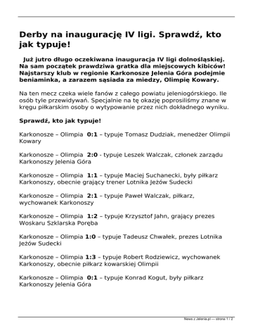 Derby na inaugurację IV ligi. Sprawdź, kto jak typuje! Już jutro długo oczekiwana inauguracja IV ligi dolnośląskiej. Na sam początek prawdziwa gratka dla miejscowych kibiców! Najstarszy klub w regionie Karkonosze Jelenia Góra podejmie beniaminka, a zarazem sąsiada za miedzy, Olimpię Kowary. Na ten mecz czeka wiele fanów z całego powiatu jeleniogórskiego. Ile osób tyle przewidywań. Specjalnie na tę okazję poprosiliśmy znane w kręgu piłkarskim osoby o wytypowanie przez nich dokładnego wyniku. Sprawdź, kto jak typuje! Karkonosze – Olimpia 0:1 – typuje Tomasz Dudziak, menedżer Olimpii Kowary Karkonosze – Olimpia 2:0 - typuje Leszek Walczak, członek zarządu Karkonoszy Jelenia Góra Karkonosze – Olimpia 1:1 – typuje Maciej Suchanecki, były piłkarz Karkonoszy, obecnie grający trener Lotnika Jeżów Sudecki Karkonosze – Olimpia 2:1 – typuje Paweł Walczak, piłkarz, wychowanek Karkonoszy Karkonosze – Olimpia 1:2 – typuje Krzysztof Jahn, grający prezes Woskaru Szklarska Poręba Karkonosze – Olimpia 1:0 – typuje Tadeusz Chwałek, prezes Lotnika Jeżów Sudecki Karkonosze – Olimpia 1:3 – typuje Robert Rodziewicz, wychowanek Karkonoszy, obecnie piłkarz kowarskiej Olimpii Karkonosze – Olimpia 0:1 – typuje Konrad Kogut, były piłkarz Karkonoszy Jelenia Góra News z Jelenia.pl — strona 1 / 2 Karkonosze – Olimpia 1:1 – typuje Bartosz Chrząszcz, wychowanek Karkonoszy, ostatnio piłkarz Olimpii Kowary Karkonosze – Olimpia 2:1 – typuje Marek Obrębalski, były Prezydent Jeleniej Góry, kibic piłkarski Karkonosze – Olimpia 2:1 – typuje Krzysztof Gierasimuk, trener grup młodzieżowych Chojnika, wieloletni kibic Karkonoszy Karkonosze - Olimpia 2:2 - typuje Bartosz Gęca, były zawodnik Karkonoszy, obecnie piłkarz Lotnika Jeżów Sudecki Karkonosze – Olimpia 1:1 – typuje Bartosz Wiatrzyk, kowarzanin, trener grup młodzieżowych Olimpii, ostatnio członek zarządu Karkonoszy Karkonosze – Olimpia 1:2 – typuje Tomasz Palimąka, wychowanek Karkonoszy, zawodnik Lotnika Jeżów Sudecki Karkonosze – Olimpia 2:1 - typuje Bartłomiej Sender, były golkiper Karkonoszy Jelenia Góra Początek środowego spotkania przy ul. Lubańskiej godz. 17:00. Wstęp na mecz wynosi 5zł. Kasy biletowe czynne będą już od godz. 16:00. Link do oryginalnej publikacji: http://jelenia.pl/Derby_na_inauguracje_IV_ligi_Sprawdz_kto_jak_typuje_ n825.html Wygenerowano: 04/03/2017 08:09:09 © Jelenia.pl News z Jelenia.pl — strona 2 / 2 Powered by TCPDF (www.tcpdf.org)