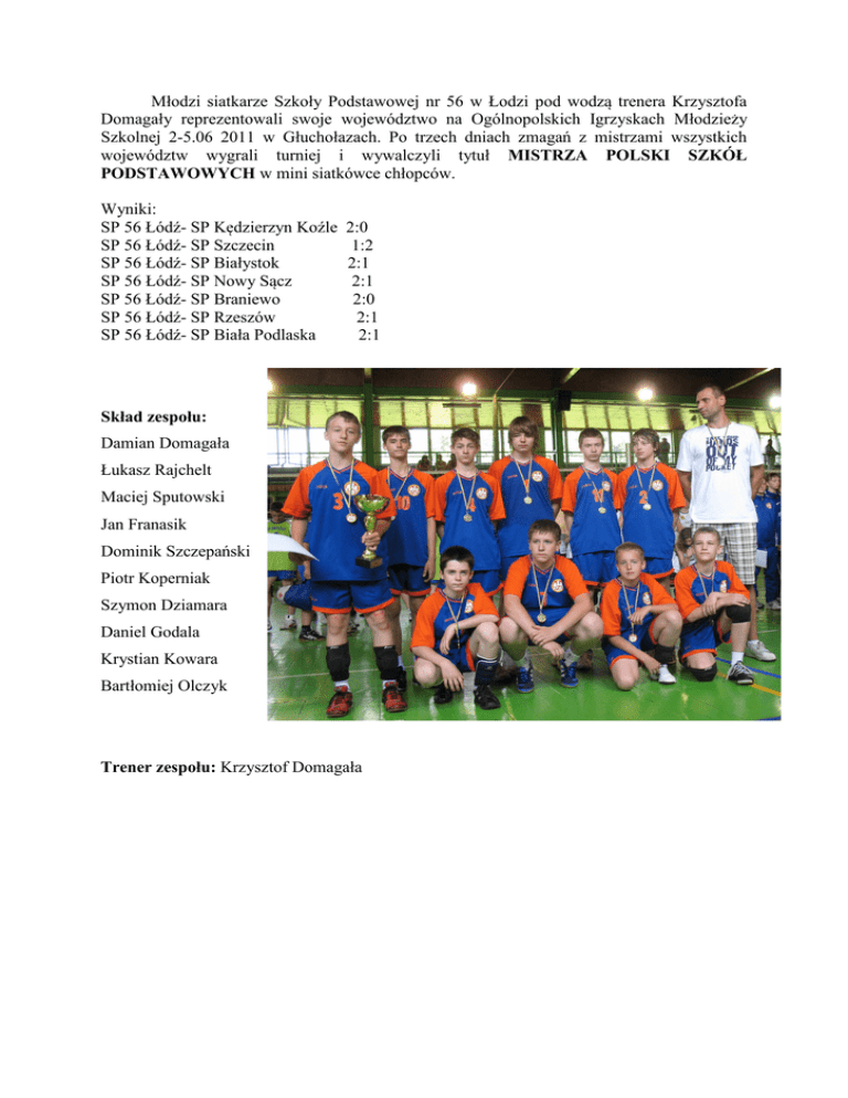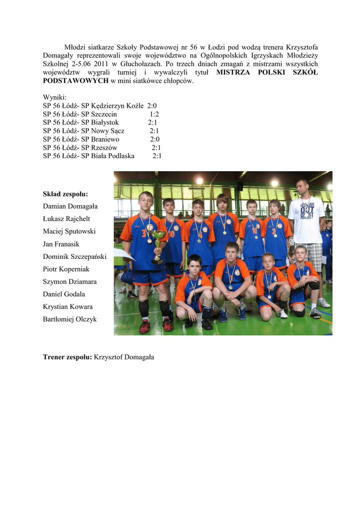 Młodzi siatkarze Szkoły Podstawowej nr 56 w Łodzi pod wodzą trenera Krzysztofa Domagały reprezentowali swoje województwo na Ogólnopolskich Igrzyskach Młodzieży Szkolnej 2-5.06 2011 w Głuchołazach. Po trzech dniach zmagań z mistrzami wszystkich województw wygrali turniej i wywalczyli tytuł MISTRZA POLSKI SZKÓŁ PODSTAWOWYCH w mini siatkówce chłopców. Wyniki: SP 56 Łódź- SP Kędzierzyn Koźle SP 56 Łódź- SP Szczecin SP 56 Łódź- SP Białystok SP 56 Łódź- SP Nowy Sącz SP 56 Łódź- SP Braniewo SP 56 Łódź- SP Rzeszów SP 56 Łódź- SP Biała Podlaska 2:0 1:2 2:1 2:1 2:0 2:1 2:1 Skład zespołu: Damian Domagała Łukasz Rajchelt Maciej Sputowski Jan Franasik Dominik Szczepański Piotr Koperniak Szymon Dziamara Daniel Godala Krystian Kowara Bartłomiej Olczyk Trener zespołu: Krzysztof Domagała