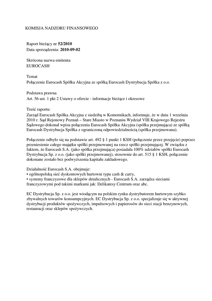 KOMISJA NADZORU FINANSOWEGO Raport bieżący nr 52/2010 Data sporządzenia: 2010-09-02 Skrócona nazwa emitenta EUROCASH Temat Połączenie Eurocash Spółka Akcyjna ze spółką Eurocash Dystrybucja Spółka z o.o. Podstawa prawna Art. 56 ust. 1 pkt 2 Ustawy o ofercie - informacje bieżące i okresowe Treść raportu: Zarząd Eurocash Spółka Akcyjna z siedzibą w Komornikach, informuje, że w dniu 1 września 2010 r. Sąd Rejonowy Poznań – Stare Miasto w Poznaniu Wydział VIII Krajowego Rejestru Sądowego dokonał wpisu połączenia Eurocash Spółka Akcyjna (spółka przejmująca) ze spółką Eurocash Dystrybucja Spółka z ograniczoną odpowiedzialnością (spółka przejmowana). Połączenie odbyło się na podstawie art. 492 § 1 punkt 1 KSH (połączenie przez przejęcie) poprzez przeniesienie całego majątku spółki przejmowanej na rzecz spółki przejmującej. W związku z faktem, że Eurocash S.A. (jako spółka przejmująca) posiadała 100% udziałów spółki Eurocash Dystrybucja Sp. z o.o. (jako spółki przejmowanej), stosownie do art. 515 § 1 KSH, połączenie dokonane zostało bez podwyższenia kapitału zakładowego. Działalność Eurocash S.A. obejmuje: • ogólnopolską sieć dyskontowych hurtowni typu cash & carry, • systemy franczyzowe dla sklepów detalicznych - Eurocash S.A. zarządza sieciami franczyzowymi pod takimi markami jak: Delikatesy Centrum oraz abc. EC Dystrybucja Sp. z o.o. jest wiodącym na polskim rynku dystrybutorem hurtowym szybko zbywalnych towarów konsumpcyjnych. EC Dystrybucja Sp. z o.o. specjalizuje się w aktywnej dystrybucji produktów spożywczych, impulsowych i papierosów do sieci stacji benzynowych, restauracji oraz sklepów spożywczych.