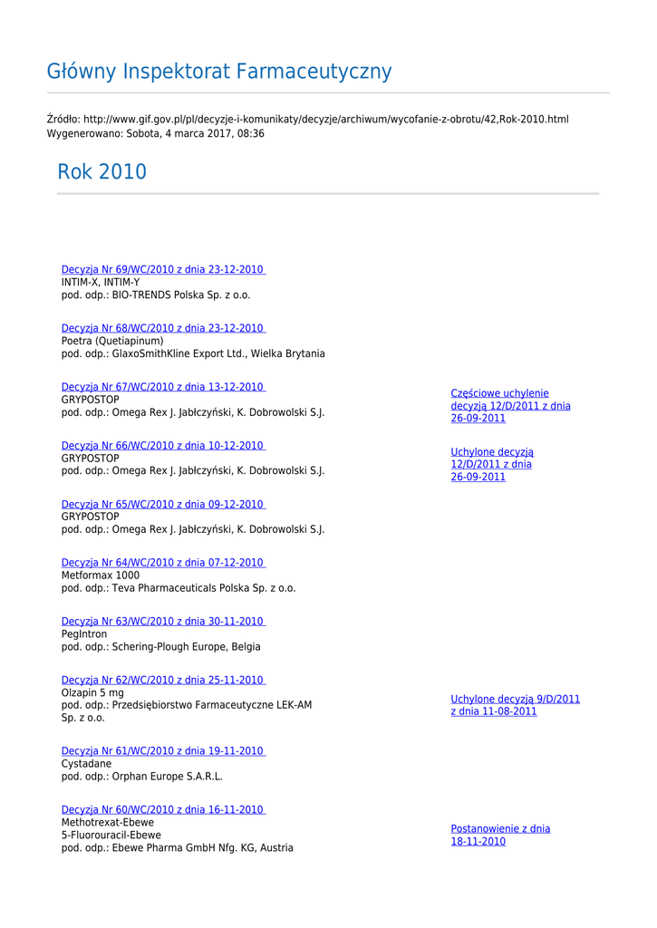 Główny Inspektorat Farmaceutyczny Źródło: http://www.gif.gov.pl/pl/decyzje-i-komunikaty/decyzje/archiwum/wycofanie-z-obrotu/42,Rok-2010.html Wygenerowano: Sobota, 4 marca 2017, 08:36 Rok 2010 Decyzja Nr 69/WC/2010 z dnia 23-12-2010 INTIM-X, INTIM-Y pod. odp.: BIO-TRENDS Polska Sp. z o.o. Decyzja Nr 68/WC/2010 z dnia 23-12-2010 Poetra (Quetiapinum) pod. odp.: GlaxoSmithKline Export Ltd., Wielka Brytania Decyzja Nr 67/WC/2010 z dnia 13-12-2010 GRYPOSTOP pod. odp.: Omega Rex J. Jabłczyński, K. Dobrowolski S.J. Decyzja Nr 66/WC/2010 z dnia 10-12-2010 GRYPOSTOP pod. odp.: Omega Rex J. Jabłczyński, K. Dobrowolski S.J. Częściowe uchylenie decyzją 12/D/2011 z dnia 26-09-2011 Uchylone decyzją 12/D/2011 z dnia 26-09-2011 Decyzja Nr 65/WC/2010 z dnia 09-12-2010 GRYPOSTOP pod. odp.: Omega Rex J. Jabłczyński, K. Dobrowolski S.J. Decyzja Nr 64/WC/2010 z dnia 07-12-2010 Metformax 1000 pod. odp.: Teva Pharmaceuticals Polska Sp. z o.o. Decyzja Nr 63/WC/2010 z dnia 30-11-2010 PegIntron pod. odp.: Schering-Plough Europe, Belgia Decyzja Nr 62/WC/2010 z dnia 25-11-2010 Olzapin 5 mg pod. odp.: Przedsiębiorstwo Farmaceutyczne LEK-AM Sp. z o.o. Uchylone decyzją 9/D/2011 z dnia 11-08-2011 Decyzja Nr 61/WC/2010 z dnia 19-11-2010 Cystadane pod. odp.: Orphan Europe S.A.R.L. Decyzja Nr 60/WC/2010 z dnia 16-11-2010 Methotrexat-Ebewe 5-Fluorouracil-Ebewe pod. odp.: Ebewe Pharma GmbH Nfg. KG, Austria Postanowienie z dnia 18-11-2010 Decyzja Nr 59/WC/2010 z dnia 15-11-2010 Velcade pod. odp.: Janssen-Cilag International NV Decyzja Nr 58/WC/2010 z dnia 29-10-2010 Ostodronic, tabletki pod. odp.: Apotex Europe BV, Holondia Decyzja Nr 57/WC/2010 z dnia 29-10-2010 Vimpat, syrop pod. odp.: UCB Pharma SA, Belgia Decyzja Nr 56/WC/2010 z dnia 28-10-2010 PegIntron 80 PegIntron 100 PegIntron 150 µg pod. odp.: Schering-Plough Europe, Belgia. Decyzja Nr 55/WC/2010 z dnia 28-10-2010 Liść melisy, zioła do zaparzania w saszetkach pod. odp.: Herbalux Sp. z o.o. Decyzja Nr 54/WC/2010 z dnia 28-10-2010 Avandia tabletki powlekane 4 mg Avandia tabletki powlekane 8 mg pod. odp.: SmithKline Beechem Ltd Decyzja Nr 53/WC/2010 z dnia 22-10-2010 Neospasmina, syrop, 119 ml numer serii: 01072010, data ważności 07.2013; pod. odp.:Herbapol - Lublin S.A . Decyzja Nr 52/WC/2010 z dnia 22-10-2010 Koszyczek arniki, zioła do zaparzania numer serii: 370910, data ważności 09.2011; pod. odp.: Herbalux Sp. z o.o.. Decyzja Nr 51/WC/2010 z dnia 21-10-2010 Efferalgan forte, tabletki musujące, 1 g numer serii: M5012, data ważności 06.2013; pod. odp.: Bristol-Myers Squibb Polska Sp. z o.o. Decyzja Nr 50/WC/2010 z dnia 21-10-2010 Omeprazol Teva, proszek do sporządzania roztworu do infuzji, 40 mg numer serii: H016, data ważności: 04.2012; pod. odp.: Teva Pharmaceuticals Polska Sp. z o.o. Decyzja Nr 49/WC/2010 z dnia 21-10-2010 Pantoprazol Sandoz, proszek do sporządzania roztworu do wstrzykiwań, 40 mg, 1 fiolka numer serii: AP9318, data ważności: 06.2011; numer serii: AS2330, data ważności: 07.2011; numer serii: AS6636, data ważności: 07.2011; pod. odp.: Sandoz GmbH Uchylone decyzją 3/D/2011 z dnia 15-03-2011 Decyzja Nr 48/WC/2010 z dnia 19-10-2010 Roztwór glukozy 5% Baxter Sodu chlorek 0,9% Baxter pod. odp.: Baxter Polska Sp. z o.o. Decyzja Nr 47/WC/2010 z dnia 18-10-2010 Nebitrix pod. odp.: Medicamenta a.s., Belohorska 39/260, 169 00 Praga 6, Republika Czeska Decyzja Nr 46/WC/2010 z dnia 05-10-2010 METIZOL pod. odp.: ICN Polfa Rzeszów S.A. Decyzja Nr 45/WC/2010 z dnia 04-10-2010 Co-Bespres pod. odp.: Teva Pharmaceuticals Polska Sp. z o.o. Decyzja Nr 44/WC/2010 z dnia 30-09-2010 Diphereline SR 3,75 Diphereline SR 11,25 mg pod. odp.: Ipsen Pharma, Francja Decyzja Nr 43/WC/2010 z dnia 17-09-2010 ALLERGOVIT B trawy 60% żyto 40% stężenie podtrzymujące - 1 fiolka 3 ml numer serii: J0549828-B, nr ref. 100186153 podmiot: Allergopharma Joachim Ganzer KG Niemcy Decyzja Nr 41/WC/2010 z dnia 09-09-2010 Deprexolet, tabletki powlekane, 30 mg podmiot: Pabianickie Zakłady Farmaceutyczne Polfa SA, ul. marsz. J.Piłsudskiego 5, 95-200 Pabianice Decyzja Nr 40/WC/2010 z dnia 09-09-2010 CEEDRA, kapsułki podmiot: Vita Vartis Polska Sp. z o.o., ul. Fizylierów 20A, 04-497 Warszawa Decyzja Nr 39/WC/2010 z dnia 08-09-2010 Vigantol, krople doustne, roztwór, 500 mcg/ml (20000 j.m./ml) podmiot: Merck KGaA, Darmstadt, Niemcy Decyzja Nr 38/WC/2010 z dnia 03-09-2010 LIBIDOForte podmiot: Natural Supplements Sp. z o.o., ul. Łucka 15/2405, 00-842 Warszawa Decyzja Nr 37/WC/2010 z dnia 27-08-2010 SATIBO podmiot: RTC Rybak Trade Company, Healthcare and Food Division, ul. Bema 65, 01-244 Warszawa Decyzja Nr 36/WC/2010 z dnia 27-08-2010 OCTAGAM roztwór do infuzji 10 g/200 ml pod. odp.: Octapharma (IP) Ltd. Uchylone decyzją 2/D/2011 z dnia 20-01-2011 Decyzja Nr 35/WC/2010 z dnia 19-08-2010 Sandoglobulin P pod. odp.: Imed Poland Sp. z o.o. Decyzja Nr 34/WC/2010 z dnia 06-08-2010 Epitrigine pod. odp.: +pharma arzneimittel gmbh, Hafnerstraße 211, A-8054 Graz, Austria Decyzja Nr 33/WC/2010 z dnia 05-08-2010 Bactrim (200 mg + 40 mg)/5 ml syrop pod. odp.: Roche Polska. Decyzja Nr 32/WC/2010 z dnia 05-08-2010 Iporel pod. odp.: Przedsiębiorstwo Farmaceutyczne Jelfa S.A., Jelenia Góra Decyzja Nr 31/WC/2010 z dnia 13-07-2010 Apo-Naproxen 250 pod. odp.: Apotex Europe B.V. Decyzja Nr 30/WC/2010 z dnia 24-06-2010 Bioprazol Bio 10 mg pod. odp.: Biofarm Sp. z o.o. Uchylone decyzją 7/D/2011 z dnia 14-06-2011 Decyzja Nr 29/WC/2010 z dnia 21-06-2010 Lanvis 40 mg pod. odp.: GlaxoSmithKline Export Ltd., Wielka Brytania Decyzja Nr 28/WC/2010 z dnia 18-06-2010 Xenna pod. odp.: US Pharmacia Sp. z o.o. Decyzja Nr 27/WC/2010 z dnia 18-06-2010 Glucosum 5% pod. odp.: Fresenius Kabi, Hiszpania Decyzja Nr 26/WC/2010 z dnia 31-05-2010 Corectin 10 pod. odp.: Biofarm Sp. z o.o., Poznań Decyzja Nr 25/WC/2010 z dnia 25-05-2010 Flukonazol pod. odp.: Claris Lifesciences UK Limited, Wielka Brytania Decyzja Nr 24/WC/2010 z dnia 24-05-2010 VITACON pod. odp.: Warszawskie Zakłady Farmaceu
