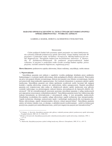 BADANIE OPINII PACJENTÓW NA TEMAT ĝWIADCZEē PODSTAWOWEJ OPIEKI ZDROWOTNEJ – WYBRANE ASPEKTY GABRIELA MAREK, DOROTA JACHIMOWICZ-WOŁOSZYNEK Streszczenie Celem podjĊtych badaĔ było poznanie opinii pacjentów na temat funkcjonowania wybranej jednostki podstawowej opieki zdrowotnej. GrupĊ badaną stanowiło 88 pacjentów w podeszłym wieku, 44 kobiety i 44 mĊĪczyzn. Metodą badawczą był sondaĪ diagnostyczny. NarzĊdziem badawczym kwestionariusz autorstwa: A. Sarnowska, D. Jachimowicz-Wołoszynek. Na podstawie przeprowadzonych badaĔ wykazano, Īe pacjenci w podeszłym wieku wysoko oceniają badane aspekty: prawa pacjenta, warunki sanitarno-higieniczne, organizacjĊ pracy. Słowa kluczowe: podstawowa opieka zdrowotna, lekarz rodzinny, satysfakcja, osoba starsza 1. Wprowadzenie Satysfakcja pacjenta jest jednym z aspektów wyniku podjtego działania przez podmioty funkcjonujce w systemie opieki zdrowotnej, obok podanych efektów zdrowotnych. Wprowadza si przy tym pojcie klienta zewntrznego, którym jest pacjent oraz klienta wewntrznego, którym jest pracownik innej jednostki organizacyjnej. Jest wanym elementem w pomiarze jakoci opieki medycznej. Satysfakcja pacjenta jest miar spełnienia oczekiwa osoby leczonej lub majcej kontakt z opiek zdrowotn, oznacza te zadowolenie, dobre samopoczucie. Stopie satysfakcji pacjenta jest rozpatrywany jako jedna ze składowych jakoci opieki medycznej oraz główny czynniki wpływajcy na przestrzeganie zalece lekarza, prowadzcych do lepszych efektów klinicznych1. Od lat osiemdziesitych mierzenie poziomu satysfakcji pacjenta z usług medycznych jest najczciej stosowanym wskanikiem jakoci2. Satysfakcja pacjenta moe by traktowana jako reakcja konsumenta na dowiadczenia z otrzymanych usług, w tym przypadku medycznych. Donabedian wyodrbnia dwa aspekty usługi zdrowotnej: aspekt techniczny oraz interpersonalny. Aspekt techniczny obejmuje zastosowanie nauki i technologii medycznych dla rozwizania problemu zdrowotnego, aspekt interpersonalny dotyczy relacji pacjent-lekarz3. Satysfakcja pacjenta zaley od rónicy miedzy tym, co dostaje, a subiektywnymi oczekiwaniami – jeeli ta rónica jest pozytywna, pacjent jest usatysfakcjonowany, jeeli jest negatywna pacjent jest niezadowolony4,5. 1 D. Kurpas, A. Steciwko, Satysfakcja pacjenta jako główny wskaĨnik poziomu jakoĞci podstawowej opieki zdrowotnej, Przegląd Lekarski, 2005, 62, 12, 1546-1551. 2 Michał A. Kornatowski, Satysfakcja pacjenta jako wskaĨnik poziomu jakoĞci opieki zdrowotnej, Antidotum, 1995, 1, s. 47–51. 3 Ibidem. 4 A. Mykowska, Satysfakcja pacjenta a jakoĞü obsługi medycznej, Zdrowie i Zarządzanie, 2002, IV, 6, s. 69–73. 186 Gabriela Marek, Dorota Jachimowicz-Wołoszynek Badanie opinii pacjentów na temat ĞwiadczeĔ podstawowej opieki zdrowotnej – wybrane aspekty 2. Cel badaĔ Celem bada było poznanie opinii pacjentów na temat wybranych aspektów wiadcze podstawowej opieki zdrowotnej. Na podstawie celu bada sformułowano nastpujce problemy badawcze: 1. Jak badane kobiety i mczyni oceniaj jako wiadcze podstawowej opieki zdrowotnej w aspekcie przestrzegania praw pacjenta? 2. Jak badane kobiety i mczyni oceniaj jako wiadcze podstawowej opieki zdrowotnej w aspekcie warunków sanitarno-higienicznych? 3. Jak badane kobiety i mczyni oceniaj jako wiadcze podstawowej opieki zdrowotnej w aspekcie organizacji pracy w przychodni? 4. Czy płe jest czynnikiem rónicujcych uzyskane oceny? W oparciu o postawione problemy badawcze postawiono nastpujc hipotez: Ocena poszczególnych aspektów jakoci wiadcze podstawowej opieki zdrowotnej w opinii kobiet i mczyzn róni si. 3. Materiał i metoda Grup badan stanowiło 88 pacjentów korzystajcych z opieki lekarza podstawowej opieki zdrowotnej wybranej, niepublicznej jednostki opieki zdrowotnej w Bydgoszczy, wród nich 44 kobiet i 44 mczyzn w wieku 60–86 lat. Badania przeprowadzono w okresie kwiecie–maj 2010 roku. Wikszo badanych osób utrzymywała si z emerytury lub renty, cz z nich pracowała zarobkowo. Wikszo badanej grupy korzystała z usług lekarza rodzinnego powyej 6 razy w cigu roku. Poniej zamieszczone ryciny przedstawiaj rozkład badanej grupy z uwzgldnieniem wieku, ródła utrzymania oraz czstoci korzystania z usług lekarza rodzinnego. 5 I. Rudawska, Satysfakcja pacjenta czy postrzegana jakoĞü usługi zdrowotnej? O sposobach oceny relacji pacjent – usługodawca, Zdrowie Publiczne i Zarządzanie, 2005, III, 1, 101–107. Studies & Proceedings of Polish Association for Knowledge Management Nr 54, 2011 187 40% procent ankietowanych 35% 30% 25% 20% 36% 15% 10% 26% 20% 17% 5% 0% 60 - 61 lat 62 - 68 lat 69 - 74 lata 75 - 86 lat przedziały wiekowe Rysunek 1. Rozkład badanej grupy w zaleĪnoĞci od wieku ródło: Opracowanie własne. Wikszo badanych pacjentów stanowiły osoby w wieku 60–74 lata, co jest reprezentatywne dla populacji osób w podeszłym wieku, pozostał grup stanowili pacjenci w wieku 75–86 lat. Rycina zamieszczona poniej ilustruje rozkład badanej grupy w zalenoci od ródła utrzymania. 0% 20% 40% emerytura zatrudnienie 22% pracujĊ uczĊ siĊ / studiujĊ 80% 61% renta bezrobotna/-y 60% 20% 3% 0% Rysunek 2. Rozkład badanej grupy w zaleĪnoĞci od Ĩródła utrzymania ródło: Opracowanie własne. Analiza badanej grupy pacjentów z uwzgldnieniem ródła utrzymania wykazała, e około 61% pacjentów utrzymuje si z emerytury, 22% z renty, tylko 20% badanych pracuje. 188 Gabriela Marek, Dorota Jachimowicz-Wołoszynek Badanie opinii pacjentów na temat ĞwiadczeĔ podstawowej opieki zdrowotnej – wybrane aspekty 70% procent ankietowanych 60% 50% 40% 64% 30% 20% 24% 10% 0% 10% 2% ani razu mniej niĪ 3 razy od 3 do 6 razy powyĪej 6 razy czĊstoĞü korzystania z usług w ostatnim roku Rysunek 3. CzĊstoĞü korzystania z usług lekarza rodzinnego ródło: Opracowanie własne. Wikszo badanych pacjentów (88%) korzystała z usług lekarza podstawowej opieki zdrowotnej wicej ni 3 razy w cigu roku, a powyej 60% z nich po