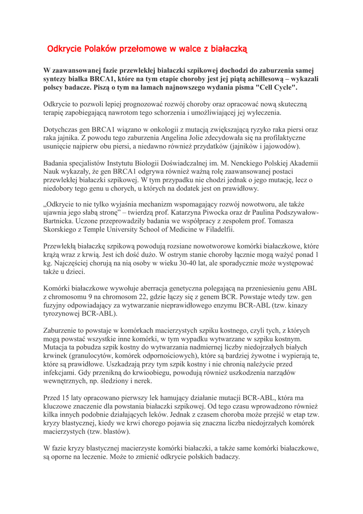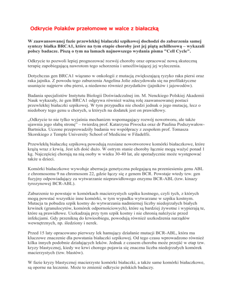 Odkrycie Polaków przełomowe w walce z białaczką W zaawansowanej fazie przewlekłej białaczki szpikowej dochodzi do zaburzenia samej syntezy białka BRCA1, które na tym etapie choroby jest jej piątą achillesową – wykazali polscy badacze. Piszą o tym na łamach najnowszego wydania pisma "Cell Cycle". Odkrycie to pozwoli lepiej prognozować rozwój choroby oraz opracować nową skuteczną terapię zapobiegającą nawrotom tego schorzenia i umożliwiającej jej wyleczenia. Dotychczas gen BRCA1 wiązano w onkologii z mutacją zwiększającą ryzyko raka piersi oraz raka jajnika. Z powodu tego zaburzenia Angelina Jolie zdecydowała się na profilaktyczne usunięcie najpierw obu piersi, a niedawno również przydatków (jajników i jajowodów). Badania specjalistów Instytutu Biologii Doświadczalnej im. M. Nenckiego Polskiej Akademii Nauk wykazały, że gen BRCA1 odgrywa również ważną rolę zaawansowanej postaci przewlekłej białaczki szpikowej. W tym przypadku nie chodzi jednak o jego mutację, lecz o niedobory tego genu u chorych, u których na dodatek jest on prawidłowy. „Odkrycie to nie tylko wyjaśnia mechanizm wspomagający rozwój nowotworu, ale także ujawnia jego słabą stronę” – twierdzą prof. Katarzyna Piwocka oraz dr Paulina PodszywałowBartnicka. Uczone przeprowadziły badania we współpracy z zespołem prof. Tomasza Skorskiego z Temple University School of Medicine w Filadelfii. Przewlekłą białaczkę szpikową powodują rozsiane nowotworowe komórki białaczkowe, które krążą wraz z krwią. Jest ich dość dużo. W ostrym stanie choroby łącznie mogą ważyć ponad 1 kg. Najczęściej chorują na nią osoby w wieku 30-40 lat, ale sporadycznie może występować także u dzieci. Komórki białaczkowe wywołuje aberracja genetyczna polegającą na przeniesieniu genu ABL z chromosomu 9 na chromosom 22, gdzie łączy się z genem BCR. Powstaje wtedy tzw. gen fuzyjny odpowiadający za wytwarzanie nieprawidłowego enzymu BCR-ABL (tzw. kinazy tyrozynowej BCR-ABL). Zaburzenie to powstaje w komórkach macierzystych szpiku kostnego, czyli tych, z których mogą powstać wszystkie inne komórki, w tym wypadku wytwarzane w szpiku kostnym. Mutacja ta pobudza szpik kostny do wytwarzania nadmiernej liczby niedojrzałych białych krwinek (granulocytów, komórek odpornościowych), które są bardziej żywotne i wypierają te, które są prawidłowe. Uszkadzają przy tym szpik kostny i nie chronią należycie przed infekcjami. Gdy przenikną do krwioobiegu, powodują również uszkodzenia narządów wewnętrznych, np. śledziony i nerek. Przed 15 laty opracowano pierwszy lek hamujący działanie mutacji BCR-ABL, która ma kluczowe znaczenie dla powstania białaczki szpikowej. Od tego czasu wprowadzono również kilka innych podobnie działających leków. Jednak z czasem choroba może przejść w etap tzw. kryzy blastycznej, kiedy we krwi chorego pojawia się znaczna liczba niedojrzałych komórek macierzystych (tzw. blastów). W fazie kryzy blastycznej macierzyste komórki białaczki, a także same komórki białaczkowe, są oporne na leczenie. Może to zmienić odkrycie polskich badaczy. "Nasze badania wykazały, że w zaawansowanej fazie przewlekłej białaczki szpikowej dochodzi do zaburzenia samej syntezy białka BRCA1. Chory ma prawidłowy gen kodujący to białko, ale cząsteczki informacyjnego kwasu mRNA, niezbędne do jego produkcji, są zwinięte i opakowane w kompleksy białkowe. Tak schowane nie mogą uczestniczyć w procesie syntezy białka" - wyjaśnia główna autorka publikacji, dr Paulina PodszywałowBartnicka. Nowe leczenie mogłoby polegać na wykorzystaniu niedoboru białka BRCA1. Bo to, co służy komórkom nowotworowym, w tym wypadku może zostać wykorzystany przeciw nim. "Gdy komórka ma uszkodzony jeden szlak sygnałowy lub gen, zwykle może funkcjonować dalej, ponieważ najprawdopodobniej wciąż działa inny szlak, alternatywny. Dopiero, gdy i on zostanie zahamowany, komórka traci zdolność funkcjonowania" - wyjaśnia prof. Skorski Na tym może polegać nowa strategia leczenia przewlekłej białaczki szpikowej. "Skoro wiemy, że jeden szlak naprawy DNA, zależny od BRCA1, nie działa w komórce białaczkowej, możemy poszukać szlaku uzupełniającego i spróbować go wyłączyć. Komórka białaczkowa zostałaby zmuszona do popełnienia samobójstwa. Jednocześnie komórka zdrowa by przeżyła, bo cały czas dysponowałaby aktywnym szlakiem naprawy zależnym od BRCA1" – twierdzi uczony. Dodaje, że takie potencjalne terapie wykorzystujące niedobory BRCA1 są już testowane.