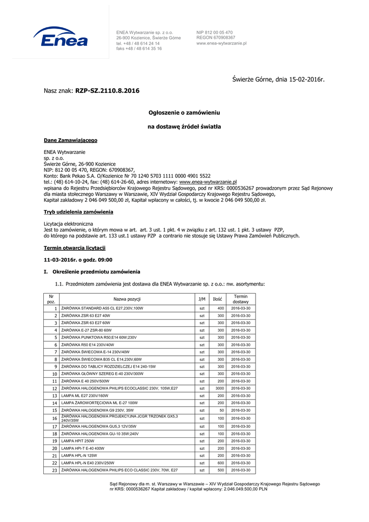 ENEA Wytwarzanie sp. z o.o. 26-900 Kozienice, Świerże Górne tel. +48 / 48 614 24 14 faks +48 / 48 614 35 16 NIP 812 00 05 470 REGON 670908367 www.enea-wytwarzanie.pl Świerże Górne, dnia 15-02-2016r. Nasz znak: RZP-SZ.2110.8.2016 Ogłoszenie o zamówieniu na dostawę źródeł światła Dane Zamawiającego ENEA Wytwarzanie sp. z o.o. Świerże Górne, 26-900 Kozienice NIP: 812 00 05 470, REGON: 670908367, Konto: Bank Pekao S.A. O/Kozienice Nr 70 1240 5703 1111 0000 4901 5522 tel.: (48) 614-10-24, fax: (48) 614-26-60, adres internetowy: www.enea-wytwarzanie.pl wpisana do Rejestru Przedsiębiorców Krajowego Rejestru Sądowego, pod nr KRS: 0000536267 prowadzonym przez Sąd Rejonowy dla miasta stołecznego Warszawy w Warszawie, XIV Wydział Gospodarczy Krajowego Rejestru Sądowego, Kapitał zakładowy 2 046 049 500,00 zł, Kapitał wpłacony w całości, tj. w kwocie 2 046 049 500,00 zł. Tryb udzielenia zamówienia Licytacja elektroniczna Jest to zamówienie, o którym mowa w art. art. 3 ust. 1 pkt. 4 w związku z art. 132 ust. 1 pkt. 3 ustawy PZP, do którego na podstawie art. 133 ust.1 ustawy PZP a contrario nie stosuje się Ustawy Prawa Zamówień Publicznych. Termin otwarcia licytacji 11-03-2016r. o godz. 09:00 I. Określenie przedmiotu zamówienia 1.1. Przedmiotem zamówienia jest dostawa dla ENEA Wytwarzanie sp. z o.o.: nw. asortymentu: Nr poz. Nazwa pozycji J/M Ilość Termin dostawy 1 ŻARÓWKA STANDARD A55 CL E27,230V,100W szt 400 2016-03-30 2 ŻARÓWKA ZSR 63 E27 40W szt 300 2016-03-30 3 ŻARÓWKA ZSR 63 E27 60W szt 300 2016-03-30 4 ŻARÓWKA E-27 ZSR-80 60W szt 300 2016-03-30 5 ŻARÓWKA PUNKTOWA R50;E14 60W;230V szt 300 2016-03-30 6 ŻARÓWKA R50 E14 230V/40W szt 300 2016-03-30 7 ŻARÓWKA ŚWIECOWA E-14 230V/40W szt 300 2016-03-30 8 ŻARÓWKA ŚWIECOWA B35 CL E14,230V,60W szt 300 2016-03-30 9 ŻARÓWKA DO TABLICY ROZDZIELCZEJ E14 240-15W szt 300 2016-03-30 10 ŻARÓWKA GŁÓWNY SZEREG E-40 230V/300W szt 300 2016-03-30 11 ŻARÓWKA E 40 250V/500W szt 200 2016-03-30 12 ŻARÓWKA HALOGENOWA PHILIPS ECOCLASSIC 230V, 105W,E27 szt 3000 2016-03-30 13 LAMPA ML E27 230V/160W szt 200 2016-03-30 14 LAMPA ŻAROWORTĘCIOWA ML E-27 100W szt 200 2016-03-30 15 ŻARÓWKA HALOGENOWA G9 230V, 35W szt 50 2016-03-30 16 ŻARÓWKA HALOGENOWA PROJEKCYJNA JCGR TRZONEK GX5,3 240V/35W szt 100 2016-03-30 17 ŻARÓWKA HALOGENOWA GU5,3 12V/35W szt 100 2016-03-30 18 ŻARÓWKA HALOGENOWA GU-10 35W;240V szt 100 2016-03-30 19 LAMPA HPIT 250W szt 200 2016-03-30 20 LAMPA HPI-T E-40 400W szt 200 2016-03-30 21 LAMPA HPL-N 125W szt 200 2016-03-30 22 LAMPA HPL-N E40 230V/250W szt 600 2016-03-30 23 ŻARÓWKA HALOGENOWA PHILIPS ECO CLASSIC 230V, 70W, E27 szt 500 2016-03-30 Sąd Rejonowy dla m. st. Warszawy w Warszawie – XIV Wydział Gospodarczy Krajowego Rejestru Sądowego nr KRS: 0000536267 Kapitał zakładowy / kapitał wpłacony: 2.046.049.500,00 PLN OGŁOSZENIE O ZAMÓWIENIU W TRYBIE LICYTACJI ELEKTRONICZNEJ DLA ENEA WYTWARZANIE SP. Z O.O. (Zamówienie nieobjęte postępowaniem o udzielenie zamówienia publicznego) Nr poz. 24 Nazwa pozycji J/M Ilość Termin dostawy LAMPA HPL-N E40 240V/400W szt 400 2016-03-30 25 LAMPA SODOWA WLSP E-40 220W szt 100 2016-03-30 26 LAMPA SODOWA WLS 70W szt 100 2016-03-30 27 LAMPA SODOWA WLS 100W E27 szt 150 2016-03-30 28 LAMPA SODOWA WLS 100W E40 szt 150 2016-03-30 29 LAMPA SODOWA WLS 150W szt 150 2016-03-30 30 LAMPA SODOWA WLS E-40 250W szt 200 2016-03-30 31 LAMPA SODOWA WLS 400 szt 100 2016-03-30 32 LAMPA HALOGENOWA R7-S 300W szt 100 2016-03-30 33 ŻARNIK PLUSLINE ES S 400WR7S 117MM szt 100 2016-03-30 34 ŻARÓWKA WSTRZĄSOODPORNA WST-2099 HELIOS 230V 150W E27 szt 6000 2016-03-30 35 LAMPA HALOGENOWA R7-S 500W szt 100 2016-03-30 36 ŚWIETLÓWKA LF 36W/220V szt 3000 2016-03-30 37 ŚWIETLÓWKA MASTER SUPER 80 TL-D SLV 36W L840 szt 2000 2016-03-30 38 ŚWIETLÓWKA PHILIPS 830CIEPŁABIAŁA 18W szt 600 2016-03-30 39 ŚWIETLÓWKA LF 18W 54 G13 szt 3000 2016-03-30 40 ŚWIETLÓWKA OSRAM DULUX D/E 31-830 18W szt 200 2016-03-30 41 ŚWIETLÓWKA PL-S11W/840/2P szt 50 2016-03-30 42 ŚWIETLÓWKA D2 9W szt 50 2016-03-30 43 ŚWIETLÓWKA KOMPAKTOWA E27 GL BRILUX 23W szt 40 2016-03-30 44 ŚWIETLÓWKA TL5 HE 14W/840 szt 300 2016-03-30 45 ŻARÓWKA GŁÓWNY SZEREG E-27 230V/60W szt 400 2016-03-30 46 ŚWIETLÓWKA SUPER 80 TL-D SLV 58W L840 szt 200 2016-03-30 47 STARTER/ZAPŁONNIK PHILIPS 4-65W szt 2000 2016-03-30 48 STARTER PHILIPS 4-22W szt 1500 2016-03-30 49 ŻARÓWKA GŁÓWNY SZEREG E-27 240V/40W szt 400 2016-03-30 50 ŻARÓWKA SIG 1543 E27 240V/75W szt 400 2016-03-30 51 ŻARÓWKA E-27 24V/40W szt 500 2016-03-30 52 ŻARÓWKA E-27 24V/60W szt 300 2016-03-30 1.2. Nie dopuszcza się składania ofert równoważnych 1.3. Nie dopuszcza się składania ofert wariantowych 1.4. Nie dopuszcza się składania ofert częściowych II. Wymagania dotyczące rejestracji i identyfikacji Wykonawców, w tym wymagania techniczne urządzeń informatycznych. 2.1. Wymagania formalne: 2.1.1. Z platformy mogą korzystać Wykonawcy zarejestrowani w systemie pod adresem: http://licytacje.uzp.gov.pl 2.1.2. Wykonawca, aby umożliwić Zamawiającemu dopuszczenie go do udziału w licytacji, musi zarejestrować się w systemie dostępnym na stronie http://licytacje.uzp.gov.pl i przekazać Zamawiającemu swój login, wypełniając odpowiednie pole we Wniosku o dopuszczenie do udziału w licytacji elektronicznej ( Załącznik nr 1 do ogłoszenia). 2.1.3. W przypadku podania przez Wykonawcę niewłaściwego loginu bądź nie przekazania go Zamawiającemu wraz z Wnioskiem, Wykonawca zobowiązany jest do jego przekazania najpóźniej jeden dzień przed terminem otwarcia licytacji. 2.2. Wymagania techniczne: Komputer klasy PC (lub równoważnej) spełniający wymogi określone przez producentów przeglądarek internetowych MS Internet Explorer w wersji 6.0 lub wyżej albo Mozilla Firefox w wersji 2.0 lub wyżej, z zainstalowaną jedną z wyżej wymienionych przeglądarek lub równoważną, podłączony do sieci Internet. III. Spos