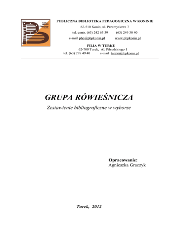 PUBLICZNA BIBLIOTEKA PEDAGOGICZNA W KONINIE 62-510 Konin, ul. Przemysłowa 7 tel. centr. (63) 242 63 39 e-mail [email protected] (63) 249 30 40 www.pbpkonin.pl FILIA W TURKU 62-700 Turek, Al. Piłsudskiego 1 tel. (63) 278 49 40 e-mail [email protected] GRUPA RÓWIEŚNICZA Zestawienie bibliograficzne w wyborze Opracowanie: Agnieszka Graczyk Turek, 2012 WYDAWNICTWA ZWARTE 1. ABC WYCHOWANIA dla nauczycieli i wychowawców / M. Łobocki. – Warszawa : Wydawnictwa Szkolne i Pedagogiczne, 1992. – s. 48-53: Grupy rówieśnicze Sygn.: 32182-32183 2. GRUPA rówieśnicza / M. Winiarski [W:] Encyklopedia pedagogiczna XXI wieku : suplement A - Ż / [red. nauk. T. Pilch] – Warszawa : Wydawnictwo Akademickie Żak, 2010. – s.163-171 Sygn.: 45656 3. GRUPA rówieśnicza jako środowisko wychowawcze / T. Pilch [W:] Pedagogika społeczna : człowiek w zmieniającym się świecie / pod red. T. Pilcha, I. Lepalczyk. – Wyd. 2 popr. i rozsz. – Warszawa : Wydawnictwo Akademickie Żak, 1995. – s. 174186 Sygn.: 37820 – 37821 [czytelnia] 38691, 35495, 34871 – 34872, 34224 – 34225 [wypożyczalnia] 4. GRUPY rówieśnicze i ich rola w wychowaniu / E. Korczak [W:] Pedagogika społeczna u schyłku XX wieku : zagadnienia wybrane : praca zbiorowa / pod red. A. Radziewicza-Winnickiego. – Katowice : ZSPM - Press, 1992. – s. 317-325 Sygn.: 31721 5. GRUPY rówieśnicze młodzieży / B. Misztal. – Wrocław : Zakład Narodowy im. Ossolińskich, 1974 Sygn.: 14353 – 14354 6. INTEGRACJA w grupie rówieśniczej wyzwaniem dla pedagoga w toku podejmowania działań dydaktyczno-wychowawczych / A. Witek [W:] Kształtowanie umiejętności wychowawczych / pod red. T. Sokołowskiej-Dzioby. – Lublin : Wydawnictwo Uniwersytetu Marii Curie Skłodowskiej, 2002. – s. 145-165 Sygn.: 43908 7. MŁODZIEŻOWE programy wsparcia rówieśniczego / Z. B. Gaś. – Katowice : Śląsk, Wydawnictwo Naukowe, 1999 Sygn.: 36724 8. MOJE dziecko idzie do szkoły : poradnik dla rodziców / M. Rudnicka. – Warszawa : Wydawnictwo TELBIT, 2005. – s. 71-76: Rola grup rówieśniczych w życiu dziecka Sygn.: 42616 9. O WSPÓŁŻYCIU dzieci w grupie przedszkolnej : konflikty i próby ich rozwiązywania / I. Dudzińska. – Wyd. 2. – Warszawa : Wydawnictwa Szkolne i Pedagogiczne, 1975 Sygn.: 17008-17009 10. PEDAGOGIKA społeczna / R. Wroczyński. – Wyd. 4 uzup. – Warszawa : Państwowe Wydawnictwo Naukowe, 1985. – s. 189-202: Grupy rówieśnicze Sygn.: 27498 - 27499 1 11. PRESTIŻ ucznia wśród rówieśników / A. Janowski, R. Stachyra. – Warszawa : Wydawnictwa Szkolne i Pedagogiczne, 1985 Sygn.: 27276 12. PSYCHOLOGIA wychowawcza. T. 2 / M. Przetacznik-Gierowska, Z. Włodarski. – Wyd. 6 rozszerz. i zm. – Warszawa : Wydawnictwo Naukowe PWN, 1994. – s. 209213: Grupa rówieśnicza jako środowisko wychowawcze Sygn.: 32982, 32984 13. PSYCHOLOGIA wychowawcza dla nauczycieli / Z. Skorny. – Wyd. 2. – Warszawa : Wydawnictwa Szkolne i Pedagogiczne, 1992. – s. 46-53: Grupy rówieśnicze Sygn.: 31934-31935 14. SŁOWNIK socjologiczny / K. Olechnicki, P. Załęcki. – Toruń : Graffiti BC, 1997. – s. 74: Grupa rówieśnicza Sygn.: 35022 15. SŁOWNIK socjologii i nauk społecznych : Oxford / pod red. Go. Marshalla. – Warszawa : Wydawnictwo Naukowe PWN, 2004. – s. 110: Grupa rówieśnicza Sygn.: 42118 16. SYTUACJE konfliktu w środowisku rodzinnym, szkolnym i rówieśniczym : jak sobie radzą z nimi dzieci i młodzież? / red. D. Borecka-Biernat. – Warszawa : Difin, 2010 Sygn.: 45736 17. ZACHOWANIA dewiacyjne młodzieży w interakcjach rówieśniczych / B. Urban. – Kraków : Wydawnictwo Uniwersytetu Jagiellońskiego, 2005 Sygn.: 44949 ARTYKUŁY Z CZASOPISM 18. CZTERY błędy popełniane przez rodziców / B. Iwanejko // Edukacja i Dialog. – 2006, nr 9, s. 12-16 19. CZY SPOŁECZNA integracja dzieci głuchych i słyszących jest możliwa? Pedagogiczne aspekty interakcji rówieśniczych / A. Łukaszewicz-Orzechowska // Kwartalnik Pedagogiczny. – 2008, nr 3, s. 101-112 20. DYNAMIKA roli relacji rówieśniczej - od wczesnego dzieciństwa do wczesnej dorosłości / B. Smykowski // Edukacja. – 2009, nr 2, s. 21-37 21. DZIECI izolowane i odrzucone / M. Supińska // Życie Szkoły. – 2003, nr 2, s. 87-89 22. DZIECI nieakceptowane w grupie - diagnoza i analiza zjawiska / G. Paluch // Nauczyciel i Szkoła. – 1999, nr 2, s. 42-49 23. DZIECKO nieakceptowane przez grupę rówieśniczą / R. Rybarczyk // Życie Szkoły. – 2007, nr 2, s. 49-52 2 24. FUNKCJONOWANIE społeczne jedynaków w grupie rówieśniczej / K. Karteczka // Problemy Opiekuńczo-Wychowawcze. – 2011, nr 7, s. 39-43 25. GDY UCZEŃ jest odrzucany przez grupę / B. Rechnio-Kołodziej // Wszystko dla Szkoły. – 2008, nr 11, s. 6-7 26. GRUPA rówieśnicza a dom / R. Ryszka // Wychowawca. – 2010, nr 10, s. 16-17 27. GRUPA rówieśnicza jako obszar nabywania doświadczeń społecznych (bibliografia w wyborze) / A. Łojek // Nauczanie Początkowe. – 2007/2008, nr 3, s. 106 - 108 28. IDENTYFIKACJA gimnazjalistów z rówieśnikami / A. Famuła-Jurczak // Problemy Opiekuńczo-Wychowawcze. – 2009, nr 8, s. 44-49 29. INTERAKCJE rówieśnicze – zjawisko tutoringu dziecięcego / A. Pawlak // Nowa Szkoła. – 2006, nr 3, s. 41-47 30. KLASA gimnazjalna / M. Bartczak // Psychologia w Szkole. – 2004, nr 3, s. 59-66 31. KONFLIKTY interpersonalne w okresie późnego dzieciństwa / M. Cywińska // Kwartalnik Pedagogiczny. – 2005, nr 1, s. 173-185 32. KTO RZĄDZI w klasie? / M. Młynarczyk // Dyrektor Szkoły. – 2008, nr 3, s. 36-39 33. METODA edukacji rówieśniczej w profilaktyce i promocji zdrowia / M. Cyrklaff // Wychowanie na co dzień. – 2009, nr 10-11, s. 22-24 34. NASTOLATEK w grupie. Cz. I / T. Garstka // Głos Nauczycielski. – 2011, nr 42, s. 20 35. NASTOLATEK w grupie. Cz. II / T. Garstka // Głos Nauczycielski. – 2011, nr 44, s. 16 36. NASTOLATEK w grupie. Cz. III [subkultury] / T. Garstka // Głos Nauczycielski. – 2011, nr 46, s. 16 37. N