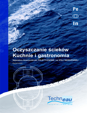 Oczyszczanie œcieków Kuchnie i gastronomia Separatory t³uszczu/skrobi, POLIETYLENOWE i ze STALI NIERDZEWNEJ Edycja 01/2009 I n ¿ y n i e r i a w o d n a Separatory z POLIETYLENU Separatory ze STALI NIERDZEWNEJ Oczyszczanie œcieków Separatory t³uszczu/skrobi, POLIETYLENOWE i ze STALI NIERDZEWNEJ Kompletna gama urz¹dzeñ dla gastronomii i przemys³u rolno-spo¿ywczego Spis treœci Separatory t³uszczu/skrobi, gama POLIETYLENOWA • • • • • Wstêp...................................................................................................................................................... 2 Dzia³anie................................................................................................................................................. 3 Dobór i opcje.......................................................................................................................................... 4 Instalacja................................................................................................................................................. 5 Gamy z Polietylenu: ELLIPSE, ARONDE i MINI EG05 i DGE Separator t³uszczu z osadnikiem.......................................................................... 7 EG10 i DGAE Separator t³uszczu z osadnikiem i instalacj¹ do opró¿niania ............................... 8 EG20 i GFE Separator t³uszczu i skrobi z osadnikiem ............................................................. 9 EG25 i GFAE Separator t³uszczu i skrobi z osadnikiem i instalacj¹ do opró¿niania .................. 10 EG30 Separator skrobi................................................................................................... 11 EG35 Separator skrobi z instalacj¹ do opró¿niania ....................................................... 11 EG15 i GE Separator t³uszczu................................................................................................ 12 ED i DE Osadnik................................................................................................................. 13 GM1E i GM2E Mini separator t³uszczu ......................................................................................... 14 Separatory t³uszczu/skrobi, gama ze STALI NIERDZEWNEJ • • • • Wstêp i dobór.......................................................................................................................................... 15 Opcje........................................................................................................................................................ 16 Instalacja................................................................................................................................................. 17 Gama ze stali nierdzewnej MiniGR Mini separator t³uszczu podzlewowy .................................................................... 18 _ DGI Separator t³uszczu z osadnikiem.......................................................................... 19 _ DGAI Separator t³uszczu z osadnikiem i instalacj¹ do opró¿niania ............................... 20 _ GFI Separator t³uszczu i skrobi z osadnikiem ............................................................. 21 _ GFAI Separator t³uszczu i skrobi z osadnikiem i instalacj¹ do opró¿niania .................. 22 8 hektarów przeznaczonych dla in¿ynierii wodnej i ponad 70 pracowników produkcyjnych. Maj¹c na uwadze sta³y rozwój swoich produktów, Techneau zastrzega sobie prawo do zmiany parametrów swoich urz¹dzeñ. 1 PEG-ING: Separatory t³uszczu / skrobi Gamy: POLIETYLENOWA i ze STALI NIERDZEWNEJ © 2008- Wszystkie prawa zastrze¿one TECHNEAU POLSKA Sp. z o.o. ul.D³uga 61, Jedlicze A, 95-073 Grotniki – Polska Tel.: (+48) 42 717 93 93 – Fax: (+48) 42 717 93 94 E-mail: [email protected] – www.techneau.com.pl Separatory z POLIETYLENU Wstêp Separatory t³uszczu / skrobi Nasza wiedza i kompetencje s³u¿¹ ochronie œrodowiska Dlaczego? • T³uszcze i skrobia s¹ substancjami, które w du¿ym stopniu zanieczyszczaj¹ kanalizacjê. Konieczne jest zatem ich przechwycenie zanim przedostan¹ siê do sieci kanalizacyjnej. • T³uszcze i skrobia znajduj¹ siê przede wszystkim w œciekach pochodz¹cych z restauracji, kuchni zbiorowego ¿ywienia oraz w œciekach pochodz¹cych z przemys³u rolno-spo¿ywczego. Gama Techneau stworzy³o kompletn¹ gamê separatorów t³uszczu i skrobi. • Separatory t³uszczu z wbudowanym osadnikiem, o przep³ywie od 1 do 20 l/s, mog¹ce podczyœciæ œcieki z restauracji przygotowuj¹cych do 4000 posi³ków dziennie. • • Separatory skrobi o przep³ywie od 1 do 4 l/s Modele ³¹czone spe³niaj¹ce obie funkcje – separatora t³uszczu i skrobi, o przep³ywie od 1 do 15 l/s. Polietylen • Œcieki pochodz¹ce z restauracji lub przemys³u rolnospo¿ywczego s¹ wyj¹tkowo agresywne. Polietylen jest materia³em szczególnie dobrze dobranym poniewa¿ posiada bardzo wysok¹ wytrzyma³oœæ mechaniczn¹ i nie ulega procesom korozji. • G³adkie œciany wewnêtrzne zbiorników zapobiegaj¹ przywieraniu t³uszczu upraszczaj¹c obs³ugê separatorów, a same urz¹dzenia dzia³aj¹ niezwykle skutecznie. W przeciwieñstwie do separatorów ze stali i betonu, które musz¹ mieæ zapewnion¹ regularn¹ obs³ugê, Polietylen nie wymaga ¿adnej specjalnej konserwacji. Norma • Separatory t³uszczu posiadaj¹ znak CE i tym samym respektuj¹ warunki zawarte w aneksie ZA normy PN-EN 1825-1 . Produkcja • Technika odlewu rotacyjnego umo¿liwia wykonanie monolitycznych zbiorników polietylenowych o jednorodnej, du¿ej gruboœci œcianek co gwarantuje dobr¹ wytrzyma³oœæ mechaniczn¹. • Technologia monobloc zapewnia absolutn¹ szczelnoœæ separatorów eliminuj¹c jakiekolwiek ryzyko wycieku (zbiorniki nie posiadaj¹ ¿adnych ³¹czeñ ani spawów). TECHNEAU POLSKA Sp. z o.o. ul.D³uga 61, Jedlicze A, 95-073 Grotniki – Polska Tel.: (+48) 42 717 93 93 – Fax: (+48) 42 717 93 94 E-mail: [email prot