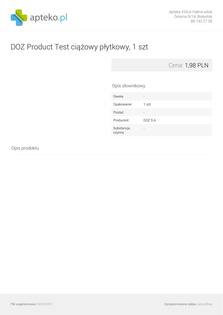 Apteka VIOLA Halina wiluk Żelazna 9/14, Białystok 85 742 27 35 DOZ Product Test ciążowy płytkowy, 1 szt Cena: 1,98 PLN Opis słownikowy Dawka - Opakowanie 1 szt. Postać - Producent DOZ S.A. Substancja czynna - Opis produktu Plik wygenerowano: 04-03-2017 Powered by TCPDF (www.tcpdf.org) Oprogramowanie sklepu: AptusShop