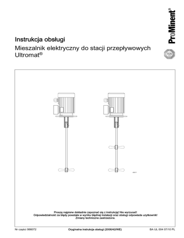 Instrukcja obsługi Mieszalnik elektryczny do stacji przepływowych Ultromat® A0411 Proszę najpierw dokładnie zapoznać się z instrukcją! Nie wyrzucać! Odpowiedzialność za błędy powstałe w wyniku błędnej instalacji oraz obsługi odpowiada uzytkownik! Zmiany techniczne zastrzeżone. Nr części 986072 Oryginalna instrukcja obsługi (2006/42/WE) BA UL 004 07/10 PL ProMinent Dosiertechnik GmbH Im Schuhmachergewann 5 - 11 69123 Heidelberg Telefon: +49 6221 842-0 Faks: +49 6221 842-419 e-mail: [email protected] Internet: www.prominent.com 986072, 1, pl_PL © 2010 2 Spis treści Spis treści 1 Wprowadzenie...................................................................... 4 1.1 Oznaczenia wskazówek bezpieczeństwa..................... 4 1.2 Kwalifikacje użytkownika.............................................. 6 2 Bezpieczeństwo i odpowiedzialność..................................... 7 2.1 Ogólne zasady bezpieczeństwa................................... 7 2.2 Użytkowanie zgodne z przeznaczeniem....................... 8 3 Uruchomienie........................................................................ 9 3.1 Składowanie i transport................................................ 9 3.2 Budowa......................................................................... 9 3.3 Montaż........................................................................ 10 3.4 Instalacja..................................................................... 10 4 Naprawa i konserwacja mieszalnika................................... 11 4.1 Konserwacja............................................................... 11 4.2 Naprawa..................................................................... 11 5 Dane techniczne................................................................. 5.1 Dane silnika................................................................ 5.2 Zastosowane materiały............................................... 5.3 Wymiary i masa.......................................................... 5.4 Części zamienne........................................................ 6 Deklaracja zgodności.......................................................... 17 7 Skorowidz........................................................................... 18 12 12 14 15 16 3 Wprowadzenie 1 Wprowadzenie O produkcie Mieszalniki elektryczne służą do mieszania roztworów polimerów w stacjach przepływowych Ultromat®. Mieszalniki mogą być zamawiane i dostarczane pojedynczo, a także w połączeniu ze stacjami przepływowymi Ultromat®. Elementy mieszalników mające kontakt z medium wykonane są ze stacji szlachetnej. Lepkość materiału może wynosić do 1500 mPas. Ogólne równouprawnienie 1.1 W dokumencie tym wykorzystano formę gramatyczną rodzaju męskiego w znaczeniu neutralnym, w celu uzyskania tekstu łatwiej‐ szego do czytania. Forma zwracania się do kobiet i mężczyzn jest zawsze taka sama. Czytelniczki prosimy o wyrozumiałość za takie uproszczenia w tekście. Oznaczenia wskazówek bezpieczeństwa Wprowadzenie Niniejsza instrukcja obsługi przedstawia dane techniczne oraz sposób działania urządzenia. Instrukcja podaje szczegółowe wska‐ zówki dotyczące bezpieczeństwa i jest podzielona według prze‐ jrzystych etapów postępowania. Wskazówki dotyczące bezpieczeństwa i inne informacje zostały pogrupowane według poniższego schematu. W związku z tym wprowadzono tutaj różne, stosowne do zaistniałej sytuacji pikto‐ gramy. Poniższe piktogramy zostały przytoczone jako przykład. NIEBEZPIECZEŃSTWO! Rodzaj i źródło zagrożenia Konsekwencje: Śmierć lub bardzo poważne uszko‐ dzenie ciała. Środki, które należy podjąć w celu uniknięcia zagro‐ żenia. Niebezpieczeństwo! – Symbol ten oznacza bezpośrednio grożące nie‐ bezpieczeństwo. Nieprzestrzeganie tego ostrze‐ żenia może doprowadzić do śmieci lub bardzo poważnego uszkodzenia ciała. OSTRZEŻENIE! Rodzaj i źródło zagrożenia Możliwe konsekwencje: Śmierć lub bardzo poważne uszkodzenie ciała. Środki, które należy podjąć w celu uniknięcia zagro‐ żenia. Ostrzeżenie! – 4 Symbol ten oznacza prawdopodobną sytuację zagrożenia. Nieprzestrzeganie tego ostrzeżenia może doprowadzić do śmieci lub bardzo poważ‐ nego uszkodzenia ciała. Wprowadzenie OSTROŻNIE! Rodzaj i źródło zagrożenia Możliwe konsekwencje: Lekkie lub niewielkie obra‐ żenia ciała. Szkody materialne. Środki, które należy podjąć w celu uniknięcia zagro‐ żenia. Uwaga! – Symbol ten oznacza prawdopodobną sytuację zagrożenia. Nieprzestrzeganie tego ostrzeżenia może doprowadzić do lekkich lub niewielkich obrażeń ciała. Symbol ten można stosować rów‐ nież w celu ostrzeżenia przed szkodami material‐ nymi. UWAGA! Rodzaj i źródło zagrożenia Uszkodzenie urządzenia lub innych rzeczy w jego oto‐ czeniu. Środki, które należy podjąć w celu uniknięcia zagro‐ żenia. Wskazówka! – Symbol ten oznacza prawdopodobną sytuację zagrożenia. Nieprzestrzeganie tego ostrzeżenia może doprowadzić do uszkodzenia samego urzą‐ dzenia lub innych rzeczy w jego otoczeniu. Rodzaj informacji Wskazówki dotyczące zastosowania i inne dodatkowe informacje. Źródło informacji. Dodatkowe środki zaradcze. Info! – Symbol ten oznacza wskazówki dotyczące zasto‐ sowania oraz inne szczególnie przydatne infor‐ macje. Nie jest to sygnał ostrzegający przed sytuacją zagrożenia. 5 Wprowadzenie 1.2 Kwalifikacje użytkownika OSTRZEŻENIE! Niebezpieczeństwo odniesienia obrażeń w przypadku niewystarczających kwalifikacji personelu! Użytkownik instalacji / urządzenia odpowiedzialny jest za spełnienie wymagań dotyczących kwalifikacji. Jeżeli niewykwalifikowany personel podejmie pracę na urządzeniu lub znajdzie się w strefie zagrożenia urzą‐ dzenia, wówczas istnieje niebezpieczeństwo odnie‐ sienia ciężkich obrażeń lub wystąpienia szkód mate‐ rialnych. 