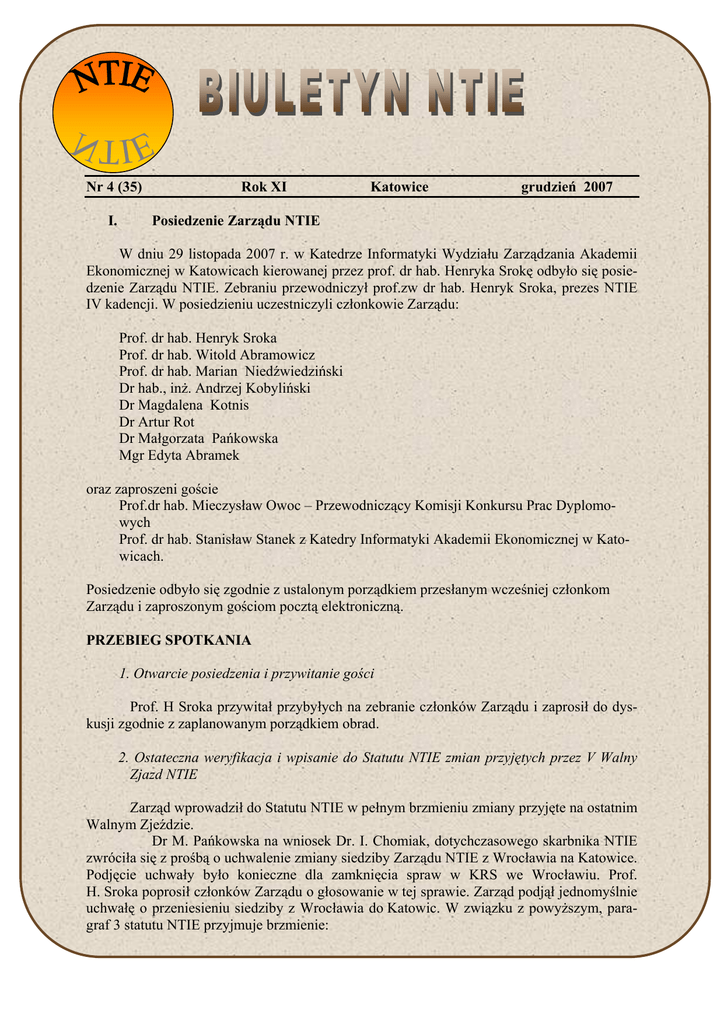 Nr 4 (35) I. Rok XI Katowice grudzień 2007 Posiedzenie Zarządu NTIE W dniu 29 listopada 2007 r. w Katedrze Informatyki Wydziału Zarządzania Akademii Ekonomicznej w Katowicach kierowanej przez prof. dr hab. Henryka Srokę odbyło się posiedzenie Zarządu NTIE. Zebraniu przewodniczył prof.zw dr hab. Henryk Sroka, prezes NTIE IV kadencji. W posiedzieniu uczestniczyli członkowie Zarządu: Prof. dr hab. Henryk Sroka Prof. dr hab. Witold Abramowicz Prof. dr hab. Marian Niedźwiedziński Dr hab., inż. Andrzej Kobyliński Dr Magdalena Kotnis Dr Artur Rot Dr Małgorzata Pańkowska Mgr Edyta Abramek oraz zaproszeni goście Prof.dr hab. Mieczysław Owoc – Przewodniczący Komisji Konkursu Prac Dyplomowych Prof. dr hab. Stanisław Stanek z Katedry Informatyki Akademii Ekonomicznej w Katowicach. Posiedzenie odbyło się zgodnie z ustalonym porządkiem przesłanym wcześniej członkom Zarządu i zaproszonym gościom pocztą elektroniczną. PRZEBIEG SPOTKANIA 1. Otwarcie posiedzenia i przywitanie gości Prof. H Sroka przywitał przybyłych na zebranie członków Zarządu i zaprosił do dyskusji zgodnie z zaplanowanym porządkiem obrad. 2. Ostateczna weryfikacja i wpisanie do Statutu NTIE zmian przyjętych przez V Walny Zjazd NTIE Zarząd wprowadził do Statutu NTIE w pełnym brzmieniu zmiany przyjęte na ostatnim Walnym Zjeździe. Dr M. Pańkowska na wniosek Dr. I. Chomiak, dotychczasowego skarbnika NTIE zwróciła się z prośbą o uchwalenie zmiany siedziby Zarządu NTIE z Wrocławia na Katowice. Podjęcie uchwały było konieczne dla zamknięcia spraw w KRS we Wrocławiu. Prof. H. Sroka poprosił członków Zarządu o głosowanie w tej sprawie. Zarząd podjął jednomyślnie uchwałę o przeniesieniu siedziby z Wrocławia do Katowic. W związku z powyższym, paragraf 3 statutu NTIE przyjmuje brzmienie: Terenem działalności NTIE jest obszar Rzeczpospolitej Polskiej, z siedzibą władz w Katowicach. Statut Naukowego Towarzystwa Informatyki Ekonomicznej dostępny jest na stronie internetowej NTIE – www.ntie.org.pl 3. Dyskusja nad propozycjami zmian zgłoszonymi na V Walnym Żjeździe przez ustępujący Zarząd i rozwojem współpracy naukowej z instytucjami i innymi stowarzyszeniami krajowymi Prof. H.Sroka usprawidliwił nieobecność prof. A Nowickiego i prof. J.Kisielnickiego zaproszonych na posiedzenie Zarządu i poprosił dr M.Pańkowska o przypomnienie przedstawionej na Walnym Zjeździe przez ustępujący Zarząd listy dalszych działań dla nowych władz NTIE. Dr M Pańkowska odczytała również sprawozdanie z działalności Rady Naukowej NTIE za lata 2004-2007 przedstawione na Walnym Zjeździe przez prof. J.Kisielnickiego. Dr M Pańkowska po przedstawieniu wszystkich tez sformułowanych przez profesorów zobligowała się do redagowania Biuletynu NTIE i jego elektronicznej dystrybucji. Poinformowała, że został już wyznaczony nowy Webmaster z Katowic (Mgr M Słaboń) do prowadzenia strony internetowej NTIE. Planowana jest zmiana strony na dynamiczną oraz dalsze rozszerzanie jej treści m.in. o nowości wydawnicze, informacje o konferencjach krajowych i zagranicznych, realizowanych projektach badawczych. Serdecznie Zapraszamy Członków i Sympatyków Naukowego Towarzystwa Informatyki Ekonomicznej do przesyłania na adres poczty elektronicznej Sekretarza NTIE ogłoszeń odnośnie do: nowości wydawniczych konferencji, szkoleń i sympozjów krajowych i zagranicznych projektów badawczych w dziedzinie Informatyki Ekonomicznej Zarząd NTIE wystąpił z propozycją przewodniczenia inicjatywom mającym na celu doskonalenie kształcenia informatycznego na kierunku Informatyka i Ekonometria do Prof. M. Niedźwiedzińskiego, a z propozycją o przewodniczenie inicjatywie wydawania Kodeksu Honorowego członków NTIE do Prof. B. Stefanowicza. Prof. H. Sroka zaprosił do udziału w zebraniu Prof. St. Stanka. Prof. St. Stanek poinformował, że przeprowadził już wstępne rozmowy z Prezesem prężnie działającego Oddziału Górnośląskiego PTI Mgr. J. Trawką. Prof. Stanek przedstawił pomysł wspólnego wydawnictwa książkowego lub czasopisma, które ukazywało by się, przykładowo dwa razy do roku, w j. angielskim. Prof. Stanek poinformował również, że prowadził rozmowy o współpracy z Prof. Szyjewskim, prezesem PTI. Prof. M. Niedźwiedziński zwrócił uwagę na to, że według obserwacji ferkwencji na konferencjach PTI zmienia się struktura aktywności PTI z przemysłowo-użytkowej w kierunku „akademickości”. Głos w dyskusji na zebraniu Zarządu NTIE na temat czasopisma zabrał Prof. W. Abramowicz. Prof. W. Abramowicz wyraził opinię, że może jeszcze za wcześnie podejmować inicjatywę o uruchomieniu czasopisma NTIE. Dr M. Kotnis zaproponowała stworzenie możliwości publikowania prac na poziomie prac z listy filadelfijskiej. Prof. H. Sroka ocenił inicjatywę jako racjonalną ale zwrócił uwagę na to, że najpierw należy stworzyć taką możliwość w ramach Towarzystwa. Prof. W. Abramowicz przedstawił swoje doświadczenia związane z czasopismem Wirtschaftsinformatik, najwyżej notowanym na świecie czasopismem niemieckojęzycznym. Zwrócił uwagę na liczne problemy związane z wydawaniem czasopisma, a mianowicie selekcji artykułów, kwestii finansowych, wersji językowej przyszłego czasopisma NTIE, jego formy oraz częstotliwości ukazywania się, konieczności angażowania w wydawanie czasopisma wielu katedr, jakości artykułów oraz tworzeniu sieci powiązań między publikacjami naukowymi. Członkowie Zarządu NTIE z przyjemnością wysłuchali wszystkich cennych uwag Prof. W. Abramowicza. Prof. H. Sroka podziękował za głos w dyskusji i poprosił o przedstawienie inicjatyw dotychczasowego Zarządu w kierunku wydawania czasopisma i jego dalszych losów. Głos w dyskusji zabrali Prof. M. Owoc i Dr A. Rot, którzy poinformowali że wydano trzy numery czasopisma. Prof. St. Stanek zachęcił do wznowienia inicjatywy. Prof. M. Niedźwiedziński podkreśl