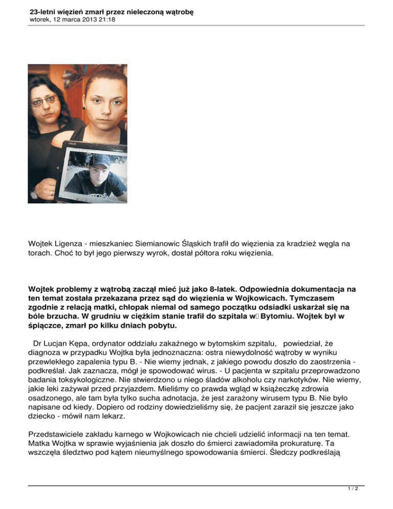 23-letni więzień zmarł przez nieleczoną wątrobę wtorek, 12 marca 2013 21:18 Wojtek Ligenza - mieszkaniec Siemianowic Śląskich trafił do więzienia za kradzież węgla na torach. Choć to był jego pierwszy wyrok, dostał półtora roku więzienia. Wojtek problemy z wątrobą zaczął mieć już jako 8-latek. Odpowiednia dokumentacja na ten temat została przekazana przez sąd do więzienia w Wojkowicach. Tymczasem zgodnie z relacją matki, chłopak niemal od samego początku odsiadki uskarżał się na bóle brzucha. W grudniu w ciężkim stanie trafił do szpitala w Bytomiu. Wojtek był w śpiączce, zmarł po kilku dniach pobytu. Dr Lucjan Kępa, ordynator oddziału zakaźnego w bytomskim szpitalu, powiedział, że diagnoza w przypadku Wojtka była jednoznaczna: ostra niewydolność wątroby w wyniku przewlekłego zapalenia typu B. - Nie wiemy jednak, z jakiego powodu doszło do zaostrzenia podkreślał. Jak zaznacza, mógł je spowodować wirus. - U pacjenta w szpitalu przeprowadzono badania toksykologiczne. Nie stwierdzono u niego śladów alkoholu czy narkotyków. Nie wiemy, jakie leki zażywał przed przyjazdem. Mieliśmy co prawda wgląd w książeczkę zdrowia osadzonego, ale tam była tylko sucha adnotacja, że jest zarażony wirusem typu B. Nie było napisane od kiedy. Dopiero od rodziny dowiedzieliśmy się, że pacjent zaraził się jeszcze jako dziecko - mówił nam lekarz. Przedstawiciele zakładu karnego w Wojkowicach nie chcieli udzielić informacji na ten temat. Matka Wojtka w sprawie wyjaśnienia jak doszło do śmierci zawiadomiła prokuraturę. Ta wszczęła śledztwo pod kątem nieumyślnego spowodowania śmierci. Śledczy podkreślają 1/2 23-letni więzień zmarł przez nieleczoną wątrobę wtorek, 12 marca 2013 21:18 jednak, że możliwa jest również inna kwalifikacja - narażenie życia 23-latka. - Mamy już wyniki sekcji zwłok. Obecnie przesłuchujemy świadków. Do sprawy musimy jeszcze powołać biegłych ze Śląskiego Uniwersytetu Medycznego - mówi prokurator Monika Jankowska z Prokuratury Rejonowej w Będzinie. Źródło: Gazeta.pl 2/2