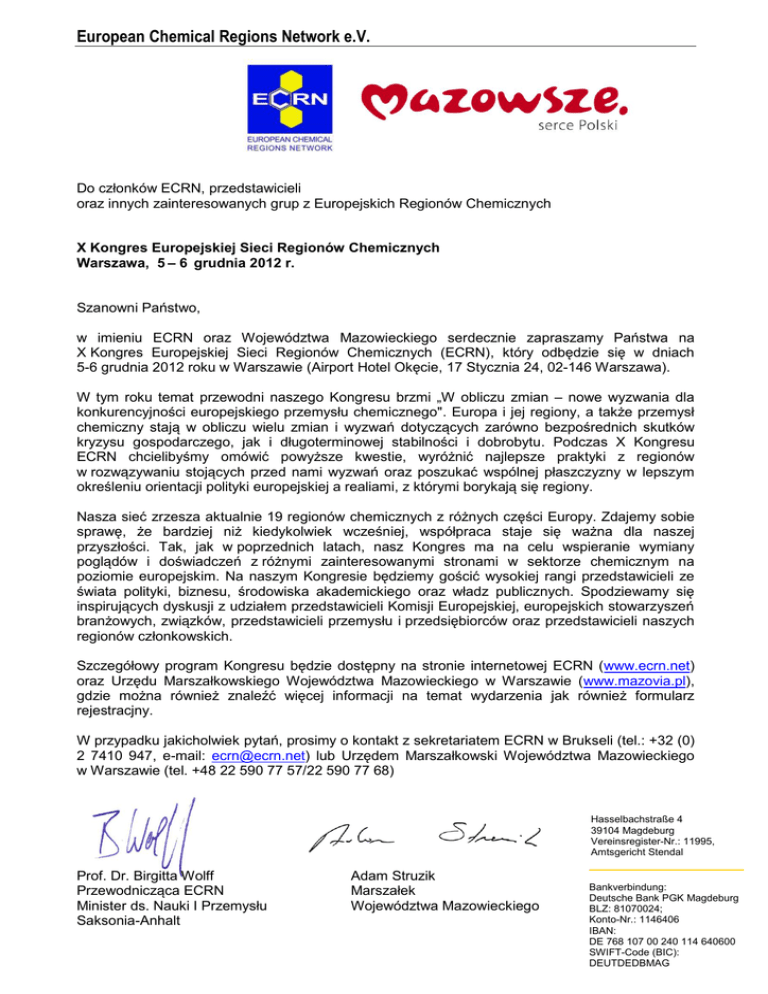 European Chemical Regions Network e.V. Do członków ECRN, przedstawicieli oraz innych zainteresowanych grup z Europejskich Regionów Chemicznych X Kongres Europejskiej Sieci Regionów Chemicznych Warszawa, 5 – 6 grudnia 2012 r. Szanowni Państwo, w imieniu ECRN oraz Województwa Mazowieckiego serdecznie zapraszamy Państwa na X Kongres Europejskiej Sieci Regionów Chemicznych (ECRN), który odbędzie się w dniach 5-6 grudnia 2012 roku w Warszawie (Airport Hotel Okęcie, 17 Stycznia 24, 02-146 Warszawa). W tym roku temat przewodni naszego Kongresu brzmi „W obliczu zmian – nowe wyzwania dla konkurencyjności europejskiego przemysłu chemicznego". Europa i jej regiony, a także przemysł chemiczny stają w obliczu wielu zmian i wyzwań dotyczących zarówno bezpośrednich skutków kryzysu gospodarczego, jak i długoterminowej stabilności i dobrobytu. Podczas X Kongresu ECRN chcielibyśmy omówić powyższe kwestie, wyróżnić najlepsze praktyki z regionów w rozwązywaniu stojących przed nami wyzwań oraz poszukać wspólnej płaszczyzny w lepszym określeniu orientacji polityki europejskiej a realiami, z którymi borykają się regiony. Nasza sieć zrzesza aktualnie 19 regionów chemicznych z różnych części Europy. Zdajemy sobie sprawę, że bardziej niż kiedykolwiek wcześniej, współpraca staje się ważna dla naszej przyszłości. Tak, jak w poprzednich latach, nasz Kongres ma na celu wspieranie wymiany poglądów i doświadczeń z różnymi zainteresowanymi stronami w sektorze chemicznym na poziomie europejskim. Na naszym Kongresie będziemy gościć wysokiej rangi przedstawicieli ze świata polityki, biznesu, środowiska akademickiego oraz władz publicznych. Spodziewamy się inspirujących dyskusji z udziałem przedstawicieli Komisji Europejskiej, europejskich stowarzyszeń branżowych, związków, przedstawicieli przemysłu i przedsiębiorców oraz przedstawicieli naszych regionów członkowskich. Szczegółowy program Kongresu będzie dostępny na stronie internetowej ECRN (www.ecrn.net) oraz Urzędu Marszałkowskiego Województwa Mazowieckiego w Warszawie (www.mazovia.pl), gdzie można również znaleźć więcej informacji na temat wydarzenia jak również formularz rejestracjny. W przypadku jakicholwiek pytań, prosimy o kontakt z sekretariatem ECRN w Brukseli (tel.: +32 (0) 2 7410 947, e-mail: [email protected]) lub Urzędem Marszałkowski Województwa Mazowieckiego w Warszawie (tel. +48 22 590 77 57/22 590 77 68) Hasselbachstraße 4 39104 Magdeburg Vereinsregister-Nr.: 11995, Amtsgericht Stendal Prof. Dr. Birgitta Wolff Przewodnicząca ECRN Minister ds. Nauki I Przemysłu Saksonia-Anhalt Adam Struzik Marszałek Województwa Mazowieckiego Bankverbindung: Deutsche Bank PGK Magdeburg BLZ: 81070024; Konto-Nr.: 1146406 IBAN: DE 768 107 00 240 114 640600 SWIFT-Code (BIC): DEUTDEDBMAG