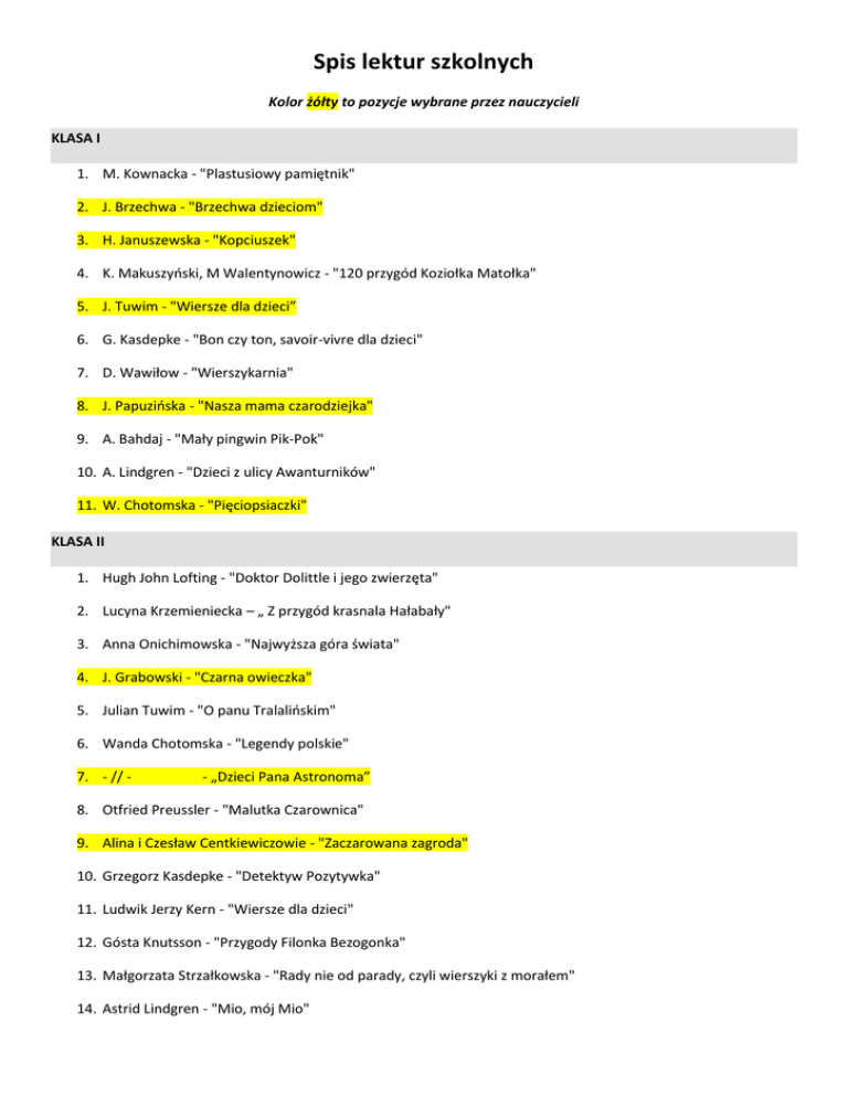 Spis lektur szkolnych Kolor żółty to pozycje wybrane przez nauczycieli KLASA I 1. M. Kownacka - "Plastusiowy pamiętnik" 2. J. Brzechwa - "Brzechwa dzieciom" 3. H. Januszewska - "Kopciuszek" 4. K. Makuszyński, M Walentynowicz - "120 przygód Koziołka Matołka" 5. J. Tuwim - "Wiersze dla dzieci” 6. G. Kasdepke - "Bon czy ton, savoir-vivre dla dzieci" 7. D. Wawiłow - "Wierszykarnia" 8. J. Papuzińska - "Nasza mama czarodziejka" 9. A. Bahdaj - "Mały pingwin Pik-Pok" 10. A. Lindgren - "Dzieci z ulicy Awanturników" 11. W. Chotomska - "Pięciopsiaczki" KLASA II 1. Hugh John Lofting - "Doktor Dolittle i jego zwierzęta" 2. Lucyna Krzemieniecka – „ Z przygód krasnala Hałabały" 3. Anna Onichimowska - "Najwyższa góra świata" 4. J. Grabowski - "Czarna owieczka" 5. Julian Tuwim - "O panu Tralalińskim" 6. Wanda Chotomska - "Legendy polskie" 7. - // - - „Dzieci Pana Astronoma” 8. Otfried Preussler - "Malutka Czarownica" 9. Alina i Czesław Centkiewiczowie - "Zaczarowana zagroda" 10. Grzegorz Kasdepke - "Detektyw Pozytywka" 11. Ludwik Jerzy Kern - "Wiersze dla dzieci" 12. Gósta Knutsson - "Przygody Filonka Bezogonka" 13. Małgorzata Strzałkowska - "Rady nie od parady, czyli wierszyki z morałem" 14. Astrid Lindgren - "Mio, mój Mio" KLASA III 1. J. Porazińska - "Szewczyk Dratewka" ( październik kl.3B) 2. Krystyna Drzewiecka – „ Piątka z Zakątka” kl. 3 A i C 3. Jan Grabowski - "Puc, Bursztyn i goście" ( listopad kl. 3B) 4. Astrid Lindgren - "Dzieci z Bullerbym" ( grudzień kl. 3 B) 5. Elżbieta Zubrzycka – „ Słup soli” kl. 3 Ai C 6. Leo Buscaglia – „ Jesień liścia Jasia” kl. 3 A i C 7. Alina i Czesław Centkiewiczowie - "Anaruk, chłopiec z Grenlandii" ( styczeń/luty kl.B) 8. Hans Christian Andersen - "Baśnie" ( marzec/kwiecień kl. 3B) 9. Maria Kriiger - "Karolcia" (maj kl. 3B) 10. Roman Pisarski - "O psie, który jeździł koleją" (czerwiec kl. 3B) 11. Anna Onichimowska - "Daleki rejs" 12. Józef Ratajczak - "Ziarenka maku" 13. Monika Krajewska – „Mój młodszy barat” kl. 3 A i C 14. Alan A. Milne – „ Kubuś Puchatek” kl. 3 A i C 15. Grzegorz Kasdepke - "Mitologia" 16. - // - - „ Co to znaczy…” kl. 3 A i C 17. Małgorzata Strzałkowska – „ Raj na ziemi” kl. 3 A i C 18. Mira Jaworczakowa - "Oto jest Kasia" 19. Marek Kamiński – „ Marek – chłopiec, który miał marzenia” kl. 3 A i C 20. Astrid Lindgren - "Ronja, córka zbójnika" 21. - // - - „ Dzieci z Builerbyn” kl. 3 A i C 22. Jean-Jacques Sempé, René Goscinny - "Wakacje Mikołajka" (fragmenty) KLASA IV 1. C. Collodi - "Pinokio" kl. 4B- październik / 4A- listopad 2. J. Korczakowska - "Spotkanie nad morzem" 3. J. Brzechwa - "Akademia Pana Kleksa"kl. 4B październik / 4A- listopad 4. M. Kownacka - "Rogaś z Doliny Roztoki" 5. Anna Onichimowska – „Duch starej kamienicy” kl. 4B- luty / 4A marzec 6. W. Gomulicki - "Wspomnienia niebieskiego mundurka" 7. M. Twain - "Przygody Tomka Sawyera" 8. C. S. Lewis – „Lew, czarownica i stara szafa” kl4B- marzec / 4A luty 9. H. Sienkiewicz - "Janko Muzykant" 10. R. Goscinny, J-J. Sempé - "Mikołajek i inne chłopaki" KLASA V 1. Jan Parandowski – „Mitilogia” kl. 5B- wrzesień 2. H. Sienkiewicz - "W pustyni i w puszczy" kl. 5B- listopad 3. L. M. Montgomery - "Ania z Zielonego Wzgórza" kl.5 B- październik 4. F. Molnar - "Chłopcy z Placu Broni" 5. J. K. Rowling – „ Harry Pottrr i kamień filozoficzny” kl. 5B- luty 6. Joanna Olech – „ Dynastia Miziołków” kl. 5B- kwiecień 7. A. Oppman - "Legendy warszawskie" 8. F. H. Burnett - "Tajemniczy ogród". 9. B. Prus - "Kamizelka" 10. - // - - "Katarynka" 11. H. Sienkiewicz - "Z legend dawnego Egiptu" KLASA VI 1. J. Jurgielewiczowa - "Ten obcy" 2. E. Niziurski - "Sposób na Alcybiadesa" 3. J. R. R. Tolkien – „Hobbit czyli tam i z powrotem” 4. K. Makuszyński - "Szatan z siódmej klasy" 5. D. Defoe - "Przypadki Robinsona Kruzoe" 6. H. Sienkiewicz - "Sachem" 7. J. K. Rowling – „ Harry Pottrr i kamień filozoficzny” 8. Karol Dickens – „Opowieść wigilijna” 9. S. Lem - "Bajki robotów" 10. Małgorzata Musierowicz – książki z serii „Jeżycjada” 11. Alfred Szklarski – „Tomek w krainie kangurów”