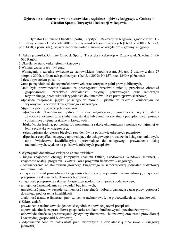Ogłoszenie o naborze na wolne stanowisko urzędnicze – główny księgowy, w Gminnym Ośrodku Sportu, Turystyki i Rekreacji w Rzgowie. Dyrektor Gminnego Ośrodka Sportu, Turystyki i Rekreacji w Rzgowie, zgodnie z art. 1113 ustawy z dnia 21 listopada 2008 r. o pracownikach samorządowych (Dz.U. z 2008 r. Nr 223, poz. 1458, z późn. zm.), ogłasza nabór na wolne stanowisko urzędnicze – główny księgowy. 1. Adres jednostki: Gminny Ośrodek Sportu, Turystyki i Rekreacji w Rzgowie,ul. Szkolna 5, 95030 Rzgów 2.Określenie stanowiska: główny księgowy 3.Wymiar czasu pracy: 1/4 etatu 4.Wymagania niezbędne związane ze stanowiskiem (zgodnie z art. 54, ust. 2 ustawy z dnia 27 sierpnia 2009r. o finansach publicznych (Dz.U. z 2009r. Nr.157, poz. 1240 z późn.zm.): 1)jest obywatelem polskim, 2)ma pełną zdolność do czynności prawnych oraz korzysta z pełni praw publicznych, 3)nie była prawomocnie skazana za przestępstwo przeciwko mieniu, przeciwko obrotowi gospodarczemu, przeciwko działalności instytucji państwowych oraz samorządu terytorialnego, przeciwko wiarygodności dokumentów lub za przestępstwo skarbowe, 4)posiada znajomość języka polskiego w mowie i piśmie w zakresie koniecznym do wykonywania obowiązków głównego księgowego 5)spełnia jeden z poniższych warunków: a)ukończyła ekonomiczne jednolite studia magisterskie, ekonomiczne wyższe studia zawodowe, ekonomiczne studia magisterskie lub ekonomiczne studia podyplomowe i posiada co najmniej 3-letnią praktykę w księgowości, b)ukończyła średnią, policealną lub pomaturalną szkołę ekonomiczną i posiada co najmniej 6letnią praktykę w księgowości, c)jest wpisana do rejestru biegłych rewidentów na podstawie odrębnych przepisów, d)posiada certyfikat księgowy uprawniający do usługowego prowadzenia ksiąg rachunkowych, albo świadectwo kwalifikacyjne uprawniające do usługowego prowadzenia ksiąg rachunkowych, wydane na podstawie odrębnych przepisów. 5.Wymagania dodatkowe związane ze stanowiskiem: - biegła znajomość obsługi komputera (pakietu Office, Środowiska Windows, Internet), znajomość obsługi programu „Płatnik” oraz programu finansowo-księgowego, - doświadczenie na stanowisku głównego księgowego w samorządowej jednostce budżetowej minimum 3 lata, - znajomość zasad prowadzenia księgowości budżetowej w jednostce samorządowej , znajomość przepisów z zakresu rachunkowości budżetowej, - znajomość przepisów z zakresu ubezpieczeń społecznych i prawa podatkowego, - umiejętność sporządzania sprawozdań budżetowych, - umiejętność pracy w zespole, sumienność i rzetelność, dobra organizacja czasu pracy, gotowość do stałego podnoszenia kwalifikacji - znajomość ustaw: o finansach publicznych, o rachunkowości, o pracownikach samorządowych, 6.Zakres zadań: - prowadzenie rachunkowości jednostki zgodnie z obowiązującymi przepisami, - odpowiedzialność za prawidłową gospodarkę środkami budżetowymi i pozabudżetowymi, - odpowiedzialność za przestrzeganie dyscypliny finansowo - budżetowej oraz zasad prawidłowej i oszczędnej gospodarki budżetowej, - odpowiedzialność za całokształt prac związanych z działalnością finansowo - księgową jednostki, - dokonywanie wstępnej kontroli kompletności i rzetelności dokumentów dotyczących operacji finansowych, - dokonywanie wstępnej kontroli zgodności operacji finansowych z planem finansowym, - sporządzanie sprawozdań finansowych jednostki, 7.Wymagane dokumenty: - życiorys (CV) wraz ze zgodą na przetwarzanie danych osobowych do celów rekrutacyjnych, - list motywacyjny, - dokumenty potwierdzające kwalifikacje wymagane do zajmowania stanowiska głównego księgowego, - dokumenty potwierdzające odpowiedni staż pracy, - oświadczenie o niekaralności, - kserokopia dowodu osobistego, - inne dokumenty potwierdzające posiadane kwalifikacje i umiejętności, 8.Termin, sposób i miejsce składania dokumentów aplikacyjnych: KANDYDACI ZOBOWIĄZANI SĄ DO: 1)Złożenia dokumentów wymienionych w punkcie 7, w zamkniętej kopercie A4, na której należy Umieścić imię i nazwisko kandydata oraz tytuł postępowania „Nabór na stanowisko głównego księgowego w Gminnym Ośrodku Sportu, Turystyki i Rekreacji w Rzgowie”, na kopercie nie należy umieszczać żadnych innych informacji. 2)Złożenia dokumentów w terminie do dnia 12.03.2012 r., do godz. 15.00 w sekretariacie Urzędu Miejskiego w Rzgowie, 95-030 Rzgów, Pl.500-lecia 22, w przypadku nadsyłania dokumentów pocztą liczy się data wpływu dokumentów do sekretariatu Urzędu Miejskiego w Rzgowie. Dokumenty, które wpłyną po terminie nie będą rozpatrywane. 3)Nie ma możliwości przekazywania dokumentów drogą elektroniczną. 9.Informacje dodatkowe: 1)Kandydaci spełniający wymogi formalne zobowiązani są do poddania się rozmowie kwalifikacyjnej. 2)O terminie i miejscu przeprowadzenia rozmowy kwalifikacyjnej kandydaci spełniający wymagania formalne zostaną powiadomieni indywidualnie – telefonicznie. 3)informacja o wyborze kandydata na stanowisko głównego księgowego w Gminnym Ośrodku Sportu, Turystyki i Rekreacji w Rzgowie zostanie umieszczona na stronie internetowej: http://bip.rzgow.tensoft.pl oraz na tablicy ogłoszeń Urzędu Miejskiego w Rzgowie Na podstawie art. 13 ust. 2 pkt 4b ustawy o pracownikach samorządowych (Dz.U. z 2008r. Nr 223, poz. 1458 ze zm.) informuję, że w miesiącu lutym br. wskaźnik zatrudnienia osób niepełnosprawnych w Gminnym Ośrodku Sportu, Turystyki i Rekreacji w Rzgowie w rozumieniu przepisów o rehabilitacji zawodowej i społecznej oraz zatrudnianiu osób niepełnosprawnych nie osiągał 6 % ogółu zatrudnionych. Dyrektor Gminnego Ośrodka Sportu, Turystyki i Rekreacji w Rzgowie Wojciech Skibiński