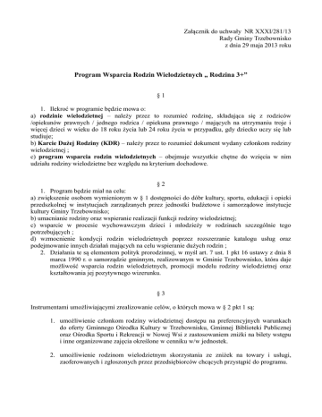 Załącznik do uchwały NR XXXI/281/13 Rady Gminy Trzebownisko z dnia 29 maja 2013 roku Program Wsparcia Rodzin Wielodzietnych „ Rodzina 3+” §1 1. Ilekroć w programie będzie mowa o: a) rodzinie wielodzietnej – należy przez to rozumieć rodzinę, składająca się z rodziców /opiekunów prawnych / jednego rodzica / opiekuna prawnego / mających na utrzymaniu troje i więcej dzieci w wieku do 18 roku życia lub 24 roku życia w przypadku, gdy dziecko uczy się lub studiuje; b) Karcie Dużej Rodziny (KDR) – należy przez to rozumieć dokument wydany członkom rodziny wielodzietnej ; c) program wsparcia rodzin wielodzietnych – obejmuje wszystkie chętne do wzięcia w nim udziału rodziny wielodzietne bez względu na kryterium dochodowe. §2 1. Program będzie miał na celu: a) zwiększenie osobom wymienionym w § 1 dostępności do dóbr kultury, sportu, edukacji i opieki przedszkolnej w instytucjach zarządzanych przez jednostki budżetowe i samorządowe instytucje kultury Gminy Trzebownisko; b) umacnianie rodziny oraz wspieranie realizacji funkcji rodziny wielodzietnej; c) wsparcie w procesie wychowawczym dzieci i młodzieży w rodzinach szczególnie tego potrzebujących ; d) wzmocnienie kondycji rodzin wielodzietnych poprzez rozszerzanie katalogu usług oraz podejmowanie innych działań mających na celu wspieranie dużych rodzin ; 2. Działania te są elementem polityk prorodzinnej, w myśl art. 7 ust. 1 pkt 16 ustawy z dnia 8 marca 1990 r. o samorządzie gminnym, realizowanym w Gminie Trzebownisko, która daje możliwość wsparcia rodzin wielodzietnych, promocji modelu rodziny wielodzietnej oraz kształtowania jej pozytywnego wizerunku. §3 Instrumentami umożliwiającymi zrealizowanie celów, o których mowa w § 2 pkt 1 są: 1. umożliwienie członkom rodziny wielodzietnej dostępu na preferencyjnych warunkach do oferty Gminnego Ośrodka Kultury w Trzebownisku, Gminnej Biblioteki Publicznej oraz Ośrodka Sportu i Rekreacji w Nowej Wsi z zastosowaniem zniżki na bilety wstępu i inne organizowane zajęcia określone w cenniku w/w jednostek. 2. umożliwienie rodzinom wielodzietnym skorzystania ze zniżek na towary i usługi, zaoferowanych i zgłoszonych przez przedsiębiorców chcących przystąpić do programu. §4 Środki niezbędne na realizację programu pokrywane będą z budżetu Gminy Trzebownisko. §5 Jednostką koordynującą realizację programu będzie Urząd Miejski w Głogowie Małopolskim, który prowadził będzie ewidencję rodzin, którym wydano KDR oraz udostępniał informacje o zakresie programu. §6 W celu realizacji instrumentów Programu możliwe jest zawieranie porozumień z innymi jednostkami, które nie podlegają Gminie Trzebownisko. §7 1. Jako potwierdzenie uprawnień do korzystania z instrumentów, o których mowa w § 3 wprowadza się KARTĘ DUŻEJ RODZINY (KDR). Wzór KDR stanowi załącznik Nr 1 do "Programu ". 2. KDR będzie ważna jeden rok od dnia wydania. 3. KDR będzie otrzymywał każdy członek rodziny wielodzietnej. 4. KDR jest imienna, ważna z innym dokumentem potwierdzającym tożsamość. KDR dziecka do lat 7 ważna jest z dokumentem potwierdzającym tożsamość rodzica/opiekuna. 5. Wydanie karty nastąpi w ciągu 30 dni od dnia złożenia kompletnego wniosku i jest bezpłatne. §8 Uzyskanie KDR odbywać się będzie na wniosek rodzica lub opiekuna prawnego złożony w sekretariacie Urzędu Miejskiego. Wzór wniosku stanowi załącznik Nr 2 do "Programu". §9 1. Promocja działań podejmowanych w ramach programu obejmować będzie informację lub ogłoszenia zamieszczane w lokalnej prasie, na stronie internetowej Gminy Trzebownisko, na tablicach ogłoszeniowych i poprzez placówki oświatowe. 2. Działania informacyjne o programie realizowane będą również poprzez prowadzenie odrębnej strony internetowej programu, na której udostępniane będą informacje o aktualnej ofercie objętej programem. Załącznik Nr 2 do Programu …...................................................................... Trzebownisko …........................... ( imię i nazwisko ) …...................................................................... ( adres ) …...................................................................... ( seria i numer dowodu osobistego ) ….................................................................... ( nr telefonu ) WNIOSEK o wydanie KARTY DUŻEJ RODZINY Wnoszę o wydanie KARTY DUŻEJ RODZINY . Oświadczam, że moja rodzina składa się z następujących osób wspólnie zamieszkałych pod wskazanym adresem : Lp. Imię i nazwisko 1 stopień pokrewieństwa data urodzenia wnioskodawca 2 3 4 5 6 7 8 9 10 Do wniosku dołączam : Zaświadczenie, legitymację lub inny dokument potwierdzający kontynuowanie nauki dla dzieci powyżej 18 roku życia. Wyrażam zgodę na przetwarzanie moich danych osobowych zawartych we wniosku o wydanie KARTY DUŻEJ RODZINY, zgodnie z ustawą z dnia 29 sierpnia 1997 roku o ochronie danych osobowych ( t.j. Dz. U. z 2002 r. Nr 101, poz. 926 z późn. zm. ) przez podmioty uprawnione do realizacji programu …................................................................................................... ( data, czytelny podpis ) Dane są zgodne z danymi Ewidencji Ludności Urzędu Gminy Trzebownisko. ….................................................................................. ( data i podpis pracownika Ewidencji Ludności )