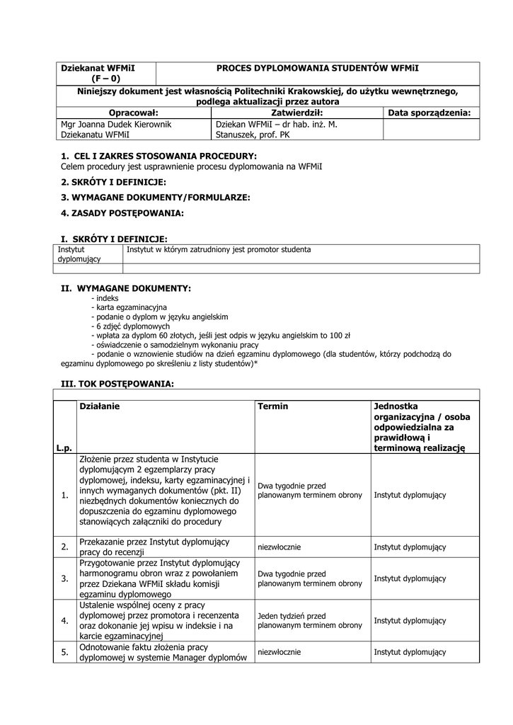 Dziekanat WFMiI PROCES DYPLOMOWANIA STUDENTÓW WFMiI (F – 0) Niniejszy dokument jest własnością Politechniki Krakowskiej, do użytku wewnętrznego, podlega aktualizacji przez autora Opracował: Zatwierdził: Data sporządzenia: Mgr Joanna Dudek Kierownik Dziekan WFMiI – dr hab. inż. M. Dziekanatu WFMiI Stanuszek, prof. PK 1. CEL I ZAKRES STOSOWANIA PROCEDURY: Celem procedury jest usprawnienie procesu dyplomowania na WFMiI 2. SKRÓTY I DEFINICJE: 3. WYMAGANE DOKUMENTY/FORMULARZE: 4. ZASADY POSTĘPOWANIA: I. SKRÓTY I DEFINICJE: Instytut dyplomujący Instytut w którym zatrudniony jest promotor studenta II. WYMAGANE DOKUMENTY: - indeks - karta egzaminacyjna - podanie o dyplom w języku angielskim - 6 zdjęć dyplomowych - wpłata za dyplom 60 złotych, jeśli jest odpis w języku angielskim to 100 zł - oświadczenie o samodzielnym wykonaniu pracy - podanie o wznowienie studiów na dzień egzaminu dyplomowego (dla studentów, którzy podchodzą do egzaminu dyplomowego po skreśleniu z listy studentów)* III. TOK POSTĘPOWANIA: Działanie Termin L.p. 1. 2. 3. 4. 5. Złożenie przez studenta w Instytucie dyplomującym 2 egzemplarzy pracy dyplomowej, indeksu, karty egzaminacyjnej i Dwa tygodnie przed innych wymaganych dokumentów (pkt. II) planowanym terminem obrony niezbędnych dokumentów koniecznych do dopuszczenia do egzaminu dyplomowego stanowiących załączniki do procedury Przekazanie przez Instytut dyplomujący pracy do recenzji Przygotowanie przez Instytut dyplomujący harmonogramu obron wraz z powołaniem przez Dziekana WFMiI składu komisji egzaminu dyplomowego Ustalenie wspólnej oceny z pracy dyplomowej przez promotora i recenzenta oraz dokonanie jej wpisu w indeksie i na karcie egzaminacyjnej Odnotowanie faktu złożenia pracy dyplomowej w systemie Manager dyplomów Jednostka organizacyjna / osoba odpowiedzialna za prawidłową i terminową realizację Instytut dyplomujący niezwłocznie Instytut dyplomujący Dwa tygodnie przed planowanym terminem obrony Instytut dyplomujący Jeden tydzień przed planowanym terminem obrony Instytut dyplomujący niezwłocznie Instytut dyplomujący Przekazanie do Dziekanatu WFMiI pełnej dokumentacji niezbędnej do przygotowania egzaminu dyplomowego: - zestawienie imienne studentów wraz z wskazaniem tematu pracy dyplomowej, promotora i recenzenta, - indeks + karta egzaminacyjna, - opinia promotora z recenzją, 6. oświadczenie o samodzielnym wykonaniu pracy podchodzą do egzaminu dyplomowego skreśleniu z listy studentów)* 7. 8. nie później niż na 7 dni przed - podanie o wznowieniu studiów na dzień egzaminem dyplomowym egzaminu dyplomowego(dla studentów, którzy Instytut dyplomujący po - ewentualnie podanie o odpis dyplomu i suplementu w języku angielskim, - 6 zdjęć, - legitymacja studencka dla studentów studiów II stopnia. Przekazanie przez Dziekanat dokumentacji niezbędnej do przeprowadzenia egzaminu dyplomowego: - indeks, - protokół egzaminu dyplomowego, - opinia promotora wraz z recenzją, - informacja o konieczności wyegzekwowania odbiory legitymacji studenckiej przez komisję obrony pracy, - karta odejścia dla studenta Odbiór przez Dziekanat dokumentacji po przeprowadzeniu egzaminu dyplomowego - 1 egzemplarz pracy dyplomowej z wpisaną ocena uzgodnioną przez promotora i recenzenta, - indeks, - protokół egzaminu dyplomowego, - opinia promotora i recenzja - odebrane legitymacje studenckie. jeden dzień przed rozpoczęciem Upoważniony pracownik egzaminu dyplomowego Dziekanatu WFMiI nie później niż 7 dni po egzaminie dyplomowym Upoważniony pracownik Dziekanatu WFMiI 5. PODSTAWY PRAWNE: 1) Rozporządzenie MNiSW z dnia 2 listopada 2006 r. w sprawie dokumentacji przebiegu studiów (Dz. U. Nr 224, poz. 1634 z późn. zm.), 2) Regulamin studiów na PK 3) Zarządzenie nr 22 Rektora PK z dnia 19 lipca 2007 r. w sprawie zasad gospodarowania drukami ścisłego zarachowania na PK. 6. UWAGI/KONTAKT: Kierownik Dziekanatu WFMiI mgr Joanna Dudek tel. (12) 628 31 51, mail: [email protected] 7. ZAŁĄCZNIKI: - wzór podania o odpis dyplomu i suplementu w języku angielskim - świadczenie o samodzielnym wykonaniu pracy - wzór podania o wznowienie studiów na dzień egzaminu dyplomowego - wzór strony tytułowej pracy