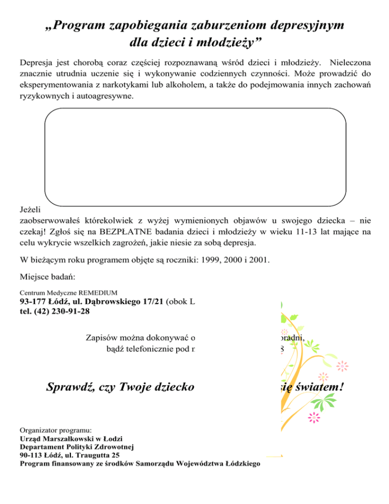 „Program zapobiegania zaburzeniom depresyjnym dla dzieci i młodzieży” młodzie Depresja jest chorobą coraz częś częściej rozpoznawaną wśród ród dzieci i młodzie młodzieży. Nieleczona znacznie utrudnia uczenie sięę i wykonywanie codziennych czynności. czynno Mo Może prowadzić do eksperymentowania z narkotykami lub alkoholem, a także tak e do podejmowania innych zachowa zachowań ryzykownych i autoagresywne. Depresja może mo się kryć pod maską wielu objawów: objawy fizyczne: bóle głowy, karku, kończyn, ko brzucha; zaburzenia snu (bezsenność lub nadmierna senność); poczucie osamotnienia; zamartwianie się;ciągłe ę ągłe zmęczenie; zm zaburzenia koncentracji i uwagi; niechęć do siebie; brak apetytu; brak zainteresowańń i radości. radoś izolacja; Jeżeli zaobserwowałeś którekolwiek z wyżej wy ej wymienionych objawów u swojego swo dziecka – nie czekaj! Zgłoś się na BEZPŁATNE badania dzieci i młodzieży młodzieży w wieku 11 11-13 lat mające na celu wykrycie wszelkich zagrożeń żeń, jakie niesie za sobą depresja. W bieżącym cym roku programem obję objęte są roczniki: 1999, 2000 i 2001. Miejsce badań: Centrum Medyczne REMEDIUM 93-177 Łódź, ul. Dąbrowskiego browskiego 17/21 (obok Lidla) tel. (42) 230-91-28 Zapisów można żna dokonywać dokonywa osobiście cie w rejestracji poradni, bądź ą ź telefonicznie pod numerem (42) 230 230-91-28 28 Sprawdź,, czy Twoje dziecko potrafi cieszy cieszyćć się światem! ś Organizator programu: Urząd Marszałkowski w Łodzi Departament Polityki Zdrowotnej 90-113 Łódź, ul. Traugutta 25 Program finansowany ze środków rodków Samorządu Samorz Województwa Łódzkiego