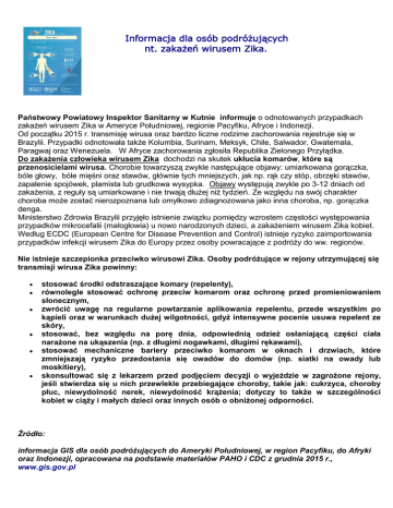Informacja dla osób podróżujących nt. zakażeń wirusem Zika. Państwowy Powiatowy Inspektor Sanitarny w Kutnie informuje o odnotowanych przypadkach zakażeń wirusem Zika w Ameryce Południowej, regionie Pacyfiku, Afryce i Indonezji. Od początku 2015 r. transmisję wirusa oraz bardzo liczne rodzime zachorowania rejestruje się w Brazylii. Przypadki odnotowała także Kolumbia, Surinam, Meksyk, Chile, Salwador, Gwatemala, Paragwaj oraz Wenezuela. W Afryce zachorowania zgłosiła Republika Zielonego Przylądka. Do zakażenia człowieka wirusem Zika dochodzi na skutek ukłucia komarów, które są przenosicielami wirusa. Chorobie towarzyszą zwykle następujące objawy: umiarkowana gorączka, bóle głowy, bóle mięśni oraz stawów, głównie tych mniejszych, jak np. rąk czy stóp, obrzęki stawów, zapalenie spojówek, plamista lub grudkowa wysypka. Objawy występują zwykle po 3-12 dniach od zakażenia, z reguły są umiarkowane i nie trwają dłużej niż tydzień. Ze względu na swój charakter choroba może zostać nierozpoznana lub omyłkowo zdiagnozowana jako inna choroba, np. gorączka denga. Ministerstwo Zdrowia Brazylii przyjęło istnienie związku pomiędzy wzrostem częstości występowania przypadków mikrocefalii (małogłowia) u nowo narodzonych dzieci, a zakażeniem wirusem Zika kobiet. Według ECDC (European Centre for Disease Prevention and Control) istnieje ryzyko zaimportowania przypadków infekcji wirusem Zika do Europy przez osoby powracające z podróży do ww. regionów. Nie istnieje szczepionka przeciwko wirusowi Zika. Osoby podróżujące w rejony utrzymującej się transmisji wirusa Zika powinny: stosować środki odstraszające komary (repelenty), równolegle stosować ochronę przeciw komarom oraz ochronę przed promieniowaniem słonecznym, zwrócić uwagę na regularne powtarzanie aplikowania repelentu, przede wszystkim po kąpieli oraz w warunkach dużej wilgotności, gdyż intensywne pocenie usuwa repelent ze skóry, stosować, bez względu na porę dnia, odpowiednią odzież osłaniającą części ciała narażone na ukąszenia (np. z długimi nogawkami, długimi rękawami), stosować mechaniczne bariery przeciwko komarom w oknach i drzwiach, które zmniejszają ryzyko przedostania się owadów do domów (np. siatki na owady lub moskitiery), skonsultować się z lekarzem przed podjęciem decyzji o wyjeździe w zagrożone rejony, jeśli stwierdza się u nich przewlekle przebiegające choroby, takie jak: cukrzyca, choroby płuc, niewydolność nerek, niewydolność krążenia; dotyczy to także w szczególności kobiet w ciąży i małych dzieci oraz innych osób o obniżonej odporności. Źródło: informacja GIS dla osób podróżujących do Ameryki Południowej, w region Pacyfiku, do Afryki oraz Indonezji, opracowana na podstawie materiałów PAHO i CDC z grudnia 2015 r., www.gis.gov.pl
