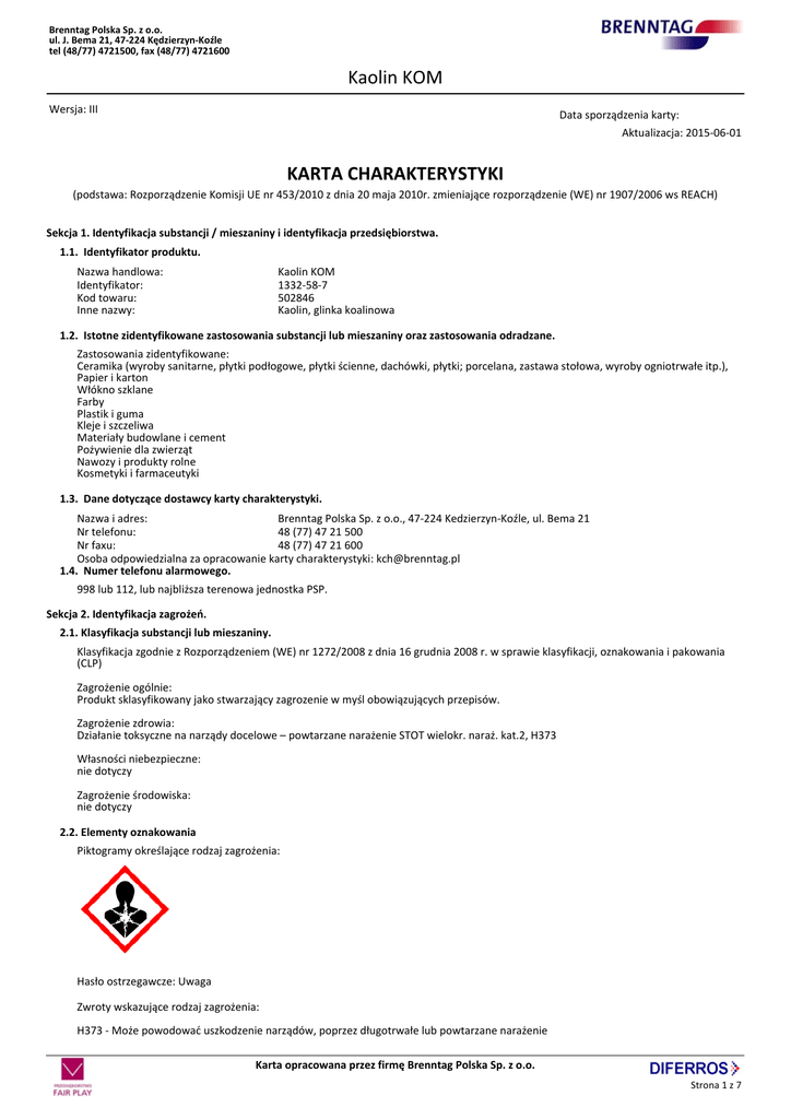 Brenntag Polska Sp. z o.o. ul. J. Bema 21, 47-224 Kędzierzyn-Koźle tel (48/77) 4721500, fax (48/77) 4721600 Kaolin KOM Wersja: III Data sporządzenia karty: __________ Aktualizacja: 2015-06-01 KARTA CHARAKTERYSTYKI (podstawa: Rozporządzenie Komisji UE nr 453/2010 z dnia 20 maja 2010r. zmieniające rozporządzenie (WE) nr 1907/2006 ws REACH) Sekcja 1. Identyfikacja substancji / mieszaniny i identyfikacja przedsiębiorstwa. 1.1. Identyfikator produktu. Nazwa handlowa: Identyfikator: Kod towaru: Inne nazwy: Kaolin KOM 1332-58-7 502846 Kaolin, glinka koalinowa 1.2. Istotne zidentyfikowane zastosowania substancji lub mieszaniny oraz zastosowania odradzane. Zastosowania zidentyfikowane: Ceramika (wyroby sanitarne, płytki podłogowe, płytki ścienne, dachówki, płytki; porcelana, zastawa stołowa, wyroby ogniotrwałe itp.), Papier i karton Włókno szklane Farby Plastik i guma Kleje i szczeliwa Materiały budowlane i cement Pożywienie dla zwierząt Nawozy i produkty rolne Kosmetyki i farmaceutyki 1.3. Dane dotyczące dostawcy karty charakterystyki. Nazwa i adres: Brenntag Polska Sp. z o.o., 47-224 Kedzierzyn-Koźle, ul. Bema 21 Nr telefonu: 48 (77) 47 21 500 Nr faxu: 48 (77) 47 21 600 Osoba odpowiedzialna za opracowanie karty charakterystyki: [email protected] 1.4. Numer telefonu alarmowego. 998 lub 112, lub najbliższa terenowa jednostka PSP. Sekcja 2. Identyfikacja zagrożeń. 2.1. Klasyfikacja substancji lub mieszaniny. Klasyfikacja zgodnie z Rozporządzeniem (WE) nr 1272/2008 z dnia 16 grudnia 2008 r. w sprawie klasyfikacji, oznakowania i pakowania (CLP) Zagrożenie ogólnie: Produkt sklasyfikowany jako stwarzający zagrozenie w myśl obowiązujących przepisów. Zagrożenie zdrowia: Działanie toksyczne na narządy docelowe – powtarzane narażenie STOT wielokr. naraż. kat.2, H373 Własności niebezpieczne: nie dotyczy Zagrożenie środowiska: nie dotyczy 2.2. Elementy oznakowania Piktogramy określające rodzaj zagrożenia: Hasło ostrzegawcze: Uwaga Zwroty wskazujące rodzaj zagrożenia: H373 - Może powodować uszkodzenie narządów, poprzez długotrwałe lub powtarzane narażenie Karta opracowana przez firmę Brenntag Polska Sp. z o.o. Strona 1 z 7 Brenntag Polska Sp. z o.o. ul. J. Bema 21, 47-224 Kędzierzyn-Koźle tel (48/77) 4721500, fax (48/77) 4721600 Kaolin KOM Zwroty określające warunki bezpiecznego stosowania: P260 - Nie wdychać pyłu/dymu/gazu/mgły/par/rozpylonej cieczy. P285 - W przypadku niedostatecznej wentylacji stosować indywidualne środki ochrony dróg oddechowych P501 - Zawartość/pojemnik usuwać do upoważnionego odbiorcy odpadów 2.3. Inne zagrożenia. W zależności od rodzaju postępowania i zastosowania (np. mielenie, suszenie) może być wytwarzana unosząca się w powietrzu respirabilna krzemionka krystaliczna. Długotrwałe i/lub intensywne wdychanie respirabilnej krzemionki krystalicznej może spowodować zwłóknienie płuc, zwane powszechnie pylicą krzemową. Głównymi objawami pylicy krzemowej są kaszel i bezdech. Wystawienie na działanie pyłu krzemionki krystalicznej w związku z wykonywanym zawodem powinno być monitorowane i kontrolowane Kryteria opisane w załączniku XIII (właściwości PBT i vPvB) nie mają zastosowania dla substancji nieorganicznych. Sekcja 3. Skład / informacja o składnikach. Skład wg Rozporządzenia 1272/2008. zawiera: 1-10% kwarcu (STOT RE 1, H372; CAS: 14808-60-7; WE: 238-878-4) ok. 99% Mieszanina glinokrzemianów, głownie kaolinitu i illitu z niewielką ilością skalenia oraz kwarcu Nr CAS: 1332-58-7 Nr indeksowy: nie dotyczy Nr WE: 310-194-1 Sekcja 4. Środki pierwszej pomocy. 4.1. Opis środków pierwszej pomocy. Wdychanie: W razie narażenia na wdychanie pyłu wyjść na świeże powietrze. Kontakt ze skórą: W razie kontaktu ze skórą zmyć wodą z mydłem. Nawilżyć skórę. Kontakt z oczami: W razie dostania się do oczu płukać dużą ilością wody. Jjeśli podrażnienie utrzymuje się, skontaktować się z lekarzem Spożycie: W razie połknięcia przepłukać usta, wypić dużą ilość wody, skorzystać z pomocy medycznej. 4.2. Najważniejsze ostre i opóźnione objawy oraz skutki narażenia. Nie są obserwowane skutki oraz objawy ostre i opóźnione. 4.3. Wskazania dotyczące wszelkiej natychmiastowej pomocy lekarskiej i szczególnego postępowania z poszkodowanym. Nie są wymagane żadne specjalne działania Sekcja 5. Postępowanie w przypadku pożaru. 5.1. Środki gaśnicze. Pożary w obecności produktu gasić środkami odpowiednimi dla palących się materiałów. 5.2. Szczególne zagrożenia związane z substancją lub mieszaniną. Produkt niepalny. Brak rozkładu termicznego. 5.3. Informacje dla straży pożarnej. brak szczególnych zaleceń Sekcja 6. Postępowanie w przypadku niezamierzonego uwolnienia do środowiska. 6.1. Indywidualne środki ostrożności, wyposażenie ochronne i procedury w sytuacjach awaryjnych. Używać sprzętu ochrony osobistej. Unikać rozpylania produktu w powietrzu, nie wdychać pyłu; zapewnić odpowiednią wentylację w pomieszczeniach zamkniętych 6.2. Środki ostrożności w zakresie ochrony środowiska. Zapobiec rozprzestrzenianiu się lub dostaniu do kanalizacji, rowów, rzek. 6.3. Metody i materiały zapobiegające rozprzestrzenianiu się skażenia i służące do usuwania skażenia. Unikać zmiatania na sucho i używać systemów czyszczących z rozpylaniem wody lub próżniowych, aby zapobiec tworzeniu unoszącego się w powietrzu pyłu 6.4. Odniesienia do innych sekcji. Karta opracowana przez firmę Brenntag Polska Sp. z o.o. Strona 2 z 7 Brenntag Polska Sp. z o.o. ul. J. Bema 21, 47-224 Kędzierzyn-Koźle tel (48/77) 4721500, fax (48/77) 4721600 Kaolin KOM patrz sekcja. 8 oraz sekcja 13 Sekcja 7. Postępowanie z substancjami i mieszaninami oraz ich magazynowanie. 7.1. Środki ostrożności dotyczące bezpiecznego postępowania. Unikać tworzenia pyłu unoszącego się w powietrzu. W miejscach tworzenia się pyłu unoszącego się w powietrzu z