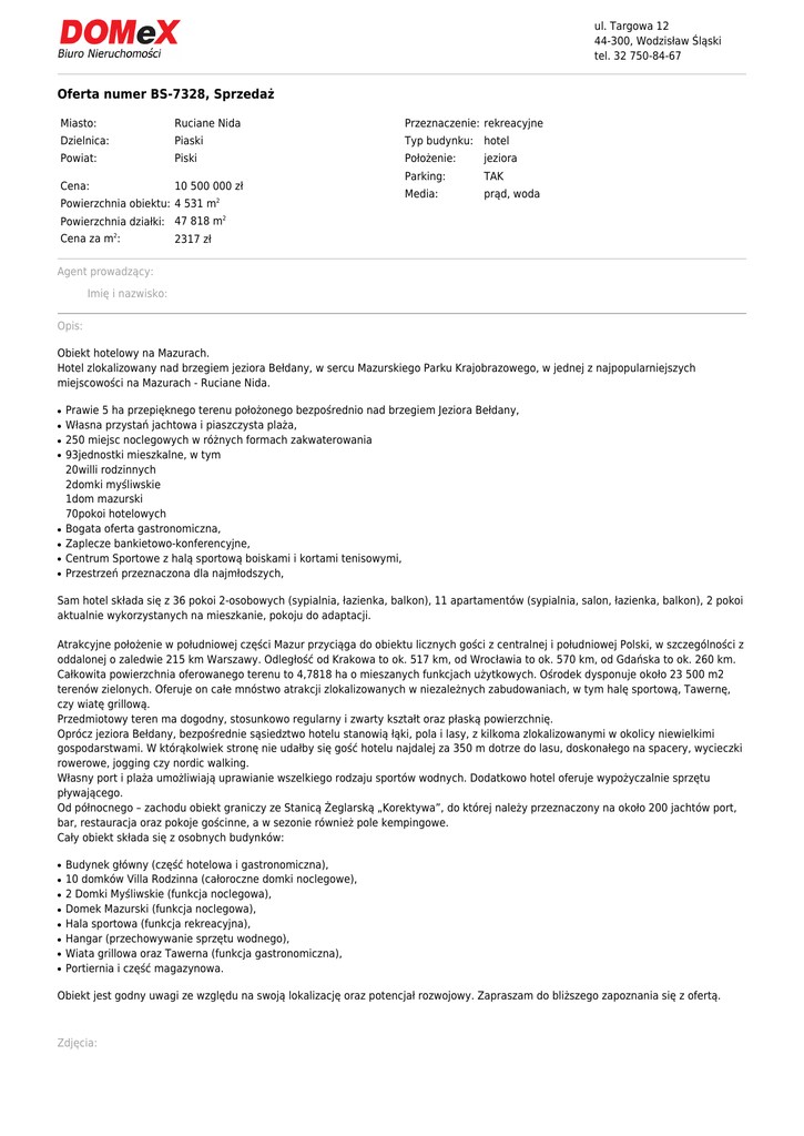 ul. Targowa 12 44-300, Wodzisław Śląski tel. 32 750-84-67 Oferta numer BS-7328, Sprzedaż Miasto: Ruciane Nida Przeznaczenie: rekreacyjne Dzielnica: Piaski Typ budynku: hotel Powiat: Piski Położenie: jeziora Parking: TAK Media: prąd, woda Cena: 10 500 000 zł Powierzchnia obiektu: 4 531 m2 Powierzchnia działki: 47 818 m2 Cena za m2: 2317 zł Agent prowadzący: Imię i nazwisko: Opis: Obiekt hotelowy na Mazurach. Hotel zlokalizowany nad brzegiem jeziora Bełdany, w sercu Mazurskiego Parku Krajobrazowego, w jednej z najpopularniejszych miejscowości na Mazurach - Ruciane Nida. ● ● ● ● ● ● ● ● Prawie 5 ha przepięknego terenu położonego bezpośrednio nad brzegiem Jeziora Bełdany, Własna przystań jachtowa i piaszczysta plaża, 250 miejsc noclegowych w różnych formach zakwaterowania 93jednostki mieszkalne, w tym 20willi rodzinnych 2domki myśliwskie 1dom mazurski 70pokoi hotelowych Bogata oferta gastronomiczna, Zaplecze bankietowo-konferencyjne, Centrum Sportowe z halą sportową boiskami i kortami tenisowymi, Przestrzeń przeznaczona dla najmłodszych, Sam hotel składa się z 36 pokoi 2-osobowych (sypialnia, łazienka, balkon), 11 apartamentów (sypialnia, salon, łazienka, balkon), 2 pokoi aktualnie wykorzystanych na mieszkanie, pokoju do adaptacji. Atrakcyjne położenie w południowej części Mazur przyciąga do obiektu licznych gości z centralnej i południowej Polski, w szczególności z oddalonej o zaledwie 215 km Warszawy. Odległość od Krakowa to ok. 517 km, od Wrocławia to ok. 570 km, od Gdańska to ok. 260 km. Całkowita powierzchnia oferowanego terenu to 4,7818 ha o mieszanych funkcjach użytkowych. Ośrodek dysponuje około 23 500 m2 terenów zielonych. Oferuje on całe mnóstwo atrakcji zlokalizowanych w niezależnych zabudowaniach, w tym halę sportową, Tawernę, czy wiatę grillową. Przedmiotowy teren ma dogodny, stosunkowo regularny i zwarty kształt oraz płaską powierzchnię. Oprócz jeziora Bełdany, bezpośrednie sąsiedztwo hotelu stanowią łąki, pola i lasy, z kilkoma zlokalizowanymi w okolicy niewielkimi gospodarstwami. W którąkolwiek stronę nie udałby się gość hotelu najdalej za 350 m dotrze do lasu, doskonałego na spacery, wycieczki rowerowe, jogging czy nordic walking. Własny port i plaża umożliwiają uprawianie wszelkiego rodzaju sportów wodnych. Dodatkowo hotel oferuje wypożyczalnie sprzętu pływającego. Od północnego – zachodu obiekt graniczy ze Stanicą Żeglarską „Korektywa”, do której należy przeznaczony na około 200 jachtów port, bar, restauracja oraz pokoje gościnne, a w sezonie również pole kempingowe. Cały obiekt składa się z osobnych budynków: ● ● ● ● ● ● ● ● Budynek główny (część hotelowa i gastronomiczna), 10 domków Villa Rodzinna (całoroczne domki noclegowe), 2 Domki Myśliwskie (funkcja noclegowa), Domek Mazurski (funkcja noclegowa), Hala sportowa (funkcja rekreacyjna), Hangar (przechowywanie sprzętu wodnego), Wiata grillowa oraz Tawerna (funkcja gastronomiczna), Portiernia i część magazynowa. Obiekt jest godny uwagi ze względu na swoją lokalizację oraz potencjał rozwojowy. Zapraszam do bliższego zapoznania się z ofertą. Zdjęcia: Zamieszczone na naszej stronie oferty nieruchomości mają charakter informacyjny i nie stanowią oferty w rozumieniu prawa handlowego.