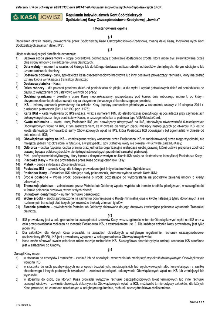 Załącznik nr 6 do uchwały nr 2/28/11/13 z dnia 2013-11-28 Regulamin Indywidualnych Kont Spółdzielczych SKOK Regulamin Indywidualnych Kont Spółdzielczych Spółdzielczej Kasy Oszczędnościowo-Kredytowej „Jowisz” I. Postanowienia ogólne §1 Regulamin określa zasady prowadzenia przez Spółdzielczą Kasę Oszczędnościowo-Kredytową, zwaną dalej Kasą, Indywidualnych Kont Spółdzielczych zwanych dalej „IKS”. §2 Użyte w dalszej części określenia oznaczają: 1) Bazowa stopa procentowa – stopę procentową pochodzącą z publicznie dostępnego źródła, która może być zweryfikowana przez obie strony umowy o świadczenie usług płatniczych; 2) Data waluty – moment w czasie, od którego lub do którego dostawca nalicza odsetki od środków pieniężnych, którymi obciążono lub uznano rachunek płatniczy; 3) Dostawca odbiorcy- bank, spółdzielcza kasa oszczędnościowo-kredytowa lub inny dostawca prowadzący rachunek, który ma zostać uznany kwotą wynikająca z transakcji płatniczej; 4) Dostawca płatnika – Kasa; 5) Dzień roboczy – dla poleceń przelewu dzień od poniedziałku do piątku, a dla wpłat i wypłat gotówkowych dzień od poniedziałku do piątku, z wyłączeniem dni ustawowo wolnych od pracy; 6) Godzina graniczna – określony przez Kasę nieprzekraczalny, przypadający pod koniec dnia roboczego moment, po którym otrzymane zlecenia płatnicze uznaje się za otrzymane pierwszego dnia roboczego po tym dniu; 7) IKS – imienny rachunek prowadzony dla członka Kasy, będący rachunkiem płatniczym w rozumieniu ustawy z 19 sierpnia 2011 r. o usługach płatniczych (Dz.U. Nr 199, poz. 1175); 8) Karta IKM – karta wydawana do IKS służąca, wraz z numerem PIN, do elektronicznej identyfikacji jej posiadacza przy czynnościach dokonywanych przez niego osobiście w Kasie, w szczególności karta płatnicza typu VISA/MasterCard; 9) Kwota minimalna – kwota, którą Posiadacz IKS jest obowiązany utrzymywać na IKS, stanowiąca równowartość 6-miesięcznych Obowiązkowych wpłat na IKS, z tym zastrzeżeniem, że w okresie pierwszych pięciu miesięcy następujących po otwarciu IKS jest to kwota stanowiąca równowartość sumy Obowiązkowych wpłat na IKS, którą Posiadacz IKS obowiązany był zgromadzić w okresie od dnia otwarcia IKS; 10) Obowiązkowe wpłaty na IKS – comiesięczne wpłaty wnoszone przez Posiadacza IKS w zadeklarowanej przez niego wysokości, nie mniejszej jednak niż określonej w Statucie, a w przypadku, gdy Statut tej kwoty nie określa - w uchwale Zarządu Kasy; 11) Odbiorca – osoba fizyczna, osoba prawna oraz jednostka organizacyjna niebędąca osobą prawną, której ustawa przyznaje zdolność prawną, będąca odbiorcą środków pieniężnych stanowiących przedmiot transakcji płatniczej; 12) PIN – poufny numer identyfikacyjny, który łącznie z danymi zawartymi na Karcie IKM służy do elektronicznej identyfikacji Posiadacza Karty; 13) Placówka Kasy – miejsce prowadzenia przez Kasę obsługi członków Kasy; 14) Płatnik – osoba składająca Zlecenie płatnicze; 15) Posiadacz IKS – członek Kasy, dla którego prowadzone jest Indywidualne Konto Spółdzielcze; 16) Posiadacz Karty – Posiadacz IKS albo jego stały pełnomocnik, któremu wydana została Karta IKM; 17) Środki dostępne – Wolne środki powiększone o środki pozostające do wykorzystania na podstawie zawartej umowy o kredyt odnawialny; 18) Transakcja płatnicza – zainicjowana przez Płatnika lub Odbiorcę wpłata, wypłata lub transfer środków pieniężnych, w szczególności w formie polecenia przelewu, w tym stałych zleceń; 19) Unikatowy identyfikator – numer rachunku bankowego; 20) Wolne środki – środki zgromadzone na rachunku pomniejszone o Kwotę minimalną oraz o kwotę należną z tytułu dokonanych a nie rozliczonych transakcji płatniczych, jak również o blokady z innych tytułów; 21) Zlecenie płatnicze – oświadczenie Płatnika lub Odbiorcy skierowane do jego dostawcy zawierające polecenie wykonania Transakcji płatniczej. §3 1. IKS prowadzony jest w celu gromadzenia oszczędności członków Kasy, w szczególności w formie Obowiązkowych wpłat na IKS oraz w celu przeprowadzania rozliczeń na zlecenie Posiadacza IKS, z zastrzeżeniem ust. 2. Dla każdego członka Kasy prowadzony jest tylko jeden IKS. 2. Dla członków, dla których Kasa prowadzi, na zasadach określonych w odrębnym regulaminie, rachunek oszczędnościoworozliczeniowy (ROR), IKS jest prowadzony wyłącznie w celu gromadzenia Obowiązkowych wpłat. 3. Kasa może oferować swoim członkom różne rodzaje rachunków IKS. Szczegółowa charakterystyka rodzaju rachunku IKS określona jest w załączniku do Umowy. §4 Zarząd Kasy może: a) w stosunku do emerytów i rencistów – zwolnić ich od obowiązku wnoszenia lub zmniejszyć wysokość dokonywanych Obowiązkowych wpłat na IKS; b) w stosunku do osób przebywających na urlopach bezpłatnych, macierzyńskich lub wychowawczych albo korzystających z zasiłku chorobowego i innych podobnych świadczeń – zawiesić obowiązek dokonywania Obowiązkowych wpłat na IKS lub zmniejszyć ich wysokość; c) w stosunku do osób, dla których Kasa prowadzi wyłącznie rachunki oszczędnościowych lokat terminowych lub inne rachunki oszczędnościowe – zawiesić obowiązek dokonywania Obowiązkowych wpłat na IKS; możliwość ta nie dotyczy członków, dla których Kasa prowadzi, na zasadach określonych w odrębnym regulaminie, rachunki oszczędnościowo-rozliczeniowe. Strona 1 z 8 R/R/IKS/1.6 Załącznik nr 6 do uchwały nr 2/28/11/13 z dnia 2013-11-28 Regulamin Indywidualnych Kont Spółdzielczych SKOK 1. 2. § 5 IKS prowadzony jest w walucie polskiej. Wpłaty na IKS i wypłaty z IKS mogą być dokonywane wyłącznie w walucie polskiej. II. Otwarcie IKS §6 1. Kasa otwiera i prowadzi IKS na imię i nazwisko Posiadacza IKS. 2. Otwarcie IKS następuje po złożeniu przez członka Kasy: a) pi