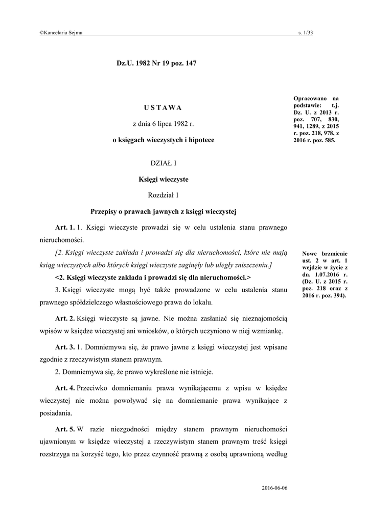 ©Kancelaria Sejmu s. 1/33 Dz.U. 1982 Nr 19 poz. 147 Opracowano na podstawie: t.j. Dz. U. z 2013 r. poz. 707, 830, 941, 1289, z 2015 r. poz. 218, 978, z 2016 r. poz. 585. U S T AWA z dnia 6 lipca 1982 r. hipotece Art. 1. [2. ] <2. pr Nowe brzmienie ust. 2 w art. 1 dn. 1.07.2016 r. (Dz. U. z 2015 r. poz. 218 oraz z 2016 r. poz. 394). > 3. Art. 2. Art. 3. zgodnie z rzeczywistym stanem prawnym. 2. Art. 4. Przeciwko domniemaniu praw posiadania. Art. 5. ro 2016-06-06 ©Kancelaria Sejmu s. 2/33 Art. 6. wierze. 2. 3. Art. 7. 1) 2) 3) iwego organu 4) 5) Art. 8. cza wzmianka o Art. 9. Przepisy art. 5–8 sto Art. 10. 2016-06-06 ©Kancelaria Sejmu s. 3/33 2. o udzieleniu zabezpieczenia. Do udzielenia zabezpieczenia nie jest potrzebne wód ma interes prawny w udzieleniu zabezpieczenia. Art. 11. Art. 12. wpisanych do 2. Art. 13. ew równe z tym prawem dla innego prawa. 2. 3. Art. 14. Art. 15. Przepisy art. 11– czonych praw Art. 16. roszczenia. 2. ne: 1) 2016-06-06 ©Kancelaria Sejmu s. 4/33 2) wieczystego albo o ustanowienie ograniczonego prawa rzeczowego; dotyczy to 3) r 4) 5) mowa w ustawie z dnia 29 sierpnia 1997 r. o listach zastawnych i bankach 1) ); 6) r. o timeshare (Dz. U. Nr 230, poz. 1370). Art. 17. Art. 18. Art. 19. 1. Roszcze sku. 1) 1539 i Nr 249, poz. 2104, z 2006 r. Nr 157, poz. 1119 oraz z 2009 r. Nr 157, poz. 1241. 2016-06-06 ©Kancelaria Sejmu s. 5/33 2. razie nieuwzgl mieszkalnego lub domu jednorodzinnego (Dz. U. Nr 232, poz. 1377 oraz z 2015 r. Art. 20. ograniczonych praw rzeczowych. 2. wniosku o wpis roszczenia. Art. 21. Art. 22. z 2016-06-06 ©Kancelaria Sejmu s. 6/33 2. 3. owanie Art. 23. Art. 23a. Kraj Art. 24. 1. Dla <11. Dla gruntu oddanego w Dodany ust. 11 i przepis > 1.07.2016 r. (Dz. U. z 2015 r. poz. 218 oraz z 2016 r. poz. 394). 2. [3. pro Art. 241. 2. 2016-06-06 ©Kancelaria Sejmu s. 7/33 3. Art. 25. 1) 2) 3) tr 4) 2. 1) pierwszy obejmuje oznaczenie lokalu lub domu jednorodzinnego oraz 2) 3) 4) 3. [Art. 251. Nowe brzmienie art. 251 wejdzie informatycznym. 2. informatycznym, 2016-06-06 1.07.2016 r. (Dz. U. z 2015 r. poz. 218 oraz z 2016 r. poz. 394). ©Kancelaria Sejmu s. 8/33 <Art. 251. prowadzone w systemie teleinformatycznym. 2. systemie teleinformatycznym, art. 25.> Art. 26. 2) . 2. jednorodzinnego – 3) . 3. ej mowa w art. 241, oraz o wpisie 4) Art. 27. z – na w – sprostowania 5) . 2. ia danych w bazie danych katastru 6) 7) . 3. – alnej lub inny 8) [4. Nowe brzmienie ust. 4 w art. 27 dn. 1.07.2016 r. (Dz. U. z 2015 r. poz. 218 oraz z 2016 r. poz. 394). 2) 3) ust wieczystej prowadzonej w systemie informatycznym (Dz. U. Nr 42, poz. 363). 4) 5) 6) w art. 26. 7) 8) 2016-06-06 ©Kancelaria Sejmu s. 9/33 9) w celu sprawdzenia oznaczenia <4. celu poprzez zintegrowany system informacji o sprawdzenia oznaczenia > Art. 28. Art. 29. – od chwili w Art. 30. (uchylony). Art. 31. dokumentu. 2. Art. 32. wystarcza dokument obejmu prawa. 2. owiednio do wpisu przeniesienia hipoteki 3. terminu. 9) 2016-06-06 ©Kancelaria Sejmu s. 10/33 Art. 33. ormie w Art. 34. jako Art. 35. 2. Art. 36. 2. zawiadomienia, o którym mowa w ust. 1. 3. 4. Nowe brzmienie art. 361 wejdzie 5. 1.07.2016 r. (Dz. U. z 2015 r. poz. 218 oraz z 2016 r. poz. 394). 1 [Art. 36 . 2016-06-06 ©Kancelaria Sejmu s. 11/33 2. 3. 4. ma ] <Art. 361. 2. 3. 4. prokuratora, notariusza, organu adminis > [Art. 362. 2. – 3. Przepis 362 wejdzie w 1.07.2016 r. (Dz. U. z 2015 r. poz. 218 oraz z 2016 r. poz. 394). 4. 5. prowadzonych w systemie informatycznym, o którym mowa w art. 251.] [Art. 363. Nowe brzmienie art. 363 wejdzie 1 którym mowa w art. 25 stych 1.07.2016 r. (Dz. U. z 2015 r. poz. 218 oraz z 2016 r. poz. 394). prowadzonych w tym systemie. 2016-06-06 ©Kancelaria Sejmu s. 12/33 2. 3. <Art. 363. prowadzonych w systemie teleinformatycznym. 2. > Art. 364. 1. z wieczyste. [2. Nowe brzmienie ust. 2, 5, 6 i 16 z dn. 1.07.2016 r. (Dz. U. z 2015 r. poz. 218 oraz z 2016 r. poz. 394). prowadzonych w systemie informatycznym.] <2. wieczystych.> 3. wiadczenia, o których mowa w ust. 2, wydawane przez 4. wniosku o wydanie dokumentów, o których mowa w ust. 2, Centralna Informacja danymi zawartymi w centralnej bazi 2016-06-06 ©Kancelaria Sejmu s. 13/33 [5. informatycznym.] <5. teleinformat > [6. systemu teleinformatycznego.] <6. > 7. 8. 1) 2) prokuratura; 3) organy kontroli skarbowej; 4) organy celne; 5) administracyjne organy egzekucyjne; 6) organy podatkowe; 7) 8) Policja; 9) 10) 11) 12) Agencja Wywiadu; 13) Centralne Biuro Antykorupcyjne; 14) 15) 16) 17) 18) notariusze; 2016-06-06 ©Kancelaria Sejmu s. 14/33 19) 9. uprawniony –8, 10 i 18. 10. 1) 2) 3) . 11. 12. Centralna Informacja, po otrzymaniu zgody, o której mowa w ust. 8, przez 13. Minist Centralnej Informacji o wyszukanie ks 1) wieczystych, zakresu danych oraz daty ich uzyskania; 2) posi wykorzystaniem uzyskanych danych niezgodnie z celem; 3) 4) ki techniczne. 14. ust. 13. 2016-06-06 ©Kancelaria Sejmu s. 15/33 15. [16. 10) w z danymi osobom trzecim.] <16. powiatu, w budynków z danymi zawartymi w dziale pierwszym i trzecim.> 17. 1) sposób funkcjon 2) 3) ictwem systemu teleinformatycznego, 4) 5) 6) wydrukowanych samodzielnie oraz sposób i tryb ich weryfikacji z danymi 7) warunki techniczne i organizacyjne wykonania decyzji, o której mowa w ust. 13, 10) 2016-06-06 ©Kancelaria Sejmu s. 16/33 8) – z Art. 365. 2. w samodzielnego wydruku dokumentów, o którym mowa w art. 364 3. ks wniosku o których mowa w art. 364 ust. 8 pkt 1–6, 8–17 oraz Art. 37–57. (uchylone). Art. 58. 1) miejscowej, 2) – [Art. 581. Przepis 581 i 582 wejdzie 2016-06-06 1.07.2016 r. (Dz. U. z 2015 r. poz. 218 oraz z 2016 r. poz. 394). ©Kancelaria Sejmu s. 17/33 2. Utr wieczystych. 3. [Art. 582. 1 podlega 2. W razie konie 1 , art. 25 ust. 1, z jednoczesnym przeniesieniem do niej wszystkich aktualnych wpisów.] (uchylony). Hipoteka Przepisy ogólne Art. 65. 2016-06-06 ©Kancelaria Sejmu s. 18/33 2. Przedmio 1) 2) 3) 3. 4. o Art. 66. (uchylony). Art. 67. Art. 68. 2. 2a. 11) 11 kwie