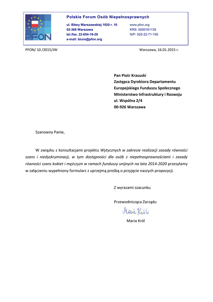 Polskie Forum Osób Niepełnosprawnych ul. Bitwy Warszawskiej 1920 r. 10 02-366 Warszawa tel./fax. 22-654-19-28 e-mail: [email protected] PFON/ 10 /2015/JW www.pfon.org KRS: 0000161135 NIP: 525-22-71-155 Warszawa, 16.01.2015 r. Pan Piotr Krasuski Zastępca Dyrektora Departamentu Europejskiego Funduszu Społecznego Ministerstwo Infrastruktury i Rozwoju ul. Wspólna 2/4 00-926 Warszawa Szanowny Panie, W związku z konsultacjami projektu Wytycznych w zakresie realizacji zasady równości szans i niedyskryminacji, w tym dostępności dla osób z niepełnosprawnościami i zasady równości szans kobiet i mężczyzn w ramach funduszy unijnych na lata 2014-2020 przesyłamy w załączeniu wypełniony formularz z uprzejmą prośbą o przyjęcie naszych propozycji. Z wyrazami szacunku Przewodnicząca Zarządu Maria Król Uwagi do projektu Wytycznych w zakresie realizacji zasady równości szans i niedyskryminacji, w tym dostępności dla osób z niepełnosprawnościami oraz zasady równości szans kobiet i mężczyzn w ramach funduszy unijnych na lata 2014-2020 Lp. 1 2 3 4 Podmiot zgłaszający uwagę Numer rozdziału / podrozdziału / sekcji Punkt Litera Uwaga lub propozycja zmiany zapisu Uzasadnienie Polskie Forum Osób 3 Niepełnosprawnych 3 Dodać definicję dyskryminacji wielokrotnej i jej rodzajów. Z uwagi na społeczne znaczenie dyskryminacji wielokrotnej ważne jest, aby wszyscy wnioskodawcy rozumieli to pojęcie, w jednakowy sposób. 3 6 Zmienić końcowy fragment pierwszego zdania, definiującego dostępność. Obecnie jest: "(…) na korzystanie z nich na równych prawach z innymi", powinno być: "na korzystanie z nich na zasadzie równości z innymi osobami" Proponowane sformułowanie jest zgodne z Konwencją o prawach osób niepełnosprawnych , która nie ogranicza zasady równości do równości praw. 4 1 Poprawić pierwsze zdanie. Obecnie jest: "Jednym z celów określonych w Strategii Europa 2020 jest osiągnięcie przez wszystkie państwa UE, wskaźnika zatrudnienia (…) na poziomie 75%.", powinno być: "Jednym z celów określonych w Strategii Europa 2020 jest osiągnięcie przez państwa UE, średniego wskaźnika zatrudnienia (…) na poziomie 75%." Obecny zapis sugeruje, że wg Strategii każde państwo UE ma osiagnąć wskaźnik zatrudnienia 75%, podczas gdy jest to wskaźnik dla całej Unii Europejskiej. 4 2 Zmienić początek drugiego zdania. Obecnie jest: Proponowany zapis jest zgodny z Konwencją o prawach osób "Należy więc skupić się na integrowaniu osób z niepełnosprawnych , która postuluje pełne włączenie w społeczeństwo. niepełnosprawnościami w ogólnospołeczny nurt życia (…)", powinno być: "Należy więc skupić się na włączaniu osób z niepełnosprawnościami w ogólnospołeczny nurt życia (…)" 4 3 Zmienić koniec drugiego zdania. Obecnie jest: "(…) poprzez pomoc w integracji na rynku pracy dzięki wykorzystaniu EFS.", powinno być: "(…) poprzez wsparcie w integracji na rynku pracy dzięki wykorzystaniu EFS." Słowo "pomoc" utrwala stereotyp osoby niepełnosprawnej, jako biernego odbiorcy działań. Słowo "wsparcie" podkreśla jej podmiotowość. 5 / 5.1 12 Zmienić sformułowanie: "(…) na każdej kondygnacji budynku (…)", na: "(…) na kondygnacji budynku, na której realizowane są działania w ramach projektów współfinansowanych z EFS, EFRR i FS (…)" Propozycja jest zgodna z zasadą racjonalnego usprawnienia. 5 / 5.1 13 Należy przeformułować początek: "W przypadku braku możliwości zorganizowania świadczenia usługi w miejscu spełniającym kryteria wymienione w pkt 12 (…)". Obecny zapis sugeruje, że zapewnienie usług tłumacza jęz.migowego, czy zastosowanie alternatywnych form przygotowania materiałów (przykładowo) będzie możliwe tylko w przypadku, gdy działania będą realizowane w budynku niedostępnym architektonicznie. Polskie Forum Osób Niepełnosprawnych Polskie Forum Osób Niepełnosprawnych Polskie Forum Osób Niepełnosprawnych 5 Polskie Forum Osób Niepełnosprawnych 6 Polskie Forum Osób Niepełnosprawnych 7 Polskie Forum Osób Niepełnosprawnych h 8 9 11 Polskie Forum Osób Niepełnosprawnych 14 15 16 17 18 Poprawić sformułowanie w ostatnim zdaniu. Obecnie Propozycja usuwa błąd merytoryczny. jest: "(..) w zależności od oczekiwanych potrzeb grupy odbiorców.", powinno być: "(...) w zależności od oczekiwań i potrzeb grupy odbiorców." Załącznik nr 2 Kampanie Druga medialne/sp kropka otkania informacyjnopromocyjne (wszystkie cele tematyczne) Uzupełnić zapis w nawiasie: "nie tylko fizyczną i sensoryczną, ale też intelektualną i psychiczną." Załącznik nr 2 Budowa i Czwarta modernizacj kropka a budynków użyteczności publicznej i terenów ogólnodostę pnych Zmienić sformułowanie: "(…) na każdej kondygnacji Propozycja jest zgodna z zasadą racjonalnego usprawnienia. danego budynku (…)", na: "(…) na kondygnacji danego budynku, na której realizowane są działania w ramach projektów współfinansowanych z EFS, EFRR i FS (…)" Załącznik nr 2 Stosowanie Piąta kropka instrumentó w finansowych Zmienić zapis na: "Należy stosować instrumenty wyrównujące pracodawcom dodatkowe koszty związane z zatrudnianiem osób z niepełnosprawnościami." Polskie Forum Osób Niepełnosprawnych Polskie Forum Osób Niepełnosprawnych 13 Kampanie Pierwsza i medialne/sp trzecia otkania kropka informacyjnopromocyjne (wszystkie cele tematyczne) Polskie Forum Osób Niepełnosprawnych 10 12 Załącznik nr 2 Kwestia dotyczy wszystkich rodzajów niepełnosprawności. Propozycja zawiera rzeczowe, a nie stereotypowe ujęcie zagadnienia.