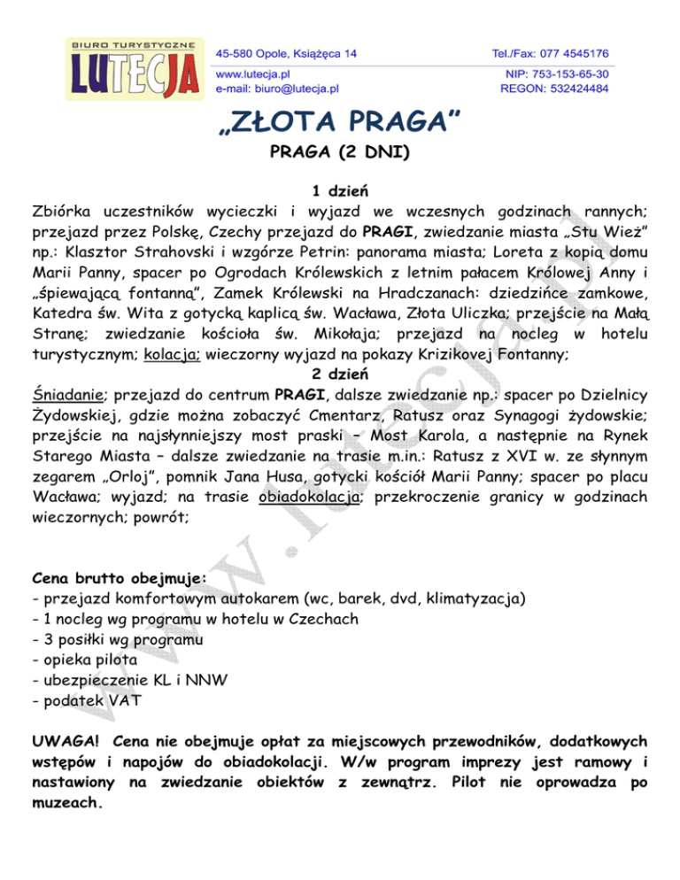 „ZŁOTA PRAGA” PRAGA (2 DNI) 1 dzień Zbiórka uczestników wycieczki i wyjazd we wczesnych godzinach rannych; przejazd przez Polskę, Czechy przejazd do PRAGI, zwiedzanie miasta „Stu WieŜ” np.: Klasztor Strahovski i wzgórze Petrin: panorama miasta; Loreta z kopią domu Marii Panny, spacer po Ogrodach Królewskich z letnim pałacem Królowej Anny i „śpiewającą fontanną”, Zamek Królewski na Hradczanach: dziedzińce zamkowe, Katedra św. Wita z gotycką kaplicą św. Wacława, Złota Uliczka; przejście na Małą Stranę; zwiedzanie kościoła św. Mikołaja; przejazd na nocleg w hotelu turystycznym; kolacja; wieczorny wyjazd na pokazy Krizikovej Fontanny; 2 dzień Śniadanie; przejazd do centrum PRAGI, dalsze zwiedzanie np.: spacer po Dzielnicy śydowskiej, gdzie moŜna zobaczyć Cmentarz, Ratusz oraz Synagogi Ŝydowskie; przejście na najsłynniejszy most praski – Most Karola, a następnie na Rynek Starego Miasta – dalsze zwiedzanie na trasie m.in.: Ratusz z XVI w. ze słynnym zegarem „Orloj”, pomnik Jana Husa, gotycki kościół Marii Panny; spacer po placu Wacława; wyjazd; na trasie obiadokolacja; przekroczenie granicy w godzinach wieczornych; powrót; Cena brutto obejmuje: - przejazd komfortowym autokarem (wc, barek, dvd, klimatyzacja) - 1 nocleg wg programu w hotelu w Czechach - 3 posiłki wg programu - opieka pilota - ubezpieczenie KL i NNW - podatek VAT UWAGA! Cena nie obejmuje opłat za miejscowych przewodników, dodatkowych wstępów i napojów do obiadokolacji. W/w program imprezy jest ramowy i nastawiony na zwiedzanie obiektów z zewnątrz. Pilot nie oprowadza po muzeach.