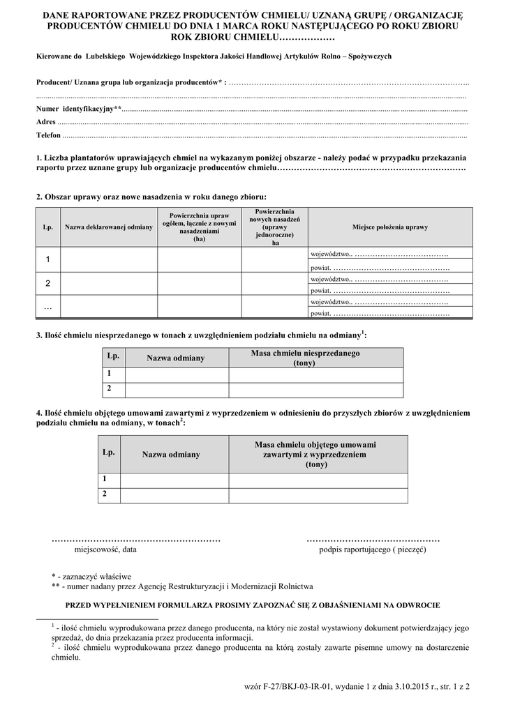 DANE RAPORTOWANE PRZEZ PRODUCENTÓW CHMIELU/ UZNANĄ GRUPĘ / ORGANIZACJĘ PRODUCENTÓW CHMIELU DO DNIA 1 MARCA ROKU NASTĘPUJĄCEGO PO ROKU ZBIORU ROK ZBIORU CHMIELU……………… Kierowane do Lubelskiego Wojewódzkiego Inspektora Jakości Handlowej Artykułów Rolno – Spożywczych Producent/ Uznana grupa lub organizacja producentów* : ………………………………………………………………………………….. ................................................................................................................................................................................................................................. Numer identyfikacyjny**.................................................................................................................................................. ................................... Adres ............................................................................................................................. .......................................................................................... Telefon .................................................................................................................................................................................................................... 1. Liczba plantatorów uprawiających chmiel na wykazanym poniżej obszarze - należy podać w przypadku przekazania raportu przez uznane grupy lub organizacje producentów chmielu…………………………………………………………. 2. Obszar uprawy oraz nowe nasadzenia w roku danego zbioru: Lp. Nazwa deklarowanej odmiany Powierzchnia upraw ogółem, łącznie z nowymi nasadzeniami (ha) Powierzchnia nowych nasadzeń (uprawy jednoroczne) ha Miejsce położenia uprawy województwo.. ………………………………. 1 powiat. ………………………………………. województwo.. ………………………………. 2 powiat. ………………………………………. województwo.. ………………………………. … powiat. ………………………………………. 3. Ilość chmielu niesprzedanego w tonach z uwzględnieniem podziału chmielu na odmiany1: Lp. Nazwa odmiany Masa chmielu niesprzedanego (tony) 1 2 4. Ilość chmielu objętego umowami zawartymi z wyprzedzeniem w odniesieniu do przyszłych zbiorów z uwzględnieniem podziału chmielu na odmiany, w tonach2: Lp. Nazwa odmiany Masa chmielu objętego umowami zawartymi z wyprzedzeniem (tony) 1 2 ......................................................... ............................................. miejscowość, data podpis raportującego ( pieczęć) * - zaznaczyć właściwe ** - numer nadany przez Agencję Restrukturyzacji i Modernizacji Rolnictwa PRZED WYPEŁNIENIEM FORMULARZA PROSIMY ZAPOZNAĆ SIĘ Z OBJAŚNIENIAMI NA ODWROCIE 1 - ilość chmielu wyprodukowana przez danego producenta, na który nie został wystawiony dokument potwierdzający jego sprzedaż, do dnia przekazania przez producenta informacji. 2 - ilość chmielu wyprodukowana przez danego producenta na którą zostały zawarte pisemne umowy na dostarczenie chmielu. wzór F-27/BKJ-03-IR-01, wydanie 1 z dnia 3.10.2015 r., str. 1 z 2 OBJAŚNIENIA Za powierzchnię uprawy chmielu uważa się:  powierzchnię, na której uprawia się rośliny chmielu, zajętą przez konstrukcję nośną i ograniczoną linią jej zewnętrznych odciągów kotwicznych;  pasy brzeżne o szerokości odpowiadającej średniej szerokości międzyrzędzia wewnątrz plantacji i niestanowiące części drogi publicznej, które umożliwiają uprawę rzędów roślin znajdujących się między odciągami kotwicznymi,  pasy przeznaczone na uwrocia, znajdujące się na zakończeniach rzędów roślin, pod warunkiem, że szerokość żadnego z nich nie przekracza 8 m i nie stanowią one części drogi publicznej. Szerokość powierzchni uprawy chmielu powinna być powiększona o dwie szerokości średniego międzyrzędzia (po jednym pasie brzeżnym z każdej strony), jeżeli na linii zewnętrznych odciągów kotwicznych rosną rośliny chmielu i obszar ten jest własnością producenta oraz nie jest częścią drogi publicznej. Długość powierzchni uprawy chmielu powiększa się o dwa pasy przeznaczone na uwrocia pod warunkiem, że szerokość każdego z nich nie przekracza 8 m i obszar ten jest własnością producenta oraz nie jest częścią drogi publicznej. Powierzchnia uprawy chmielu powinna się składać się z kwater jednolitych odmianowo. Za kwaterę uważa się jednolitą odmianowo wydzieloną część powierzchni uprawy chmielu, tworzącą regularny kształt o wyraźnych granicach, kwatery mogą być usytuowane wzdłuż lub w poprzek rzędów. Przygotowanie raportu 1. 2. 3. 4. 5. 6. Raport składany jest przez:  producenta chmielu, który nie należy do uznanej grupy/organizacji producentów chmielu, oraz  uznaną grupę producentów lub uznaną organizację producentów chmielu, w przypadku, gdy producent jest członkiem takiej grupy lub organizacji. Producent chmielu składa jeden raport na wszystkie użytkowane powierzchnie w ustawowym terminie do dnia 1 marca roku następującego po roku zbioru chmielu z tych powierzchni. Uznana grupa lub organizacja producentów chmielu składa jeden raport na wszystkie użytkowane przez jej członków powierzchnie w ustawowym terminie do dnia 1 marca roku następującego po roku zbioru chmielu z tych powierzchni. Powierzchnię upraw należy podać w ha, z dokładnością do dwóch miejsc po przecinku. W kolumnie ,,nazwa deklarowanej odmiany” należy wpisać kolejno taką ilość odmian, z których faktycznie dana powierzchnia uprawy chmielu się składa, z uwzględnieniem wieku uprawy Powierzchnię należy podać w ha z dokładnością do dwóch miejsc po przecinku. Przedmiotowy raport po wypełnieniu należy dostarczyć, do właściwego ze względu na miejsce położenia uprawy chmielu, wojewódzkiego inspektora