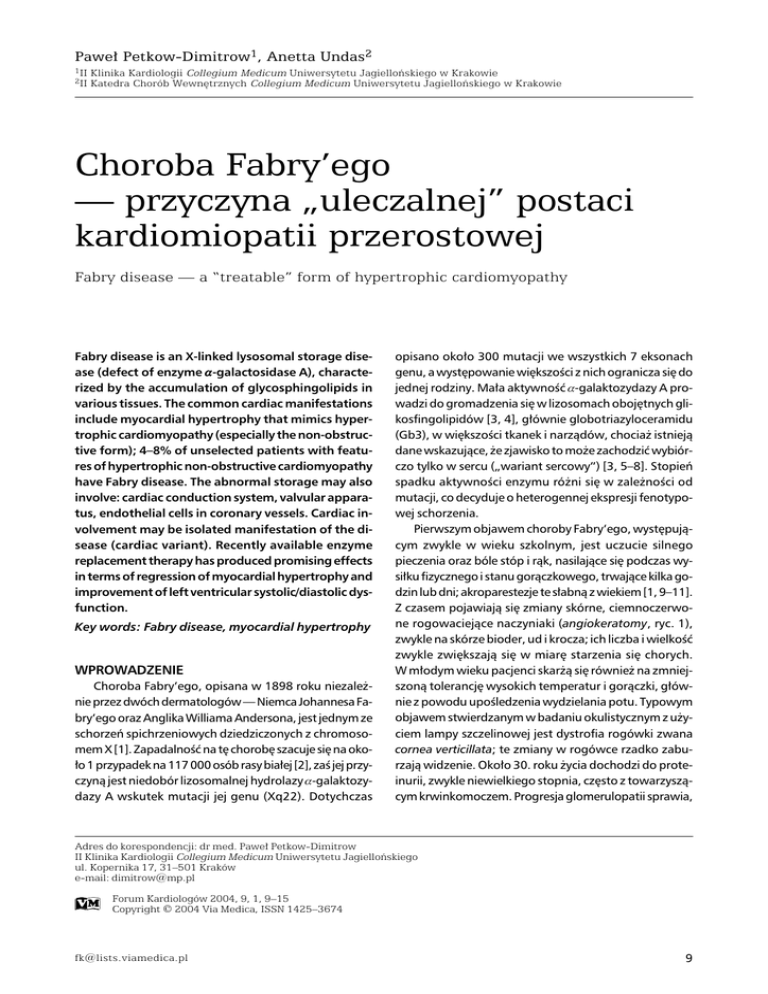 Paweł Petkow-Dimitrow1, Anetta Undas2 1II 2II Klinika Kardiologii Collegium Medicum Uniwersytetu Jagiellońskiego w Krakowie Katedra Chorób Wewnętrznych Collegium Medicum Uniwersytetu Jagiellońskiego w Krakowie Choroba Fabry’ego — przyczyna „uleczalnej” postaci kardiomiopatii przerostowej Fabry disease — a “treatable” form of hypertrophic cardiomyopathy Fabry disease is an X-linked lysosomal storage disease (defect of enzyme a -galactosidase A), characterized by the accumulation of glycosphingolipids in various tissues. The common cardiac manifestations include myocardial hypertrophy that mimics hypertrophic cardiomyopathy (especially the non-obstructive form); 4–8% of unselected patients with features of hypertrophic non-obstructive cardiomyopathy have Fabry disease. The abnormal storage may also involve: cardiac conduction system, valvular apparatus, endothelial cells in coronary vessels. Cardiac involvement may be isolated manifestation of the disease (cardiac variant). Recently available enzyme replacement therapy has produced promising effects in terms of regression of myocardial hypertrophy and improvement of left ventricular systolic/diastolic dysfunction. Key words: Fabry disease, myocardial hypertrophy WPROWADZENIE Choroba Fabry’ego, opisana w 1898 roku niezależnie przez dwóch dermatologów — Niemca Johannesa Fabry’ego oraz Anglika Williama Andersona, jest jednym ze schorzeń spichrzeniowych dziedziczonych z chromosomem X [1]. Zapadalność na tę chorobę szacuje się na około 1 przypadek na 117 000 osób rasy białej [2], zaś jej przyczyną jest niedobór lizosomalnej hydrolazy a-galaktozydazy A wskutek mutacji jej genu (Xq22). Dotychczas opisano około 300 mutacji we wszystkich 7 eksonach genu, a występowanie większości z nich ogranicza się do jednej rodziny. Mała aktywność a-galaktozydazy A prowadzi do gromadzenia się w lizosomach obojętnych glikosfingolipidów [3, 4], głównie globotriazyloceramidu (Gb3), w większości tkanek i narządów, chociaż istnieją dane wskazujące, że zjawisko to może zachodzić wybiórczo tylko w sercu („wariant sercowy”) [3, 5–8]. Stopień spadku aktywności enzymu różni się w zależności od mutacji, co decyduje o heterogennej ekspresji fenotypowej schorzenia. Pierwszym objawem choroby Fabry’ego, występującym zwykle w wieku szkolnym, jest uczucie silnego pieczenia oraz bóle stóp i rąk, nasilające się podczas wysiłku fizycznego i stanu gorączkowego, trwające kilka godzin lub dni; akroparestezje te słabną z wiekiem [1, 9–11]. Z czasem pojawiają się zmiany skórne, ciemnoczerwone rogowaciejące naczyniaki (angiokeratomy, ryc. 1), zwykle na skórze bioder, ud i krocza; ich liczba i wielkość zwykle zwiększają się w miarę starzenia się chorych. W młodym wieku pacjenci skarżą się również na zmniejszoną tolerancję wysokich temperatur i gorączki, głównie z powodu upośledzenia wydzielania potu. Typowym objawem stwierdzanym w badaniu okulistycznym z użyciem lampy szczelinowej jest dystrofia rogówki zwana cornea verticillata; te zmiany w rogówce rzadko zaburzają widzenie. Około 30. roku życia dochodzi do proteinurii, zwykle niewielkiego stopnia, często z towarzyszącym krwinkomoczem. Progresja glomerulopatii sprawia, Adres do korespondencji: dr med. Paweł Petkow-Dimitrow II Klinika Kardiologii Collegium Medicum Uniwersytetu Jagiellońskiego ul. Kopernika 17, 31–501 Kraków e-mail: [email protected] Forum Kardiologów 2004, 9, 1, 9–15 Copyright © 2004 Via Medica, ISSN 1425–3674 [email protected] 9 Forum Kardiologów 2004, tom 9, nr 1 Również u mężczyzn zaleca się badania genetyczne, by potwierdzić rozpoznanie choroby Fabry’ego oparte na oznaczaniu aktywności a-galaktozydazy A. Obecnie, w dobie powszechnej dostępności echokardiografii, objawy tego schorzenia coraz częściej wykrywają nie dermatolodzy lub nefrolodzy, ale kardiolodzy, zwłaszcza wykonujący badanie echokardiograficzne, które może uwidocznić wiele zaburzeń, spośród których najbardziej dostrzegalnym jest przerost mięśnia sercowego. SERCE W CHOROBIE FABRY’EGO Rycina 1. Fotografia naczyniaków rogowaciejących (angiokeratoma) zlokalizowanych na biodrach i lędźwiach że przeciętnie po 8–10 latach u chorego rozwija się niewyrównana niewydolność nerek. U około 40% pacjentów występują objawy ze strony układu pokarmowego: nudności, wzdęcia, kurczowe bóle brzucha i biegunka. Jednak najważniejszą przyczyną chorobowości i śmiertelności w chorobie Fabry’ego są incydenty sercowo-naczyniowe: ostre — udar mózgu, zawał serca, migotanie komór oraz przewlekłe — postępująca niewydolność serca. Są one odpowiedzialne za krótki czas przeżycia pacjentów, który w wypadku mężczyzn wynosi obecnie średnio 45–50 lat [3, 6, 7]. Coraz więcej danych wskazuje, że choroba Fabry’ego, chociaż jest przekazywana z chromosomem X, nie jest dziedziczona recesywnie, ponieważ rozwija się nie tylko u hemizygotycznych mężczyzn, ale również u heterozygotycznych kobiet. Wszystkie objawy obserwowane u mężczyzn występują również u wspomnianych kobiet, choć zwykle pojawiają się średnio 10 lat później. Za najczęstsze objawy tego schorzenia u kobiet uważa się: ogólne osłabienie (66%), naczyniaki rogowaciejące (35%), bóle stawów, zmniejszoną potliwość [12]. Diagnostyka choroby Fabry’ego u hemizygotycznych mężczyzn polega na oznaczeniu stężenia a-galaktozydazy A w osoczu bądź w surowicy lub zbadaniu aktywności enzymu w leukocytach; u około 20% chorych mężczyzn aktywność enzymu jest nieoznaczalna [1]. Ponadto, pomocny może być pomiar stężenia Gb3 w surowicy, które wyraźnie wzrasta w przypadku tego schorzenia. Ponieważ u 40% heterozygotycznych kobiet aktywność enzymu mieści się w zakresie wartości referencyjnych, wiarygodną metodą diagnostyczną w ich wypadku jest wykrycie mutacji odpowiedzialnej za niedobór akty