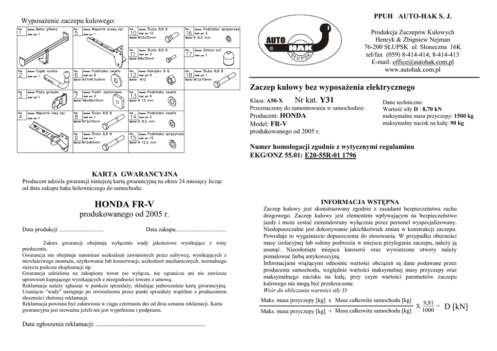 PPUH AUTO-HAK S. J. WyposaŜenie zaczepu kulowego: Produkcja Zaczepów Kulowych Henryk & Zbigniew Nejman 76-200 SŁUPSK ul. Słoneczna 16K tel/fax (059) 8-414-414; 8-414-413 E-mail: [email protected] www.autohak.com.pl Zaczep kulowy bez wyposaŜenia elektrycznego Klasa: A50-X Nr kat. Y31 Przeznaczony do zamontowania w samochodzie: Producent: HONDA Model: FR-V produkowanego od 2005 r. Dane techniczne: Wartość siły D : 8,70 kN maksymalna masa przyczepy: 1500 kg maksymalny nacisk na kulę: 90 kg Numer homologacji zgodnie z wytycznymi regulaminu EKG/ONZ 55.01: E20-55R-01 1796 KARTA GWARANCYJNA Producent udziela gwarancji niniejszą kartą gwarancyjną na okres 24 miesięcy licząc od dnia zakupu haka holowniczego do samochodu: HONDA FR-V produkowanego od 2005 r. Data produkcji .............................. Data zakupu.................................. Zakres gwarancji obejmuje wyłącznie wady jakościowe wynikające z winy producenta. Gwarancja nie obejmuje natomiast uszkodzeń zawinionych przez nabywcę, wynikających z niewłaściwego montaŜu, uŜytkowania lub konserwacji, uszkodzeń mechanicznych, normalnego zuŜycia podczas eksploatacji itp. Gwarancja udzielona na zakupiony towar nie wyłącza, nie ogranicza ani nie zawiesza uprawnień kupującego wynikających z niezgodności towaru z umową. Reklamacje naleŜy zgłaszać w punkcie sprzedaŜy, składając jednocześnie kartę gwarancyjną. Usunięcie "wady" następuje po stwierdzeniu przez punkt sprzedaŜy wspólnie z producentem słuszności złoŜonej reklamacji. Reklamacja powinna być załatwiona w ciągu czternastu dni od dnia uznania reklamacji. Karta gwarancyjna jest niewaŜna jeŜeli nie jest wypełniona i podpisana. Data zgłoszenia reklamacji: ................................................................... INFORMACJA WSTĘPNA Zaczep kulowy jest skonstruowany zgodnie z zasadami bezpieczeństwa ruchu drogowego. Zaczep kulowy jest elementem wpływającym na bezpieczeństwo jazdy i moŜe zostać zainstalowany wyłącznie przez personel wyspecjalizowany. Niedopuszczalne jest dokonywanie jakichkolwiek zmian w konstrukcji zaczepu. Powoduje to wygaśniecie dopuszczenia do stosowania. W przypadku obecności masy izolacyjnej lub osłony podwozia w miejscu przylegania zaczepu, naleŜy ją usunąć. Nieosłonięte miejsca karoserii oraz wywiercone otwory naleŜy pomalować farbą antykorozyjną. Informacjami wiąŜącymi odnośnie wartości obciąŜeń są dane podawane przez producenta samochodu, względnie wartości maksymalnej masy przyczepy oraz maksymalnego nacisku na kulę, przy czym wartości parametrów zaczepu kulowego nie mogą być przekroczone. Wzór do obliczania wartości siły D: Maks. masa przyczepy [kg] x Masa całkowita samochodu [kg] 9,81 = X + 1000 Maks. masa przyczepy [kg] + Masa całkowita samochodu [kg] + D [kN] INSTRUKCJA MontaŜu i eksploatacji zaczepu kulowego Oznaczenie zacisku wg ISO PN 1 L 2 + 3 31 4 R 5 58R 6 54 7 58L Łączenie przewodów C 5 Kierunkowskazy lewe Tylne światła przeciwmgłowe Masa Kierunkowskazy prawe Światła pozycyjne prawe Światła hamowania Światła pozycyjne lewe D 11 6 10 E 4 A 1 10 7 6 9 11 10 18 17 6 Kolejność czynności przy montaŜu 1. Zdemontować zderzak. - usunąć dwie śruby w lewej i prawej wnęce koła, - usunąć dwie plastikowe śruby z dołu i dwie śruby u góry zderzaka 2. Poluźnić po prawej i lewej stronie plastikowe osłony wewnątrz zderzaka. 3. Zdemontować wnętrze zderzaka (nie będzie ponownie montowane). 4. Wewnątrz zderzaka wykręcić dwie najbardziej wewnętrzne śruby. 5. Zamontować element (poz. 4) poprzez otwory (poz. A) śrubami M12x35mm (poz. 10) – uŜyj duŜych podkładek (poz. 6) oraz poprzez otwór (poz. B) śrubą M8x35mm (poz. 11) – patrz rys. 1. 6. Zamontować element (poz. 5) poprzez otwory (poz. C) śrubami M12x35mm (poz. 10) – uŜyj duŜych podkładek (poz. 6) oraz poprzez otwór (poz. D) śrubą M8x35mm (poz. 11) – patrz rys. 1. 7. PrzyłoŜyć belkę zaczepu (poz. 1) pomiędzy zamontowane elementy (poz. 4 i 5) i skręcić śrubami M12x35mm (poz. 10). 8. Skręcić belkę zaczepu (poz. 1) z uchem holowniczym poprzez otwór (poz. E) śrubą M12x60mm – uŜyj kwadratowych podkładek dystansowych (poz. 7). 9. Zamontować zderzak po uprzednim wycięciu fragmentu – patrz rys. 2 Rys. 2 8 10 B 10 Rys.1 3 2 Zaczep kulowy przeznaczony jest do zamontowania w samochodzie HONDA FR-V produkowanego od 2005 r. nr katalogowy Y31 i słuŜy do ciągnięcia przyczep o masie całkowitej 1500 kg i nacisku na kulę max 90 kg. OD PRODUCENTA Dziękujemy za wybór produkowanego przez naszą firmę zaczepu kulowego. Jego niezawodność została potwierdzona licznymi testami oraz opiniami zadowolonych klientów. JednakŜe niezawodność zaczepów kulowych jest zaleŜna równieŜ od prawidłowego montaŜu oraz prawidłowej eksploatacji. Z tego powodu prosimy Państwa o staranne przeczytanie niniejszej instrukcji montaŜu oraz przestrzeganie zawartych wskazówek. Zaczep naleŜy zamontować w miejscach do tego celu przeznaczonych przez producenta samochodu. 10. Przykręcić część kulistą zaczepu (poz. 2) śrubą M12x75mm (poz. 8) oraz M12x70mm (poz. 18) z wyposaŜenia. Pierwszą z tych śrub przykręcić blachę pod gniazdo (poz. 3). 11. Dokręcić wszystkie śruby z momentem, jak pokazano w tabeli. 12. Podłączyć przewody z gniazdka 7 – bieg. do instalacji elektrycznej zgodnie z instrukcją fabryczną samochodu (zaleca się wykonanie w ASO). 13. Uzupełnić ewentualne ubytki powłoki malarskiej zaczepu powstałe w trakcie montaŜu. Zalecany moment skręcający dla śrub i nakrętek 8,8: M 8 25 Nm M 10 55 Nm M 12 85 Nm M 14 135 Nm UWAGA Po zamontowaniu zaczepu kulowego naleŜy uzyskać wpis w dowodzie rejestracyjnym pojazdu na „stacji kontroli pojazdów” właściwej dla miejsca zamieszkania. Samochód powinien być wyposaŜony w : -kierunkowskazy boczne -lusterka boczne o rozstawie, co najmniej szerokości przyczepy. Sprawdzać śruby