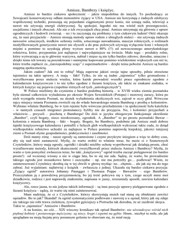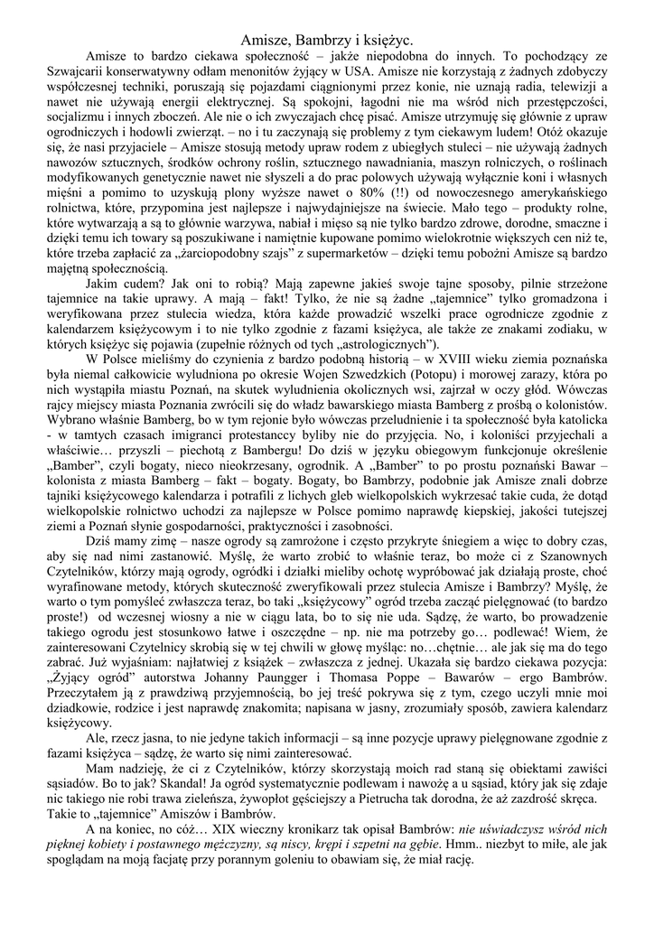 Amisze, Bambrzy i księżyc. Amisze to bardzo ciekawa społeczność – jakże niepodobna do innych. To pochodzący ze Szwajcarii konserwatywny odłam menonitów żyjący w USA. Amisze nie korzystają z żadnych zdobyczy współczesnej techniki, poruszają się pojazdami ciągnionymi przez konie, nie uznają radia, telewizji a nawet nie używają energii elektrycznej. Są spokojni, łagodni nie ma wśród nich przestępczości, socjalizmu i innych zboczeń. Ale nie o ich zwyczajach chcę pisać. Amisze utrzymuję się głównie z upraw ogrodniczych i hodowli zwierząt. – no i tu zaczynają się problemy z tym ciekawym ludem! Otóż okazuje się, że nasi przyjaciele – Amisze stosują metody upraw rodem z ubiegłych stuleci – nie używają żadnych nawozów sztucznych, środków ochrony roślin, sztucznego nawadniania, maszyn rolniczych, o roślinach modyfikowanych genetycznie nawet nie słyszeli a do prac polowych używają wyłącznie koni i własnych mięśni a pomimo to uzyskują plony wyższe nawet o 80% (!!) od nowoczesnego amerykańskiego rolnictwa, które, przypomina jest najlepsze i najwydajniejsze na świecie. Mało tego – produkty rolne, które wytwarzają a są to głównie warzywa, nabiał i mięso są nie tylko bardzo zdrowe, dorodne, smaczne i dzięki temu ich towary są poszukiwane i namiętnie kupowane pomimo wielokrotnie większych cen niż te, które trzeba zapłacić za „żarciopodobny szajs” z supermarketów – dzięki temu pobożni Amisze są bardzo majętną społecznością. Jakim cudem? Jak oni to robią? Mają zapewne jakieś swoje tajne sposoby, pilnie strzeżone tajemnice na takie uprawy. A mają – fakt! Tylko, że nie są żadne „tajemnice” tylko gromadzona i weryfikowana przez stulecia wiedza, która każde prowadzić wszelki prace ogrodnicze zgodnie z kalendarzem księżycowym i to nie tylko zgodnie z fazami księżyca, ale także ze znakami zodiaku, w których księżyc się pojawia (zupełnie różnych od tych „astrologicznych”). W Polsce mieliśmy do czynienia z bardzo podobną historią – w XVIII wieku ziemia poznańska była niemal całkowicie wyludniona po okresie Wojen Szwedzkich (Potopu) i morowej zarazy, która po nich wystąpiła miastu Poznań, na skutek wyludnienia okolicznych wsi, zajrzał w oczy głód. Wówczas rajcy miejscy miasta Poznania zwrócili się do władz bawarskiego miasta Bamberg z prośbą o kolonistów. Wybrano właśnie Bamberg, bo w tym rejonie było wówczas przeludnienie i ta społeczność była katolicka - w tamtych czasach imigranci protestanccy byliby nie do przyjęcia. No, i koloniści przyjechali a właściwie… przyszli – piechotą z Bambergu! Do dziś w języku obiegowym funkcjonuje określenie „Bamber”, czyli bogaty, nieco nieokrzesany, ogrodnik. A „Bamber” to po prostu poznański Bawar – kolonista z miasta Bamberg – fakt – bogaty. Bogaty, bo Bambrzy, podobnie jak Amisze znali dobrze tajniki księżycowego kalendarza i potrafili z lichych gleb wielkopolskich wykrzesać takie cuda, że dotąd wielkopolskie rolnictwo uchodzi za najlepsze w Polsce pomimo naprawdę kiepskiej, jakości tutejszej ziemi a Poznań słynie gospodarności, praktyczności i zasobności. Dziś mamy zimę – nasze ogrody są zamrożone i często przykryte śniegiem a więc to dobry czas, aby się nad nimi zastanowić. Myślę, że warto zrobić to właśnie teraz, bo może ci z Szanownych Czytelników, którzy mają ogrody, ogródki i działki mieliby ochotę wypróbować jak działają proste, choć wyrafinowane metody, których skuteczność zweryfikowali przez stulecia Amisze i Bambrzy? Myślę, że warto o tym pomyśleć zwłaszcza teraz, bo taki „księżycowy” ogród trzeba zacząć pielęgnować (to bardzo proste!) od wczesnej wiosny a nie w ciągu lata, bo to się nie uda. Sądzę, że warto, bo prowadzenie takiego ogrodu jest stosunkowo łatwe i oszczędne – np. nie ma potrzeby go… podlewać! Wiem, że zainteresowani Czytelnicy skrobią się w tej chwili w głowę myśląc: no…chętnie… ale jak się ma do tego zabrać. Już wyjaśniam: najłatwiej z książek – zwłaszcza z jednej. Ukazała się bardzo ciekawa pozycja: „Żyjący ogród” autorstwa Johanny Paungger i Thomasa Poppe – Bawarów – ergo Bambrów. Przeczytałem ją z prawdziwą przyjemnością, bo jej treść pokrywa się z tym, czego uczyli mnie moi dziadkowie, rodzice i jest naprawdę znakomita; napisana w jasny, zrozumiały sposób, zawiera kalendarz księżycowy. Ale, rzecz jasna, to nie jedyne takich informacji – są inne pozycje uprawy pielęgnowane zgodnie z fazami księżyca – sądzę, że warto się nimi zainteresować. Mam nadzieję, że ci z Czytelników, którzy skorzystają moich rad staną się obiektami zawiści sąsiadów. Bo to jak? Skandal! Ja ogród systematycznie podlewam i nawożę a u sąsiad, który jak się zdaje nic takiego nie robi trawa zieleńsza, żywopłot gęściejszy a Pietrucha tak dorodna, że aż zazdrość skręca. Takie to „tajemnice” Amiszów i Bambrów. A na koniec, no cóż… XIX wieczny kronikarz tak opisał Bambrów: nie uświadczysz wśród nich pięknej kobiety i postawnego mężczyzny, są niscy, krępi i szpetni na gębie. Hmm.. niezbyt to miłe, ale jak spoglądam na moją facjatę przy porannym goleniu to obawiam się, że miał rację. Autor jest typowym, klasycznym Bambrem a jego rodzina została opisana, jako „wzorcowo bamberska” we wszystkich wydaniach książki „Bambrzy. Mieszkańcy dawnych wsi Poznania” autorstwa niestrudzonej badaczki historii Bawarów poznańskich pani prof. Marii Paradowskiej.