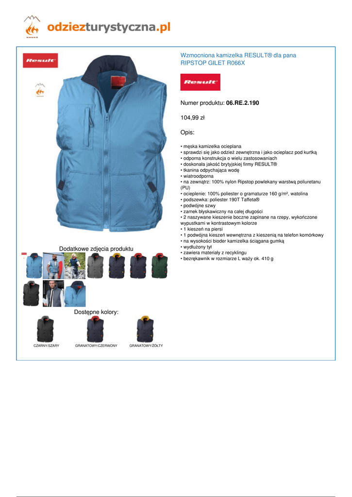 Wzmocniona kamizelka RESULT® dla pana RIPSTOP GILET R066X Numer produktu: 06.RE.2.190 104,99 zł Opis: Dodatkowe zdjęcia produktu Dostępne kolory: CZARNY/SZARY Powered by TCPDF (www.tcpdf.org) GRANATOWY/CZERWONY GRANATOWY/ŻÓŁTY • męska kamizelka ocieplana • sprawdzi się jako odzież zewnętrzna i jako ocieplacz pod kurtką • odporna konstrukcja o wielu zastosowaniach • doskonała jakość brytyjskiej firmy RESULT® • tkanina odpychająca wodę • wiatroodporna • na zewnątrz: 100% nylon Ripstop powlekany warstwą poliuretanu (PU) • ocieplenie: 100% poliester o gramaturze 160 g/m², watolina • podszewka: poliester 190T Taffeta® • podwójne szwy • zamek błyskawiczny na całej długości • 2 naszywane kieszenie boczne zapinane na rzepy, wykończone wypustkami w kontrastowym kolorze • 1 kieszeń na piersi • 1 podwójna kieszeń wewnętrzna z kieszenią na telefon komórkowy • na wysokości bioder kamizelka ściągana gumką • wydłużony tył • zawiera materiały z recyklingu • bezrękawnik w rozmiarze L waży ok. 410 g