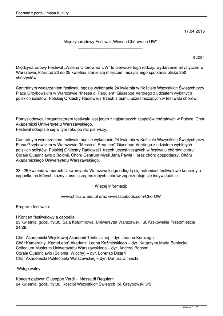 Pobrano z portalu Mapa Kultury 17.04.2015 Międzynarodowy Festiwal „Wiosna Chórów na UW” ____________________________ autor: Międzynarodowy Festiwal „Wiosna Chórów na UW” to pierwsze tego rodzaju wydarzenie artystyczne w Warszawie, która od 23 do 25 kwietnia stanie się miejscem muzycznego spotkania blisko 350 chórzystów. Centralnym wydarzeniem festiwalu będzie wykonanie 24 kwietnia w Kościele Wszystkich Świętych przy Placu Grzybowskim w Warszawie "Messa di Requiem" Giuseppe Verdiego z udziałem wybitnych polskich solistów, Polskiej Orkiestry Radiowej i trzech z ośmiu uczestniczących w festiwalu chórów. Pomysłodawcą i organizatorem festiwalu jest jeden z najstarszych zespołów chóralnych w Polsce, Chór Akademicki Uniwersytetu Warszawskiego. Festiwal odbędzie się w tym roku po raz pierwszy. Centralnym wydarzeniem festiwalu będzie wykonanie 24 kwietnia w Kościele Wszystkich Świętych przy Placu Grzybowskim w Warszawie "Messa di Requiem" Giuseppe Verdiego z udziałem wybitnych polskich solistów, Polskiej Orkiestry Radiowej i trzech uczestniczących w festiwalu chórów: chóru Corale Quadriclavio z Bolonii, Chóru Centrum Myśli Jana Pawła II oraz chóru gospodarzy, Chóru Akademickiego Uniwersytetu Warszawskiego. 23 i 25 kwietnia w murach Uniwersytetu Warszawskiego odbędą się natomiast festiwalowe koncerty a cappella, na których każdy z ośmiu zaproszonych chórów zaprezentuje się indywidualnie. Więcej informacji: www.chor.uw.edu.pl oraz www.facebook.com/ChorUW Program festiwalu: I Koncert festiwalowy a cappella 23 kwietnia, godz. 19:30, Sala Kolumnowa, Uniwersytet Warszawski, ul. Krakowskie Przedmieście 24/26 Chór Akademicki Wojskowej Akademii Technicznej – dyr. Joanna Korczago Chór Kameralny „KameLeon” Akademii Leona Koźmińskiego – dyr. Katarzyna Maria Boniecka Collegium Musicum Uniwersytetu Warszawskiego – dyr. Andrzej Borzym Corale Quadriclavio (Bolonia, Włochy) – dyr. Lorenzo Bizarri Chór Akademicki Politechniki Warszawskiej – dyr. Dariusz Zimnicki Wstęp wolny Koncert galowy: Giuseppe Verdi - Messa di Requiem 24 kwietnia, godz. 19:30, Kościół Wszystkich Świętych, pl. Grzybowski 3/5 strona 1 / 2 Pobrano z portalu Mapa Kultury Wioletta Chodowicz – sopran Agnieszka Rehlis – mezzosopran Rafał Bartmiński – tenor Piotr Nowacki – bas Polska Orkiestra Radiowa Chór Akademicki Uniwersytetu Warszawskiego Chór Centrum Myśli Jana Pawła II Corale Quadriclavio (Bolonia, Włochy) Dyrygent: Irina Bogdanovich Bilety w cenie 25 zł dostępne na stronie ebilet.pl, w salonach EMPIK oraz bezpośrednio przed koncertem. II Koncert festiwalowy a cappella 25 kwietnia, godz. 19:30, Audytorium Maximum, Uniwersytet Warszawski, ul. Krakowskie Przedmieście 26/28 Chór Akademicki Uniwersytetu Warszawskiego – dyr. Irina Bogdanovich Chór Wydziału Fizyki Uniwersytetu Warszawskiego – dyr. Katarzyna Płońska Chór Wydziału Zarządzania Uniwersytetu Warszawskiego – dyr. Joanna Dacko Chór Centrum Myśli Jana Pawła II – dyr. Zofia Borkowska Wstęp wolny strona 2 / 2