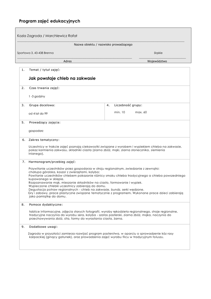 Program zajęć edukacyjnych Kozia Zagroda / Marchlewicz Rafał ______________________________________________________________________________________________________________________ Nazwa obiektu / nazwisko prowadzącego Sportowa 3, 43-438 Brenna _________________________________________________________________________________ Adres 1. śląskie _________________________________ Województwo Temat / tytuł zajęć: Jak powstaje chleb na zakwasie 2. Czas trwania zajęć: 1 -3 godziny 3. Grupa docelowa: od 4 lat do 99 5. 4. Liczebność grupy: min. 10 max. 60 Prowadzący zajęcia: gospodarz 6. Zakres tematyczny: Uczestnicy w trakcie zajęć poznają ciekawostki związane z wyrobem i wypiekiem chleba na zakwasie, pokaz karmienia zakwasu, składniki ciasta (ziarno zbóż, mąki, ziarna słonecznika , siemienia lnianego), 7. Harmonogram/przebieg zajęć: Przywitanie uczestników przez gospodarza w stroju regionalnym, zwiedzanie z zewnątrz: chałupa góralska, koszor z zwierzętami, kolyba ; Powitanie uczestników chlebem pokazanie różnicy smaku chleba tra dycyjnego a chleba powszedniego kupowanego w sklepie. Rozpoznawanie mąk, mieszanie składników na ciasto, formowanie i wypiek. Wypieczone chlebki uczestnicy zabierają do domu. Degustacja potraw regionalnych - chleb na zakwasie, bundz, serki wędzone. Gry i zabawy, prace plastyczne związane tematycznie z programem. Wykonane prace dzieci zabierają jako pamiątkę do domu. 8. Pomoce dydaktyczne: tablice informacyjne, zdjęcia starych fotografii, wyroby rękodzieła regionalnego, stroje regionalne, tradycyjne naczynia do wyrobu sera, kolyba - szałas pasterski, ziarna zbóż, mąka, naczynia do przechowywania zbóż, sita, formy do wyrastania ciasta, żarna. 9. Dodatkowe uwagi: Zagroda w przyszłości zamierza rozwijać program pasterstwa, w oparciu o sprowadzenie kóz rasy karpackiej (ginący gatunek), oraz prowadzenia zajęć wyrobu filcu w tradycyjnym fo luszu.