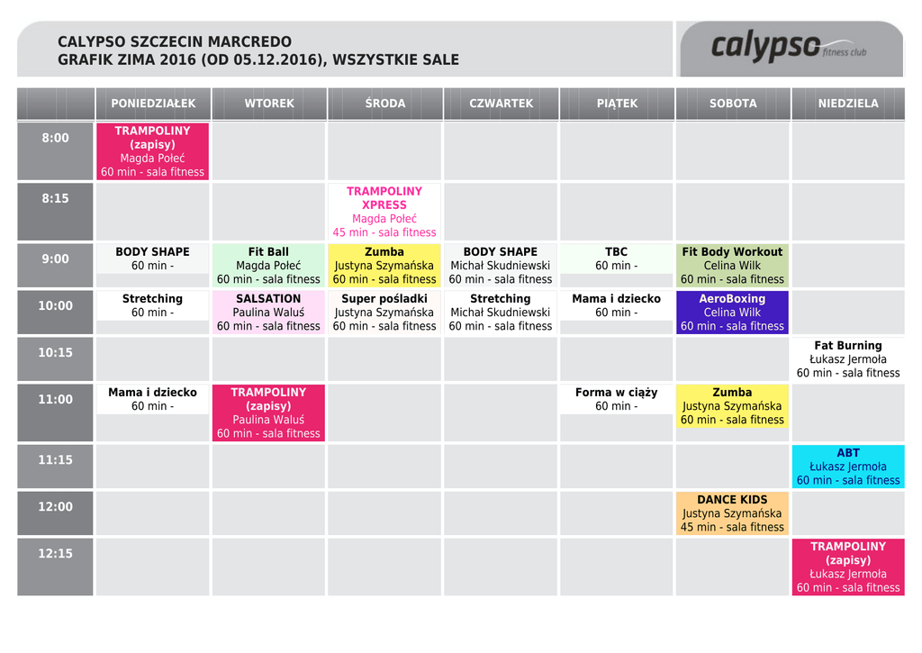 CALYPSO SZCZECIN MARCREDO GRAFIK ZIMA 2016 (OD 05.12.2016), WSZYSTKIE SALE PONIEDZIAŁEK 8:00 WTOREK ŚRODA CZWARTEK PIĄTEK SOBOTA TRAMPOLINY (zapisy) Magda Połeć 60 min - sala fitness TRAMPOLINY XPRESS Magda Połeć 45 min - sala fitness 8:15 9:00 BODY SHAPE 60 min - Fit Ball Magda Połeć 60 min - sala fitness Zumba Justyna Szymańska 60 min - sala fitness BODY SHAPE Michał Skudniewski 60 min - sala fitness TBC 60 min - Fit Body Workout Celina Wilk 60 min - sala fitness 10:00 Stretching 60 min - SALSATION Paulina Waluś 60 min - sala fitness Super pośladki Justyna Szymańska 60 min - sala fitness Stretching Michał Skudniewski 60 min - sala fitness Mama i dziecko 60 min - AeroBoxing Celina Wilk 60 min - sala fitness Fat Burning Łukasz Jermoła 60 min - sala fitness 10:15 11:00 Mama i dziecko 60 min - TRAMPOLINY (zapisy) Paulina Waluś 60 min - sala fitness Forma w ciąży 60 min - Zumba Justyna Szymańska 60 min - sala fitness ABT Łukasz Jermoła 60 min - sala fitness 11:15 12:00 12:15 NIEDZIELA DANCE KIDS Justyna Szymańska 45 min - sala fitness TRAMPOLINY (zapisy) Łukasz Jermoła 60 min - sala fitness TRAMPOLINY DLA DZIECI Justyna Szymańska 45 min - sala fitness 13:00 16:00 17:00 17:30 18:00 TRAMPOLINY (zapisy) Justyna Szymańska 60 min - sala fitness DANCE KIDS Justyna Szymańska 45 min - sala fitness Forma w ciąży 60 min - TRAMPOLINY (zapisy) Justyna Szymańska 60 min - sala fitness Zdrowy kręgosłup & Pilates Magda Połeć 60 min - sala fitness Zumba Justyna Szymańska 60 min - sala fitness TRAMPOLINY (zapisy) Ola Kłusek 60 min - sala fitness TBC 60 min - Zumba Justyna Szymańska 60 min - sala fitness Fat Burning Ola Kłusek 60 min - sala fitness Xpress Brzuch 30 min - siłownia XPress Pośladki 60 min - siłownia Xpress Brzuch 30 min - siłownia Fit Body Workout 60 min - Step Magda Połeć 60 min - sala fitness Power Pump Ola Kłusek 60 min - sala fitness Fit Body Workout Krzysztof Barcz 60 min - sala fitness TRAMPOLINY (zapisy) Krzysztof Barcz 60 min - sala fitness Xpress TRX 30 min - siłownia Joga Joanna Staszewska 60 min - sala fitness Zumba Justyna Szymańska 60 min - sala fitness BIKE Ola Kłusek 60 min - sala rowerowa 19:00 Fat Burning (zapisy) Magda Połeć 60 min - sala fitness BIKE Ola Kłusek 60 min - sala rowerowa 20:00 TRAMPOLINY (zapisy) Ola Kłusek 60 min - sala fitness 21:00 21:15 SALSATION Paulina Waluś 60 min - sala fitness CROSS TRAINING Celina Wilk 60 min - sala fitness BIKE Magda Połeć 60 min - sala rowerowa Joga Joanna Staszewska 60 min - sala fitness BIKE Łukasz Jermoła 60 min - sala rowerowa BIKE Magda Połeć 60 min - sala rowerowa BIKE Ola Kłusek 60 min - sala rowerowa Power Pump Łukasz Jermoła 60 min - sala fitness SALSATION Paulina Waluś 60 min - sala fitness Zdrowy Kręgosłup Krzysztof Barcz 60 min - sala fitness Płaski brzuch / Stretching Krzysztof Barcz 60 min - sala fitness AeroBoxing Celina Wilk 60 min - sala fitness TRAMPOLINY (zapisy) Paulina Waluś 60 min - sala fitness CROSS TRAINING Celina Wilk 60 min - sala fitness Trening funkcjonalny Celina Wilk 60 min - sala fitness