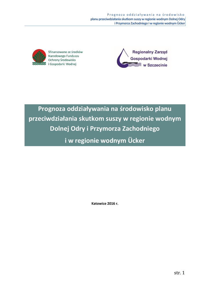 Prognoza oddziaływania na środowisko planu przeciwdziałania skutkom suszy w regionie wodnym Dolnej Odry i Przymorza Zachodniego i w regionie wodnym Ücker Prognoza oddziaływania na środowisko planu przeciwdziałania skutkom suszy w regionie wodnym Dolnej Odry i Przymorza Zachodniego i w regionie wodnym Ücker Katowice 2016 r. str. 1 Prognoza oddziaływania na środowisko planu przeciwdziałania skutkom suszy w regionie wodnym Dolnej Odry i Przymorza Zachodniego i w regionie wodnym Ücker ZESPÓŁ AUTORSKI: dr Adam Hamerla dr Łukasz Pierzchała mgr inż. Paweł Łabaj mgr inż. Janusz Kubica mgr inż. Paweł Zawartka dr inż. Mariusz Kruczek mgr Marta Wiesner-Sękala mgr Małgorzata Deska mgr Małgorzata Markowska str. 2 Prognoza oddziaływania na środowisko planu przeciwdziałania skutkom suszy w regionie wodnym Dolnej Odry i Przymorza Zachodniego i w regionie wodnym Ücker Spis treści Spis treści ..................................................................................................................................................3 Spis rysunków ...........................................................................................................................................5 Spis tabel ..................................................................................................................................................6 Streszczenie w języku niespecjalistycznym ..............................................................................................8 1. Wprowadzenie............................................................................................................................... 15 1.1. Podstawy formalno-prawne .......................................................................................................... 15 1.2. Indeks skrótów............................................................................................................................... 15 2. Cel i zakres prognozy, stopieo szczegółowości prowadzonych prac i metody zastosowane przy sporządzaniu prognozy .................................................................................................................. 17 2.1. Cel i zakres Prognozy ..................................................................................................................... 17 2.2. Przyjęty model oceny projektu PPSS ............................................................................................. 18 2.3. Metody zastosowane przy opracowywaniu prognozy .................................................................. 19 2.4. Wskazanie napotkanych trudności wynikających z niedostatków techniki lub luk we współczesnej wiedzy...................................................................................................................... 22 3. Analiza zawartości projektu PPSS i jego zgodności z innymi dokumentami ................................. 22 3.1. Ocena zapisów PPSS ze szczególnym uwzględnieniem kwestii horyzontalnych i celów szczegółowych ............................................................................................................................... 22 3.2. Ocena zaproponowanego sposobu wdrażania, monitoringu oraz przewidywanych metod analiz skutków realizacji wdrażanego dokumentu w kontekście zasad zrównoważonego rozwoju i ochrony środowiska....................................................................................................................... 27 3.3. Ocena powiązao projektu PPSS z innymi dokumentami strategicznymi ....................................... 28 3.3.1. Wybrane dokumenty szczebla międzynarodowego i wspólnotowego....................................... 28 3.3.2. Wybrane dokumenty szczebla krajowego .................................................................................. 33 4. Analiza stanu bieżącego................................................................................................................. 50 4.1. Różnorodnośd biologiczna, w tym rośliny i zwierzęta ................................................................... 50 4.2. Obszary chronione, w tym obszary Natura 2000 .......................................................................... 54 4.3. Wody (jakośd i zasoby wód)........................................................................................................... 66 4.4. Powietrze. Jakośd powietrza względem wymogów ochrony zdrowia ........................................... 90 4.5. Klimat ............................................................................................................................................. 93 4.6. Powierzchnia ziemi (gleby, erozja) ................................................................................................ 95 4.7. Krajobraz ........................................................................................................................................ 96 4.8. Zasoby naturalne ........................................................................................................................... 98 4.9. Ludzie ........................................................................................................................................... 106 4.10. Zabytki i dobra materialne ........................................................................................................ 109 str. 3 Prognoza oddziaływania na środowisko planu przeciwdziałania skutkom suszy w regionie wodnym Dolnej Odry i Przymorza Zachodniego i w regionie wodnym Ücker 5. Ocena skutków realizacji projektu PPSS z uwzględnieniem oddziaływania na poszczególne elementy środowiska................................................................................................................... 112 5.1. Przewidywane znaczące oddziaływania na różnorodnośd biologiczną ....................................... 123 5.2. Przewidywane znaczące oddziaływania na obszary c