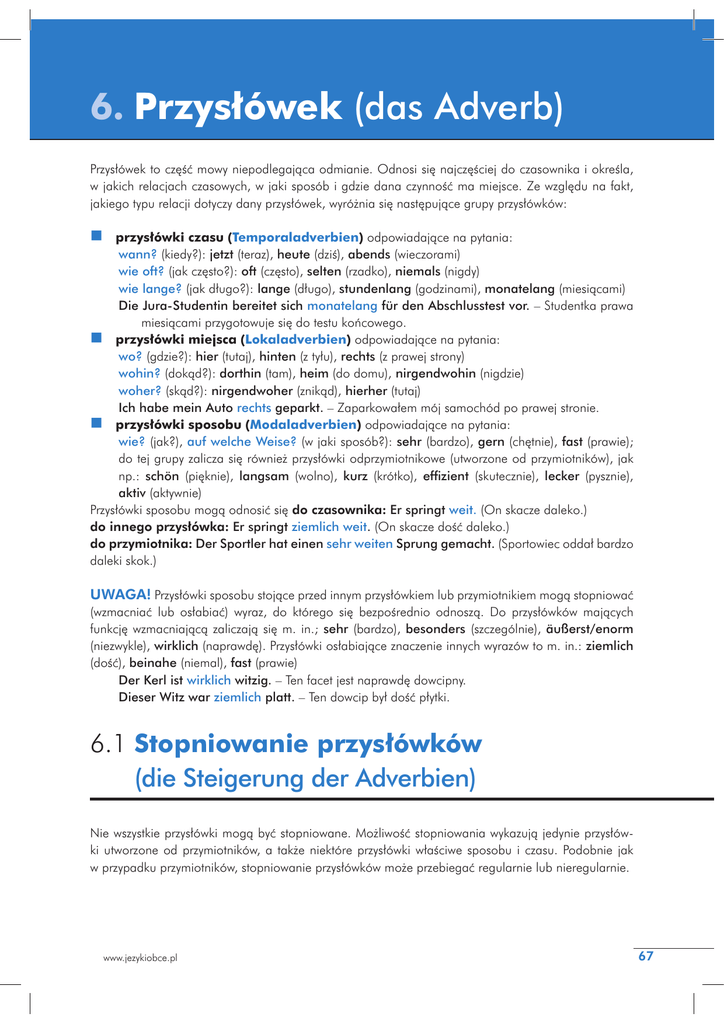 6. Przysłówek (das Adverb) Przysłówek to część mowy niepodlegająca odmianie. Odnosi się najczęściej do czasownika i określa, w jakich relacjach czasowych, w jaki sposób i gdzie dana czynność ma miejsce. Ze względu na fakt, jakiego typu relacji dotyczy dany przysłówek, wyróżnia się następujące grupy przysłówków: n przysłówki czasu (Temporaladverbien) odpowiadające na pytania: wann? (kiedy?): jetzt (teraz), heute (dziś), abends (wieczorami) wie oft? (jak często?): oft (często), selten (rzadko), niemals (nigdy) wie lange? (jak długo?): lange (długo), stundenlang (godzinami), monatelang (miesiącami) Die Jura-Studentin bereitet sich monatelang für den Abschlusstest vor. – Studentka prawa miesiącami przygotowuje się do testu końcowego. n przysłówki miejsca (Lokaladverbien) odpowiadające na pytania: wo? (gdzie?): hier (tutaj), hinten (z tyłu), rechts (z prawej strony) wohin? (dokąd?): dorthin (tam), heim (do domu), nirgendwohin (nigdzie) woher? (skąd?): nirgendwoher (znikąd), hierher (tutaj) Ich habe mein Auto rechts geparkt. – Zaparkowałem mój samochód po prawej stronie. n przysłówki sposobu (Modaladverbien) odpowiadające na pytania: wie? (jak?), auf welche Weise? (w jaki sposób?): sehr (bardzo), gern (chętnie), fast (prawie); do tej grupy zalicza się również przysłówki odprzymiotnikowe (utworzone od przymiotników), jak np.: schön (pięknie), langsam (wolno), kurz (krótko), effizient (skutecznie), lecker (pysznie), aktiv (aktywnie) Przysłówki sposobu mogą odnosić się do czasownika: Er springt weit. (On skacze daleko.) do innego przysłówka: Er springt ziemlich weit. (On skacze dość daleko.) do przymiotnika: Der Sportler hat einen sehr weiten Sprung gemacht. (Sportowiec oddał bardzo daleki skok.) UWAGA! Przysłówki sposobu stojące przed innym przysłówkiem lub przymiotnikiem mogą stopniować (wzmacniać lub osłabiać) wyraz, do którego się bezpośrednio odnoszą. Do przysłówków mających funkcję wzmacniającą zaliczają się m. in.; sehr (bardzo), besonders (szczególnie), äußerst/enorm (niezwykle), wirklich (naprawdę). Przysłówki osłabiające znaczenie innych wyrazów to m. in.: ziemlich (dość), beinahe (niemal), fast (prawie) Der Kerl ist wirklich witzig. – Ten facet jest naprawdę dowcipny. Dieser Witz war ziemlich platt. – Ten dowcip był dość płytki. 6.1 Stopniowanie przysłówków (die Steigerung der Adverbien) Nie wszystkie przysłówki mogą być stopniowane. Możliwość stopniowania wykazują jedynie przysłówki utworzone od przymiotników, a także niektóre przysłówki właściwe sposobu i czasu. Podobnie jak w przypadku przymiotników, stopniowanie przysłówków może przebiegać regularnie lub nieregularnie. www.jezykiobce.pl 67 NIEMIECKI GRAMATYKA Stopniowanie regularne W stopniu wyższym przysłówki otrzymują końcówkę -er, a w stopniu najwyższym przedimek am i końcówkę -(e)sten. stopień równy schnell (szybko) weit (daleko) kalt (zimno) kurz (krótko) ruhig (spokojnie) wenig (mało) interessant (interesująco) bequem (wygodnie) stark (mocno) schlecht (źle) langsam (wolno) günstig (korzystnie) warm (ciepło) klug (mądrze) pünktlich (punktualnie) stopień wyższy schneller (szybciej) weiter (dalej) kälter (zimniej) kürzer (krócej) ruhiger (spokojniej) weniger (mniej) interessanter (bardziej interersująco) bequemer (wygodniej) stärker (mocniej) schlechter (gorzej) langsamer (wolniej) günstiger (korzystniej) wärmer (cieplej) klüger (mądrzej) pünktlicher (punktualniej) stopień najwyższy am schnellsten (najszybciej) am weitesten (najdalej) am kältesten (najzimniej) am kürzesten (najkrócej) am ruhigsten (najspokojniej) am wenigsten (najmniej) am interessantesten (najbardziej interesująco) am bequemsten (najwygodniej) am stärksten (najmocniej) am schlechtesten (najgorzej) am langsamsten (najwolniej) am günstigsten (najkorzystniej) am wärmsten (najcieplej) am klügsten (najmądrzej) am pünktlichsten (najpunktualnie) UWAGA! Przysłówki odprzymiotnikowe jednosylabowe otrzymują przegłos w stopniu wyższym i najwyższym, jeśli mają w temacie samogłoskę: a, o lub u. Stopniowanie nieregularne stopień równy bald (niedługo) oft (często) gut (dobrze) viel (dużo) gern (chętnie) wenig (mało) stopień wyższy eher (wcześniej) öfter/häufiger (częściej) besser (lepiej) mehr (więcej) lieber (chętniej) weniger (mniej) stopień najwyższy am ehesten (najwcześniej) am häufigsten (najczęściej) am besten (najlepiej) am meisten (najwięcej) am liebsten (najchętniej) am wenigsten (najmniej) Die Erzieherin arbeitet mit Kindern lieber als mit Jugendlichen. – Wychowawczyni pracuje chętniej z dziećmi niż z młodzieżą. Die neue Maschine funktioniert besser als die alte. – Nowa maszyna działa lepiej niż stara. Am häufigsten bekomme ich Blumen zum Geburtstag. – Najczęściej dostaję na urodziny kwiaty. Wir sind schon mehrmals umgezogen, aber hier wohnt man am ruhigsten. – Przeprowadzaliśmy się już wiele razy, ale tu mieszka się najspokojniej. 68 6. PRZYSŁÓWEK ĆWICZENIA 1 Wstaw odpowiedni przysłówek w stopniu równym lub wyższym zgodnie z tłumaczeniem. (elegant, gern, bequem, laut, kurz, langsam, schön, oft) 1. 2. 3. 4. 5. 6. 7. 8. Diese Pflanze wächst ………………………………….. als die anderen in diesem Zimmer. (Ta roślina rośnie wolniej niż inne w tym pokoju). In diesem Sessel sitzt man ………………………………….. als auf dem Stuhl. (Na tym fotelu siedzi się wygodniej niż na krześle). Deine Freundin lächelt ………………………………….. (Twoja przyjaciółka pięknie się uśmiecha). Ich hoffe, der Workshop wird ………………………………….. als der letztere dauern. (Mam nadzieję, że te warsztaty będą trwały krócej niż ostatnie). Die Braut sieht ………………………………….. aus. (Panna młoda wygląda elegancko). Wir streiten jetzt …………