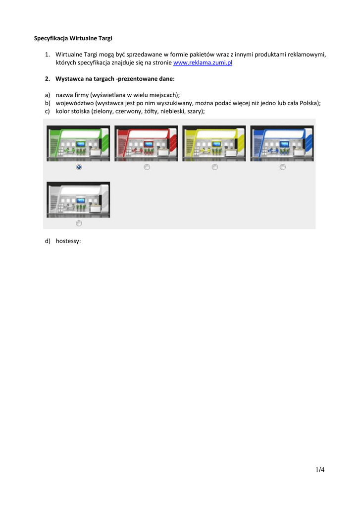 Specyfikacja Wirtualne Targi 1. Wirtualne Targi mogą byd sprzedawane w formie pakietów wraz z innymi produktami reklamowymi, których specyfikacja znajduje się na stronie www.reklama.zumi.pl 2. Wystawca na targach -prezentowane dane: a) nazwa firmy (wyświetlana w wielu miejscach); b) województwo (wystawca jest po nim wyszukiwany, można podad więcej niż jedno lub cała Polska); c) kolor stoiska (zielony, czerwony, żółty, niebieski, szary); d) hostessy: 1/4 e) strona www (wyświetlana w wielu miejscach); f) strona na Facebooku (wyświetlana w menu na stoisku); g) dane adresowe wyświetlane na stronie stoiska (max 8 linijek, więcej danych można podad na podstronie kontakt); h) dane adresowe wyświetlane na podstronie stoiska (bez ograniczeo); 2/4 i) krótki opis firmy (wyświetlana w wielu miejscach, ok. 200 znaków opisu wraz ze spacjami); j) opis firmy wyświetlony na podstronie stoiska; k) kategoria i branża oraz słowa kluczowe z branży (do 30 słów kluczowych), max 250 znaków wraz ze spacjami; l) kod Google Analytics (opcjonalnie). 3. Pliki graficzne w formacie PNG lub JPG o rozmiarze maksymalnie 500 kb. a) Logo firmy dobrej jakości (powyżej szerokości: 500 px oraz wysokości: 200 px) b) Szyld na stoisku (Wystawca zwykły: Szer. 520 px , Wys.: 100 px, regionalny Szer. 440 px , Wys.: 90 px, VIP: Szer. 415 px , Wys.: 84 px rozszerzenie png / jpg) c) Logo na biurku (Wystawca zwykły: Szer. 115 px , Wys.: 65 px, regionalny: Szer. 67 px , Wys.: 38 px, VIP: Szer. 109 px , Wys.: 45 px, rozszerzenie png, najlepsze tło: przezroczyste) d) Logo lub film z youtube na ekran monitora (: Szer. 136 px , Wys.: 70 px) 3/4 4. Pliki do pobrania:(max 1 plik dla stoisk zwykłych) Pliki w formacie: pdf, doc, docx, ppt, jpg, png, gif. Maksymalna wielkośd pliku 4.90 MB. Do pliku należy dołączyd nazwę oraz krótki opis. 5. Filmy: Wymagany link do filmu na YouTubie. Do filmu należy dołączyd nazwę oraz krótki opis. Jeden z filmów może byd wyświetlany na stoisku. Konieczne określenie, który z klipów video ma byd umieszczony na wizualizacji telewizora na stoisku. 6. Produkty Dane (max 30 produktów dla stoisk VIP i regionalnych, max 5 dla stoisk zwykłych) Nazwa produktu (wyświetla się na liście produktów oraz w opisie produktu) Zdjęcie w formacie jpg, png, szerokośd: 800 px wysokośd: 600 px (wyświetla się na liście produktów oraz w opisie produktu) Krótki opis (wyświetla się na liście produktów) Link produktu – na stronie/w sklepie wystawcy (wyświetla się w opisie produktu) Opis produktu(wyświetla się w opisie produktu) 4/4