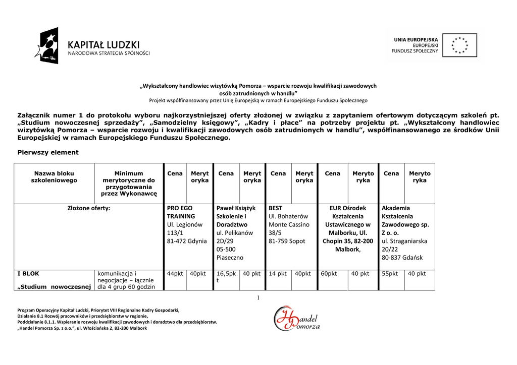 „Wykształcony handlowiec wizytówką Pomorza – wsparcie rozwoju kwalifikacji zawodowych osób zatrudnionych w handlu” Projekt współfinansowany przez Unię Europejską w ramach Europejskiego Funduszu Społecznego Załącznik numer 1 do protokołu wyboru najkorzystniejszej oferty złożonej w związku z zapytaniem ofertowym dotyczącym szkoleń pt. „Studium nowoczesnej sprzedaży”, „Samodzielny księgowy”, „Kadry i płace” na potrzeby projektu pt. „Wykształcony handlowiec wizytówką Pomorza – wsparcie rozwoju i kwalifikacji zawodowych osób zatrudnionych w handlu”, współfinansowanego ze środków Unii Europejskiej w ramach Europejskiego Funduszu Społecznego. Pierwszy element Nazwa bloku szkoleniowego Minimum merytoryczne do przygotowania przez Wykonawcę Złożone oferty: I BLOK „Studium nowoczesnej komunikacja i negocjacje – łącznie dla 4 grup 60 godzin Cena Meryt oryka Cena Meryt oryka Cena Meryt oryka PRO EGO TRAINING Ul. Legionów 113/1 81-472 Gdynia Paweł Książyk Szkolenie i Doradztwo ul. Pelikanów 2D/29 05-500 Piaseczno BEST Ul. Bohaterów Monte Cassino 38/5 81-759 Sopot 44pkt 16,5pk t 14 pkt 40pkt 40 pkt 1 Program Operacyjny Kapitał Ludzki, Priorytet VIII Regionalne Kadry Gospodarki, Działanie 8.1 Rozwój pracowników i przedsiębiorstw w regionie, Poddziałanie 8.1.1. Wspieranie rozwoju kwalifikacji zawodowych i doradztwo dla przedsiębiorstw. „Handel Pomorza Sp. z o.o.”, ul. Włościańska 2, 82-200 Malbork 40pkt Cena Meryto ryka EUR Ośrodek Kształcenia Ustawicznego w Malborku, Ul. Chopin 35, 82-200 Malbork, 60pkt 40 pkt Cena Meryto ryka Akademia Kształcenia Zawodowego sp. Z o. o. ul. Straganiarska 20/22 80-837 Gdańsk 55pkt 40 pkt „Wykształcony handlowiec wizytówką Pomorza – wsparcie rozwoju kwalifikacji zawodowych osób zatrudnionych w handlu” sprzedaży” 120 godzin lekcyjnych II BLOK „Samodzielny księgowy” 120 godzin Projekt współfinansowany przez Unię Europejską w ramach Europejskiego Funduszu Społecznego lekcyjnych, umiejętności i techniki 44pkt 40pkt 16,5pk 40 pkt 16,5pk 40 pkt 60pkt 40 pkt sprzedażowe – łącznie t t dla 4 grup 120 godzin lekcyjnych, techniki i narzędzia 0 0 0 0 14pkt 40 pkt 60pkt 40 pkt logistyczne – łącznie dla 4 grup 60 godzin lekcyjnych, obsługę trudnego 44pkt 40pkt 16,5pk 40pkt 14pkt 40 pkt 60pkt 40 pkt klienta – łącznie dla 4 t grup 60 godzin lekcyjnych, wystrój wnętrz , 39pkt 40pkt 16,5pk 10pkt 14pkt 40 pkt 60pkt 40 pkt rozłożenie towaru – t łącznie dla 4 grup 60 godzin lekcyjnych, zarządzanie – łącznie 44pkt 40pkt 16,5pk 40pkt 14pkt 40 pkt 60pkt 40 pkt dla 4 grup 60 godzin t lekcyjnych, marketing – łącznie 44pkt 40pkt 16,5pk 10pkt 14pkt 40 pkt 60pkt 40 pkt dla 4 grup 60 godzin t lekcyjnych, komunikacja i 44pkt 40pkt 16,5pk 40pkt 14pkt 40 pkt 60pkt 40 pkt negocjacje – łącznie t dla 4 grup 60 godzin lekcyjnych, 2 Program Operacyjny Kapitał Ludzki, Priorytet VIII Regionalne Kadry Gospodarki, Działanie 8.1 Rozwój pracowników i przedsiębiorstw w regionie, Poddziałanie 8.1.1. Wspieranie rozwoju kwalifikacji zawodowych i doradztwo dla przedsiębiorstw. „Handel Pomorza Sp. z o.o.”, ul. Włościańska 2, 82-200 Malbork 55pkt 40 pkt 55pkt 40 pkt 55pkt 40 pkt 55pkt 40 pkt 55pkt 40 pkt 55pkt 40 pkt 55pkt 40 pkt „Wykształcony handlowiec wizytówką Pomorza – wsparcie rozwoju kwalifikacji zawodowych osób zatrudnionych w handlu” lekcyjnych Projekt współfinansowany przez Unię Europejską w ramach Europejskiego Funduszu Społecznego wstęp do 0 0 0 0 14pkt 40 pkt 60pkt 40 pkt rachunkowości finansowej – łącznie dla 4 grup 20 godzin, lekcyjnych aktywa pieniężne – 0 0 0 0 14pkt 40 pkt 60pkt 40 pkt łącznie dla 4 grup 40 godzin lekcyjnych, wynagrodzenia 0 0 0 0 16,5pk 40 pkt 60pkt 40 pkt łącznie dla 4 grup 60 t godzin lekcyjnych, podatki – łącznie dla 4 0 0 0 0 14pkt 40 pkt 60pkt 40 pkt grup 100 godzin lekcyjnych, ewidencja 0 0 0 0 14pkt 40 pkt 60pkt 40 pkt rozrachunków – łącznie dla 4 grup 40 godzin lekcyjnych, aktywa trwałe w 0 0 0 0 14pkt 40 pkt 60pkt 40 pkt ewidencji – łącznie dla 4 grup 40 godzin lekcyjnych, towary i materiały – 0 0 0 0 14pkt 40 pkt 60pkt 40 pkt łącznie dla 4 grup 20 godzin lekcyjnych, koszty w 0 0 0 0 16,5pk 40 pkt 60pkt 40 pkt przedsiębiorstwie – t łącznie dla 4 grup 60 3 Program Operacyjny Kapitał Ludzki, Priorytet VIII Regionalne Kadry Gospodarki, Działanie 8.1 Rozwój pracowników i przedsiębiorstw w regionie, Poddziałanie 8.1.1. Wspieranie rozwoju kwalifikacji zawodowych i doradztwo dla przedsiębiorstw. „Handel Pomorza Sp. z o.o.”, ul. Włościańska 2, 82-200 Malbork 55pkt 40 pkt 55pkt 40 pkt 55pkt 40 pkt 55pkt 40 pkt 37pkt 40 pkt 55pkt 40 pkt 55pkt 40 pkt 55pkt 40 pkt „Wykształcony handlowiec wizytówką Pomorza – wsparcie rozwoju kwalifikacji zawodowych osób zatrudnionych w handlu” III BLOK „Kadry i płace” godzin lekcyjnych 120 Projekt współfinansowany przez Unię Europejską w ramach Europejskiego Funduszu Społecznego godzin lekcyjnych, obrót produktami 0 0 0 0 14pkt 40 pkt 60pkt 40 pkt łącznie dla 4 grup 40 godzin lekcyjnych. komunikacja i 44pkt 40pkt 16,5pk 40 pkt 16,5pk 40 pkt 60pkt 40 pkt negocjacje – łącznie t t dla 4 grup 60 godzin lekcyjnych, prawo pracy – łącznie 0 0 0 0 14pkt 40 pkt 60pkt 40 pkt dla 4 grup 120 godzin lekcyjnych, kadrowy – łącznie dla 0 0 0 0 14pkt 40 pkt 60pkt 40 pkt 4 grup 120 godzin lekcyjnych, ZUS - łącznie dla 4 0 0 0 0 14pkt 40 pkt 60pkt 40 pkt grup 80 godzin lekcyjnych, Płace – łącznie dla 4 0 0 0 0 16,5pk 40 pkt 60pkt 40 pkt grup 100 godzin t lekcyjnych. 4 Program Operacyjny Kapitał Ludzki, Priorytet VIII Regionalne Kadry Gospodarki, Działanie 8.1 Rozwój pracowników i przedsiębiorstw w regionie, Poddziałanie 8.1.1. Wspieranie rozwoju kwalifikacji zawodowych i doradztwo dla przedsiębiorstw. „Handel Pomorza Sp. z o.o.”, ul. Włościańska 2, 82-200 Malbork 55pkt 40 pkt 55pkt 40 pkt 55pkt 