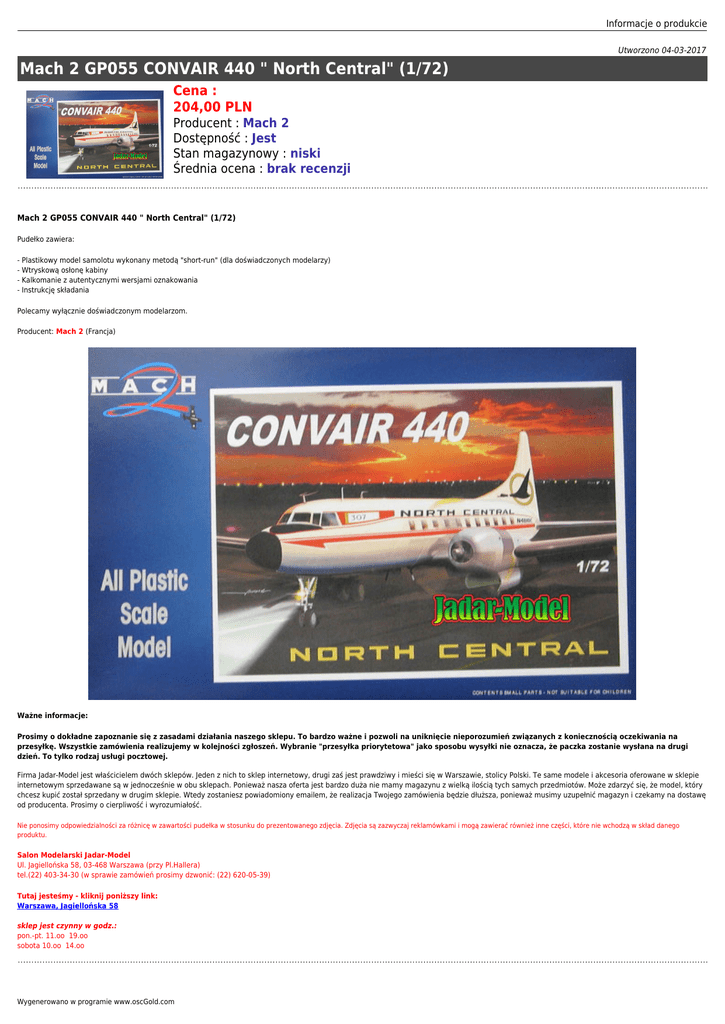 Informacje o produkcie Utworzono 04-03-2017 Mach 2 GP055 CONVAIR 440 " North Central" (1/72) Cena : 204,00 PLN Producent : Mach 2 Dostępność : Jest Stan magazynowy : niski Średnia ocena : brak recenzji Mach 2 GP055 CONVAIR 440 " North Central" (1/72) Pudełko zawiera: - Plastikowy model samolotu wykonany metodą "short-run" (dla doświadczonych modelarzy) - Wtryskową osłonę kabiny - Kalkomanie z autentycznymi wersjami oznakowania - Instrukcję składania Polecamy wyłącznie doświadczonym modelarzom. Producent: Mach 2 (Francja) Ważne informacje: Prosimy o dokładne zapoznanie się z zasadami działania naszego sklepu. To bardzo ważne i pozwoli na uniknięcie nieporozumień związanych z koniecznością oczekiwania na przesyłkę. Wszystkie zamówienia realizujemy w kolejności zgłoszeń. Wybranie "przesyłka priorytetowa" jako sposobu wysyłki nie oznacza, że paczka zostanie wysłana na drugi dzień. To tylko rodzaj usługi pocztowej. Firma Jadar-Model jest właścicielem dwóch sklepów. Jeden z nich to sklep internetowy, drugi zaś jest prawdziwy i mieści się w Warszawie, stolicy Polski. Te same modele i akcesoria oferowane w sklepie internetowym sprzedawane są w jednocześnie w obu sklepach. Ponieważ nasza oferta jest bardzo duża nie mamy magazynu z wielką ilością tych samych przedmiotów. Może zdarzyć się, że model, który chcesz kupić został sprzedany w drugim sklepie. Wtedy zostaniesz powiadomiony emailem, że realizacja Twojego zamówienia będzie dłuższa, ponieważ musimy uzupełnić magazyn i czekamy na dostawę od producenta. Prosimy o cierpliwość i wyrozumiałość. Nie ponosimy odpowiedzialności za różnicę w zawartości pudełka w stosunku do prezentowanego zdjęcia. Zdjęcia są zazwyczaj reklamówkami i mogą zawierać również inne części, które nie wchodzą w skład danego produktu. Salon Modelarski Jadar-Model Ul. Jagiellońska 58, 03-468 Warszawa (przy Pl.Hallera) tel.(22) 403-34-30 (w sprawie zamówień prosimy dzwonić: (22) 620-05-39) Tutaj jesteśmy - kliknij poniższy link: Warszawa, Jagiellońska 58 sklep jest czynny w godz.: pon.-pt. 11.oo 19.oo sobota 10.oo 14.oo Wygenerowano w programie www.oscGold.com
