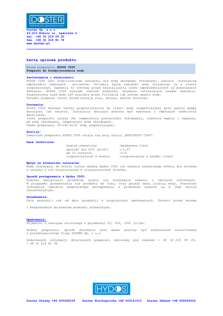 Doster Sp. z o.o. 43-210 Kobiór ul. Leśników 5 tel. +48 32 219 09 20 fax. +48 32 218 81 78 www.doster.pl __________________________________________________________________________ karta opisowa produktu Nazwa preparatu: HYDOS C500 Preparat do kondycjonowania wody Zastosowanie i właściwości: HYDOS C500 jest stabilizatorem twardości dla wody obiegowej chłodzącej. Zawiera mieszaninę odpowiednio dobranych polimerów. Polimery łączą twardość wody utrzymując ją w stanie rozpuszczonym. Zapewnia to ochronę przed krystalizacją jonów odpowiedzialnych za powstawanie kamienia. HYDOS C500 posiada również własności usuwania istniejących osadów kamienia. Rozpuszczony osad może być usunięty przez filtrację lub system upustu wody. Ponadto preparat chroni przed korozją stal, żelazo, metale kolorowe. Dozowanie: HYDOS C500 dozować należy proporcjonalnie do ilości wody uzupełniającej przy pomocy pompy dozującej lub ręcznie. Instalacja dozująca powinna być wykonana z odpornych chemicznie materiałów. Ilość preparatu zależy od: temperatury powierzchni chłodzącej, stężenia wapnia i magnezu, pH wody chłodzącej, temperatury wody chłodzącej. Dawka preparatu: 20-100 ml/m3 wody uzupełniającej. Analizy: Zawartość preparatu HYDOS C500 ustala się przy użyciu „MINITESTU C500”. Dane techniczne: wygląd zewnętrzny gęstość dla 25°C (g/cm3) pH 1% roztworu rozpuszczalność w wodzie :bezbarwna ciecz :~1,07 :2-4 :rozpuszczalny w każdej ilości Wpływ na środowisko naturalne: Woda chłodząca, do której został dodany Hydos C500 nie wywiera szkodliwego efektu dla ścieków w związku z ich oczyszczaniem w oczyszczalniach ścieków. Sposób postępowania z Hydos C500: Podczas manipulacji produktem zaleca się stosowanie rękawic i okularów ochronnych. W przypadku przedostania się produktu do oczu, oczy płukać dużą ilością wody. Pozostałe informacje odnośnie bezpiecznego postępowania z produktem zawarte są w jego karcie charakterystyki. Składowanie: Data ważności: rok od daty produkcji w oryginalnych opakowaniach. Chronić przed mrozem i bezpośrednim działaniem promieni słonecznych. Opakowania: Pojemniki z tworzywa sztucznego o pojemności 25, 200, 1000 litrów. Rodzaj preparatu, sposób dozowania oraz z przedstawicielem firmy DOSTER Sp. z o.o. Dodatkowych informacji + 48 32 218 81 78 dotyczących Doster Puławy +48 600260234 preparatu dawka powinny udzielamy być pod Doster Wielkopolska +48 609121013 każdorazowo numerem + 48 konsultowane 32 219 09 20, Doster Gdańsk +48 608583526
