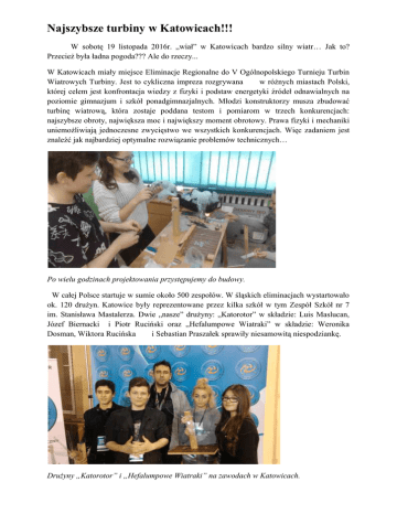 Najszybsze turbiny w Katowicach!!! W sobotę 19 listopada 2016r. „wiał” w Katowicach bardzo silny wiatr… Jak to? Przecież była ładna pogoda??? Ale do rzeczy... W Katowicach miały miejsce Eliminacje Regionalne do V Ogólnopolskiego Turnieju Turbin Wiatrowych Turbiny. Jest to cykliczna impreza rozgrywana w różnych miastach Polski, której celem jest konfrontacja wiedzy z fizyki i podstaw energetyki źródeł odnawialnych na poziomie gimnazjum i szkół ponadgimnazjalnych. Młodzi konstruktorzy musza zbudować turbinę wiatrową, która zostaje poddana testom i pomiarom w trzech konkurencjach: najszybsze obroty, największa moc i największy moment obrotowy. Prawa fizyki i mechaniki uniemożliwiają jednoczesne zwycięstwo we wszystkich konkurencjach. Więc zadaniem jest znaleźć jak najbardziej optymalne rozwiązanie problemów technicznych… Po wielu godzinach projektowania przystępujemy do budowy. W całej Polsce startuje w sumie około 500 zespołów. W śląskich eliminacjach wystartowało ok. 120 drużyn. Katowice były reprezentowane przez kilka szkół w tym Zespół Szkół nr 7 im. Stanisława Mastalerza. Dwie „nasze” drużyny: „Katorotor” w składzie: Luis Maslucan, Józef Biernacki i Piotr Ruciński oraz „Hefalumpowe Wiatraki” w składzie: Weronika Dosman, Wiktora Rucińska i Sebastian Praszałek sprawiły niesamowitą niespodziankę. Drużyny „Katorotor” i „Hefalumpowe Wiatraki” na zawodach w Katowicach. „W konkurencji „największa prędkość obrotowa” nasze maszyny wykręciły ponad 520 obrotów na minutę generując przy tym całkiem przyzwoite 20 wat mocy. Wynik jest tym bardziej niesamowity ponieważ byliśmy debiutantami nie znającymi możliwości konkurencji… Uczniowie bardzo starannie przygotowywali projekty i włożyli mnóstwo swojego czasu w prace. Wykonywali to w czasie zajęć pozalekcyjnych. To bardzo dobrze o nich świadczy. Dają wspaniały przykład swoim kolegom i koleżankom” - mówi opiekun drużyn mgr inż. Roman Brzeziak. Pomiary na specjalnym stanowisku – „Katorotor”. Pomiary na specjalnym stanowisku – „Hefalumpowe wiatraki”. Warto spojrzeć na tabelę i prześledzić historię wyników z ostatnich pięciu lat na stronie http://turniejmaszyn.pl/wiatrowe/. Widać, że w imprezie startowały bardzo doświadczone zespoły z dopracowanymi konstrukcjami. A jednak… „Nasi” zaskoczyli konkurencję i „zawiali jak mogli”. W ogólnej klasyfikacji zajęli wysokie 13 i 15 miejsce – najlepsze z katowickich szkół. Oto tabela wyników – NAJWIĘKSZE OBROTY: GRATULUJEMY! Brawo dla naszych młodych konstruktorów. I jeszcze jedno – drużyny zapowiedziały kolejne starty w innych konkursach technicznych. P.S. Zapraszamy na zajęcia „Kółka technicznego” w czwartki o 14.55 do sali nr 18