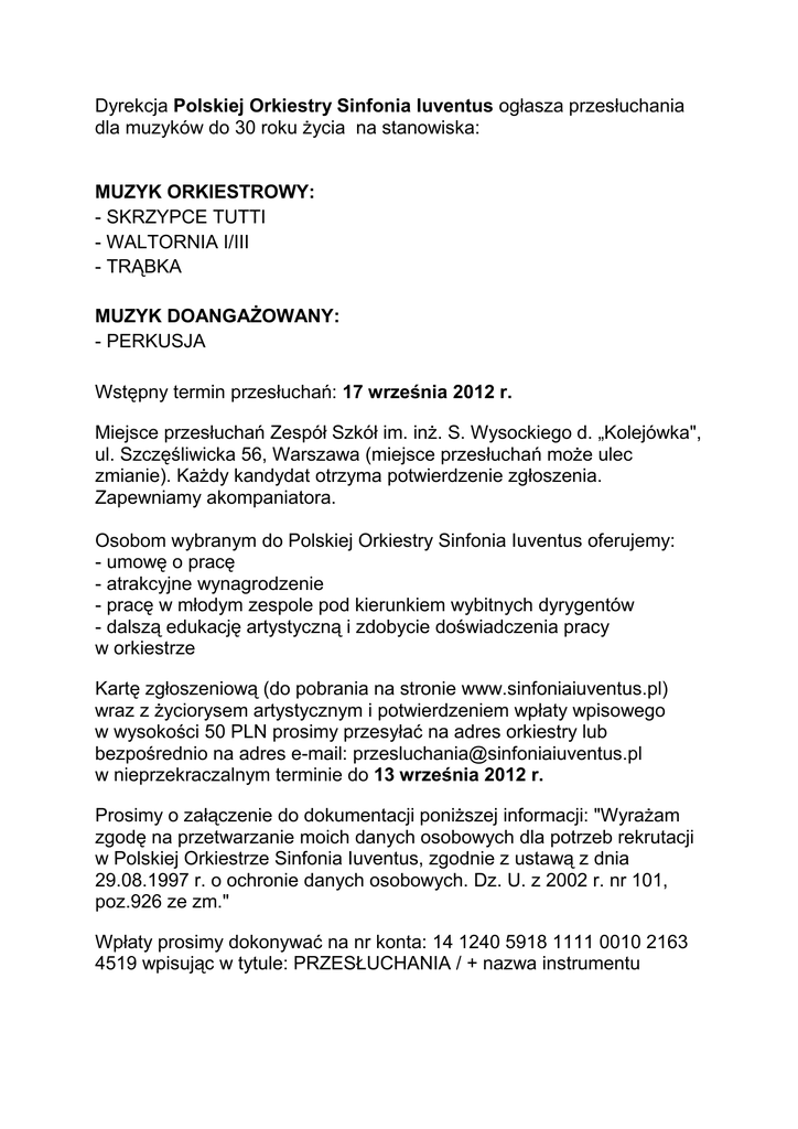 Dyrekcja Polskiej Orkiestry Sinfonia Iuventus ogłasza przesłuchania dla muzyków do 30 roku życia na stanowiska: MUZYK ORKIESTROWY: - SKRZYPCE TUTTI - WALTORNIA I/III - TRĄBKA MUZYK DOANGAŻOWANY: - PERKUSJA Wstępny termin przesłuchań: 17 września 2012 r. Miejsce przesłuchań Zespół Szkół im. inż. S. Wysockiego d. „Kolejówka", ul. Szczęśliwicka 56, Warszawa (miejsce przesłuchań może ulec zmianie). Każdy kandydat otrzyma potwierdzenie zgłoszenia. Zapewniamy akompaniatora. Osobom wybranym do Polskiej Orkiestry Sinfonia Iuventus oferujemy: - umowę o pracę - atrakcyjne wynagrodzenie - pracę w młodym zespole pod kierunkiem wybitnych dyrygentów - dalszą edukację artystyczną i zdobycie doświadczenia pracy w orkiestrze Kartę zgłoszeniową (do pobrania na stronie www.sinfoniaiuventus.pl) wraz z życiorysem artystycznym i potwierdzeniem wpłaty wpisowego w wysokości 50 PLN prosimy przesyłać na adres orkiestry lub bezpośrednio na adres e-mail: [email protected] w nieprzekraczalnym terminie do 13 września 2012 r. Prosimy o załączenie do dokumentacji poniższej informacji: "Wyrażam zgodę na przetwarzanie moich danych osobowych dla potrzeb rekrutacji w Polskiej Orkiestrze Sinfonia Iuventus, zgodnie z ustawą z dnia 29.08.1997 r. o ochronie danych osobowych. Dz. U. z 2002 r. nr 101, poz.926 ze zm." Wpłaty prosimy dokonywać na nr konta: 14 1240 5918 1111 0010 2163 4519 wpisując w tytule: PRZESŁUCHANIA / + nazwa instrumentu PROGRAM PRZESŁUCHAŃ SKRZYPCE TUTTI Utwory obowiązkowe: − J. S. Bach – 2 kontrastujące części z dowolnej sonaty lub suity − W. A. Mozart – I część koncertu A-dur lub D-dur z kadencją − utwór dowolny Literatura orkiestrowa: − R. Schumann – Scherzo z II Symfonii C-dur op. 61 − S. Prokofiew –I Suita Romeo i Julia (Śmierć Tybalta) − W. A. Mozart – Symfonia Es-dur nr 39 KV 543 (Finał) − R. Strauss – Poemat symfoniczny Don Juan PROGRAM PRZESŁUCHAŃ I i III WALTORNIA Utwory obowiązkowe: − W. A. Mozart – Koncert nr 2 Es-dur (I część) lub Koncert nr 4 Es-dur (I część z kadencją) − R. Strauss – Koncert nr 1 Es-dur (I część) Literatura orkiestrowa: [wybrane fragmenty ] − L. van Beethoven – VI Symfonia F-dur op. 68 Pastoralna, VII Symfonia A-dur op. 72 − J. Brahms– I Symfonia c-moll op. 68, III Symfonia F-dur op. 90 − P. Czajkowski – IV Symfonia f-moll op. 36, V Symfonia e-moll op. 64 − G. Mahler– I Symfonia D-dur Tytan − W. A. Mozart – Symfonia g- moll nr 40 KV 550 − G. Rossini – Uwertura do opery Cyrulik Sewilski, Uwertura do opery Sroka Złodziejka − R. Strauss – Poemat symfoniczny Don Juan, Poemat symfoniczny Dyl Sowizdrzał − I. Strawiński – Święto Wiosny , Ognisty Ptak − D. Szostakowicz– V Symfonia d-moll op. 47 PROGRAM PRZESŁUCHAŃ PERKUSJA Utwory obowiązkowe: KOTŁY - G. Frog – Seven Solo Dances (cz. II), Menuet (cz. IV) - Rock Stock lub S. Fink – Timpani Suite – Sarabanda i Gigue WERBEL – B. Lylloff - Arhus Etiuda nr 9 KSYLOFON – F. Mendelssohn-Bartholdy – „Sen Nocy Letniej” (Scherzo opr. Torrebruno) WIBRAFON LUB MARIMBA instrument do wyboru – WIBRAFON - J. S. Bach - Sarabanda z I lub II Partity na skrzypce solo MARIMBA - C. O. Musser – Etiuda C-dur lub “Preludio” nr 1 e-moll Literatura orkiestrowa: KOTŁY - L. van Beethoven - I Symfonia (cz. III) , IX Symfonia - J. Brahms - I Symfonia c-moll op. 68 (cz. IV) - I. Strawiński – „Święto Wiosny” - C. Orff – Carmina Burana - B. Bartók – Muzyka na smyczki, perkusję i czelestę - P. Czajkowski - IV Symfonia f-moll op. 36 (cz. I ), V Symfonia e-moll op. 64 (cz. I) WERBEL - F. von Suppe - Uwertura „Dama Pikowa” - S. Prokofiew – „Piotruś i wilk” (Porucznik Kije) - M. Ravel – „Bolero” - M. Rimski-Korsakow – „Szecherezada” KSYLOFON - G. Gershwin – “Porgy and Bess” (Introdukcja) - Z. Kodaly – Suita “Hary Janos” (cz. VI) - D. Szostakowicz – Polka z baletu „Złoty Wiek” - D. Kabalewski – Colas Breugnon WIBRAFON - L. Bernstein –“West Side Story”- Cool DZWONKI - P. Dukas – „Uczeń czarnoksiężnika” - O. Respighi – „Pinie rzymskie” - L. Delibes – „Lakmé” TAMBURYN - G. Bizet – opera „Carmen”, Pieśń cygańska (wstęp do IV aktu) TALERZE I BĘBEN - P. Czajkowski - IV Symfonia f-moll op. 36 (Finał), „Romeo i Julia” (Uwertura) - M. Musorgski – „Noc na Łysej Górze” TRĄBKA Utwór obowiązkowy: - J. Haydn – Koncert na trąbkę Es-dur, część I i II (bez kadencji) (na B trąbce) - A. Honegger - „Intrada” (na trąbce C lub B) Literatura orkiestrowa: - L. van Beethoven – „Leonora” II i III (sygnały) - M. Musorgski – „Obrazki z wystawy”: Promenade, Samuel Goldenberg i Szmul - M. Ravel –Koncert fortepianowy G-dur (część I i III) - G. Mahler - V Symfonia (I część) - I. Strawiński - „Pietruszka” (solo szybkie i wolne) Polska Orkiestra Sinfonia Iuventus Pl. Defilad 1, lok. 701 00-901 Warszawa tel. 022 656 76 56 tel.kom. +48 0 662 590 724 fax. 022 656 65 45 e-mail: [email protected] www.sinfoniaiuventus.pl