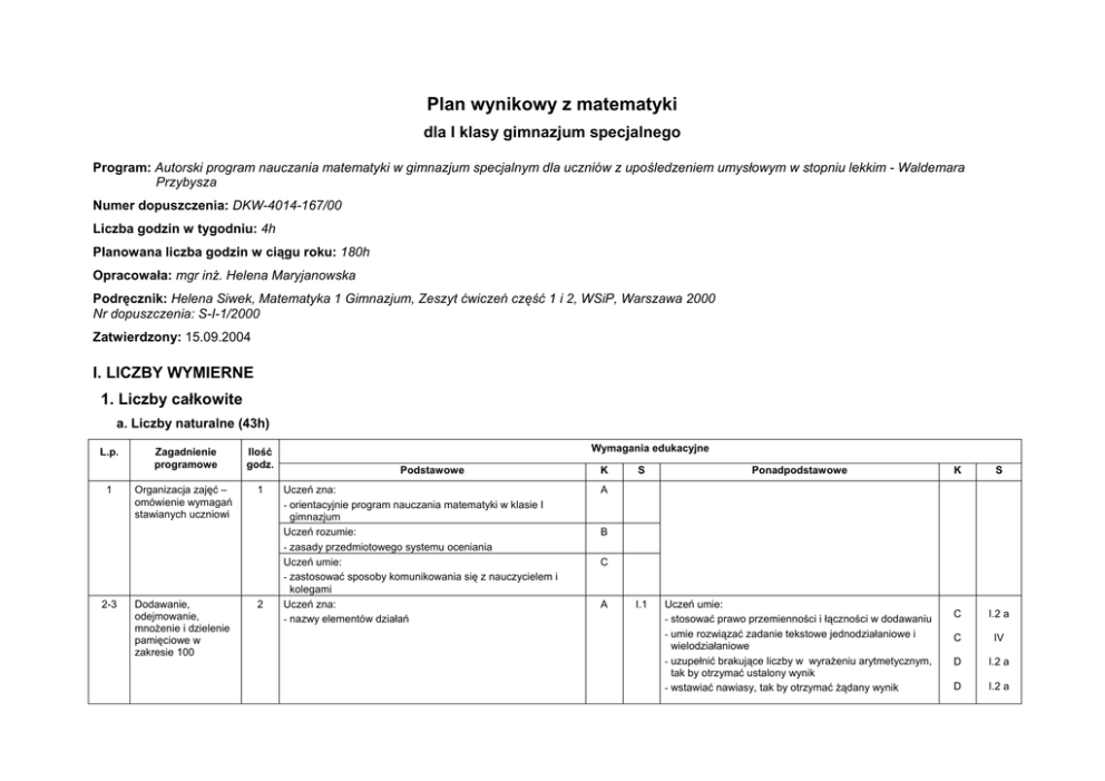Plan wynikowy z matematyki dla I klasy gimnazjum specjalnego Program: Autorski program nauczania matematyki w gimnazjum specjalnym dla uczniów z upośledzeniem umysłowym w stopniu lekkim - Waldemara Przybysza Numer dopuszczenia: DKW-4014-167/00 Liczba godzin w tygodniu: 4h Planowana liczba godzin w ciągu roku: 180h Opracowała: mgr inż. Helena Maryjanowska Podręcznik: Helena Siwek, Matematyka 1 Gimnazjum, Zeszyt ćwiczeń część 1 i 2, WSiP, Warszawa 2000 Nr dopuszczenia: S-I-1/2000 Zatwierdzony: 15.09.2004 I. LICZBY WYMIERNE 1. Liczby całkowite a. Liczby naturalne (43h) L.p. 1 2-3 Zagadnienie programowe Ilość godz. Organizacja zajęć – omówienie wymagań stawianych uczniowi 1 Dodawanie, odejmowanie, mnożenie i dzielenie pamięciowe w zakresie 100 2 Wymagania edukacyjne Podstawowe Uczeń zna: - orientacyjnie program nauczania matematyki w klasie I gimnazjum Uczeń rozumie: - zasady przedmiotowego systemu oceniania Uczeń umie: - zastosować sposoby komunikowania się z nauczycielem i kolegami Uczeń zna: - nazwy elementów działań K S Ponadpodstawowe I.1 Uczeń umie: - stosować prawo przemienności i łączności w dodawaniu - umie rozwiązać zadanie tekstowe jednodziałaniowe i wielodziałaniowe - uzupełnić brakujące liczby w wyrażeniu arytmetycznym, tak by otrzymać ustalony wynik - wstawiać nawiasy, tak by otrzymać żądany wynik K S C I.2 a C IV D I.2 a D I.2 a A B C A 2 4-5 Porównywanie liczb naturalnych 2 6-7 Porównywanie różnicowe i ilorazowe 2 8-11 Kolejność wykonywania działań 4 Uczeń rozumie: - rolę liczb 0 i 1 w mnożeniu i dzieleniu - rolę liczb 0 i 1 w dodawaniu i odejmowaniu B I.1 Uczeń umie: - pamięciowo dodawać i odejmować liczby w zakresie 100 - pamięciowo mnożyć liczby dwucyfrowe przez jednocyfrowe w zakresie 100 - pamięciowo dzielić liczby dwucyfrowe przez jednocyfrowe w zakresie 100 - posługiwać się liczbą 0 w dodawaniu i odejmowaniu - posługiwać się liczbą 0 w mnożeniu i dzieleniu - dopełniać składniki do określonej sumy - obliczać odjemną (odjemnik), gdy dane są różnica i odjemnik (odjemna) - obliczać dzielną (dzielnik), gdy dane są iloraz i dzielnik (dzielna) Uczeń zna: - pojęcie cyfry Uczeń rozumie: - różnicę pomiędzy cyfrą a liczbą - pojęcie osi liczbowej - zależność wartości liczby od położenia jej cyfr Uczeń umie: - porównywać liczby - przedstawiać liczby na osi liczbowej - porządkować liczby na osi liczbowej w kolejności od najmniejszej do największej lub odwrotnie. Uczeń rozumie: - porównywanie ilorazowe: ile razy więcej? ile razy mniej? - porównywanie różnicowe: o ile więcej? o ile mniej? C I.2 A III.2 B III.2 Uczeń zna: - kolejność wykonywania działań gdy nie występują nawiasy - kolejność wykonywania działań gdy występują nawiasy Uczeń umie: - zastosować zasady kolejności wykonywania działań - obliczać wyrażenia arytmetyczne zawierające kilka działań Uczeń umie: - podać liczbę największą i najmniejszą w zbiorze skończonym - tworzyć liczby przez dopisywanie do danej liczby cyfr na początku i na końcu oraz porównywać utworzoną liczbę z daną - ilustrować przykłady dodawania i odejmowania liczb naturalnych na osi liczbowej C I.2 B II.2 Uczeń umie: - rozwiązywać zadania tekstowe dotyczące porównań różnicowych i ilorazowych A I.1 C I.2 Uczeń umie: - ujmować rozwiązania zadań w jednym zapisie - wstawić nawiasy i znaki działań tak, aby otrzymać dany wynik - rozwiązywać zadania tekstowe z zastosowaniem zasad kolejności wykonywania działań D III.1 D IV.5 C IV.4 C I.2 C, D I.2, IV 3 12-13 14-15 16-19 20-23 24-25 Dziesiątkowy system pozycyjny Potęga o wykładniku naturalnym Dodawanie i odejmowanie liczb naturalnych sposobem pisemnym Mnożenie i dzielenie liczb naturalnych sposobem pisemnym Dzielenie z resztą. 2 2 4 4 2 Uczeń rozumie: - system dziesiątkowy i pozycyjny, nazywanie i wskazywanie rzędów (wyjaśnienie znaczenia tych terminów) - odczytywanie cyfr we wskazanych rzędach, pisanie liczb o danych cyfrach we wskazanych rzędach - zapisywanie liczb w dziesiątkowym systemie pozycyjnym - czytanie liczb zapisanych w dziesiątkowym systemie pozycyjnym i pisanie ich słowami Uczeń zna: - pojęcie potęgi Uczeń rozumie: - związek potęgi z iloczynem Uczeń umie: - obliczyć kwadrat liczby naturalnej jednocyfrowej i dwucyfrowej - zapisać liczbę w postaci potęgi Uczeń zna: - nazwy argumentów działań - algorytm pisemnego dodawania i odejmowania Uczeń rozumie: - potrzebę stosowania działań pisemnych Uczeń umie: - dodawać i odejmować pisemnie bez przekroczenia progu dziesiątkowego - dodawać i odejmować pisemnie liczby z przekroczeniem kolejnych progów dziesiątkowych - rozwiązać zadanie tekstowe z zastosowaniem działań na liczbach naturalnych Uczeń zna: - nazwy argumentów działań - algorytm pisemnego mnożenia i dzielenia Uczeń rozumie: - potrzebę stosowania działań pisemnych Uczeń umie: - mnożyć i dzielić pisemnie liczby wielocyfrowe przez jednocyfrowe i dwucyfrowe - rozwiązać zadanie tekstowe z zastosowaniem działań na liczbach naturalnych Uczeń zna: - algorytm dzielenia z resztą przez liczbę jednocyfrową - algorytm dzielenia z resztą przez liczbę dwucyfrową Uczeń rozumie: - potrzebę posiadania umiejętności dzielenia z resztą B I.1 B II.1 B II.2 A I.1 B I.1 C I.2 A A I.1 III.1 B III.1 C III.2 C I.2 IV A A I.1 II.1 B III.1 C III.2 C I.2 A A B I.1 III.1 III.1 Uczeń umie: - rozwiązać zadanie tekstowe z potęgami Uczeń umie: - tworzyć wyrażenia arytmetyczne na podstawie treści zadań i obliczać wartości tych wyrażeń - rozwiązać zadanie tekstowe z zastosowaniem działań na liczbach naturalnych Uczeń umie: - tworzyć wyrażenia arytmetyczne na podstawie treści zadań i obliczać wartości tych wyrażeń - rozwiązać zadanie tekstowe z zastosowaniem działań na liczbach naturalnych Uczeń umie: - wykonać dzielenie przez liczby jednocyfrowe i dwuc